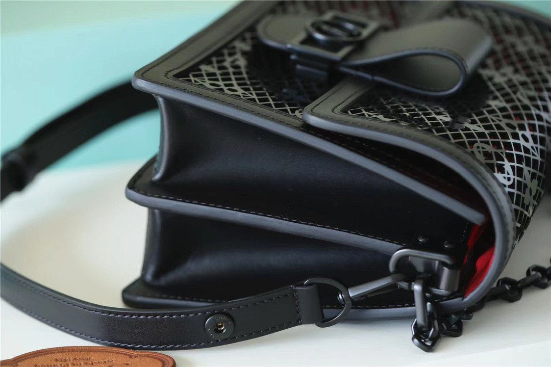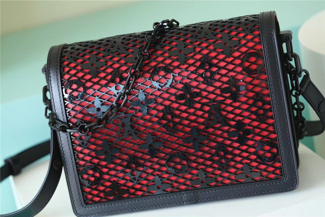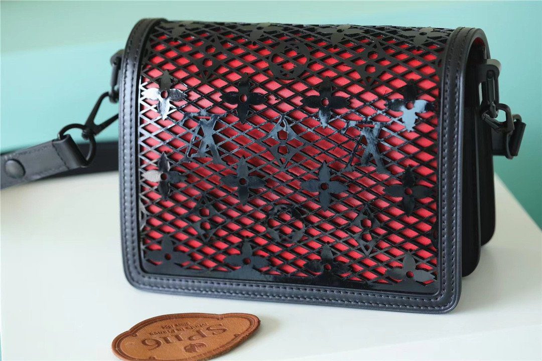 该手袋运用精准的切割工艺巧夺天工地打造出“Monogram Lace”(Monogram 蕾丝)效果——一种令人惊艳的镂空透视皮革设计。繁复精巧的黑色皮革镂空图案巧妙地透出内部鲜艳醒目的红色衬里,营造出大胆而迷人的立体视觉效果。包身配有引人注目的同色系哑光黑色 LV Circle 磁扣,并搭配一条风格前卫的同色链条,细节处理完美无瑕。为了满足多样的造型需求,该手袋特别设计了可拆卸的皮革肩带与金属链条,让您能够轻松实现单肩背或斜挎背戴。