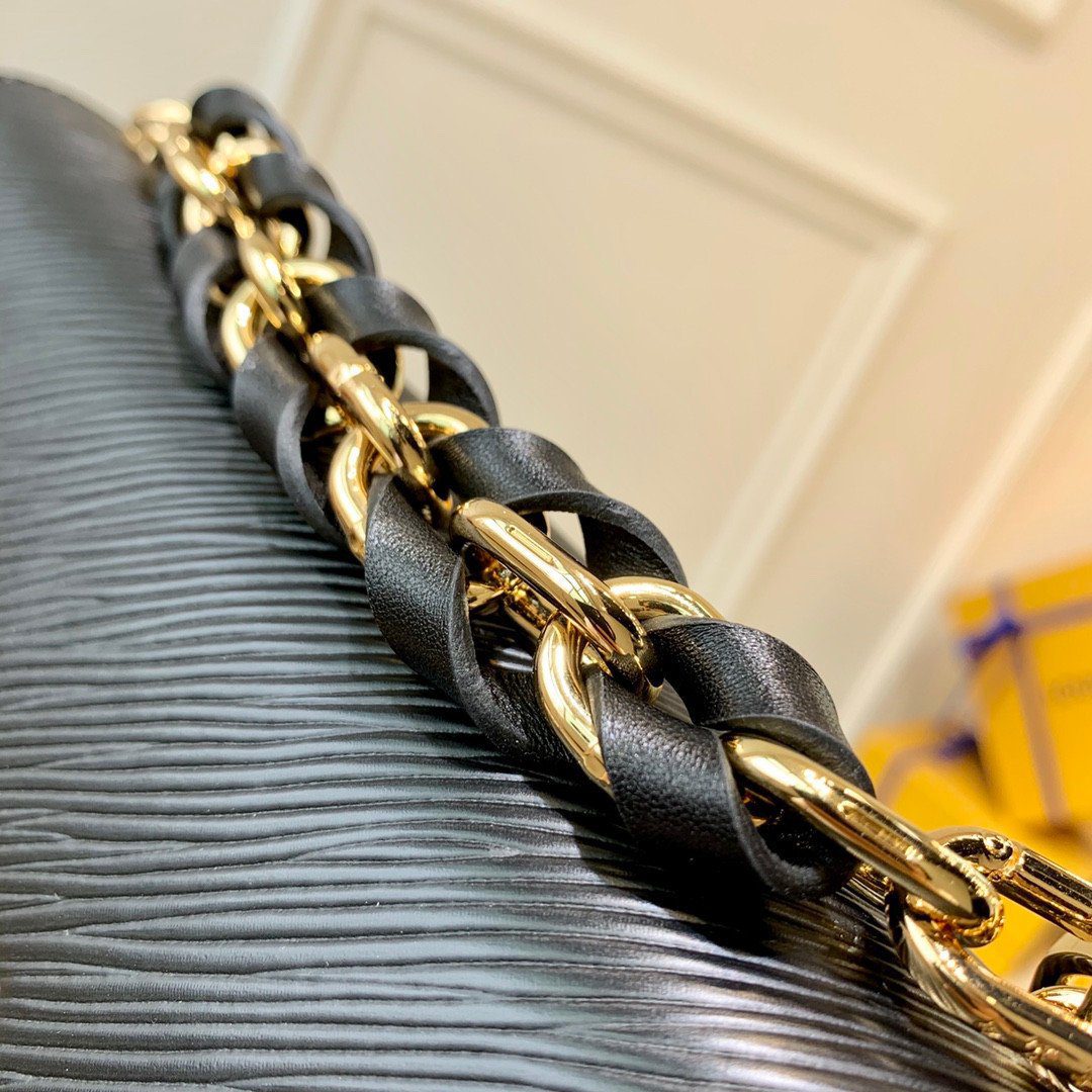 主要特色:雕塑感可旋转 LV Twist 锁扣,粗链条皮革编织金属链,可拆卸且完全可调节的皮革肩带。
