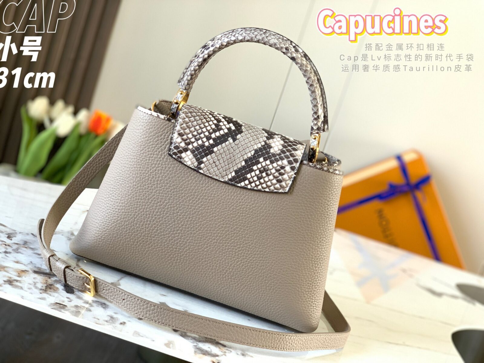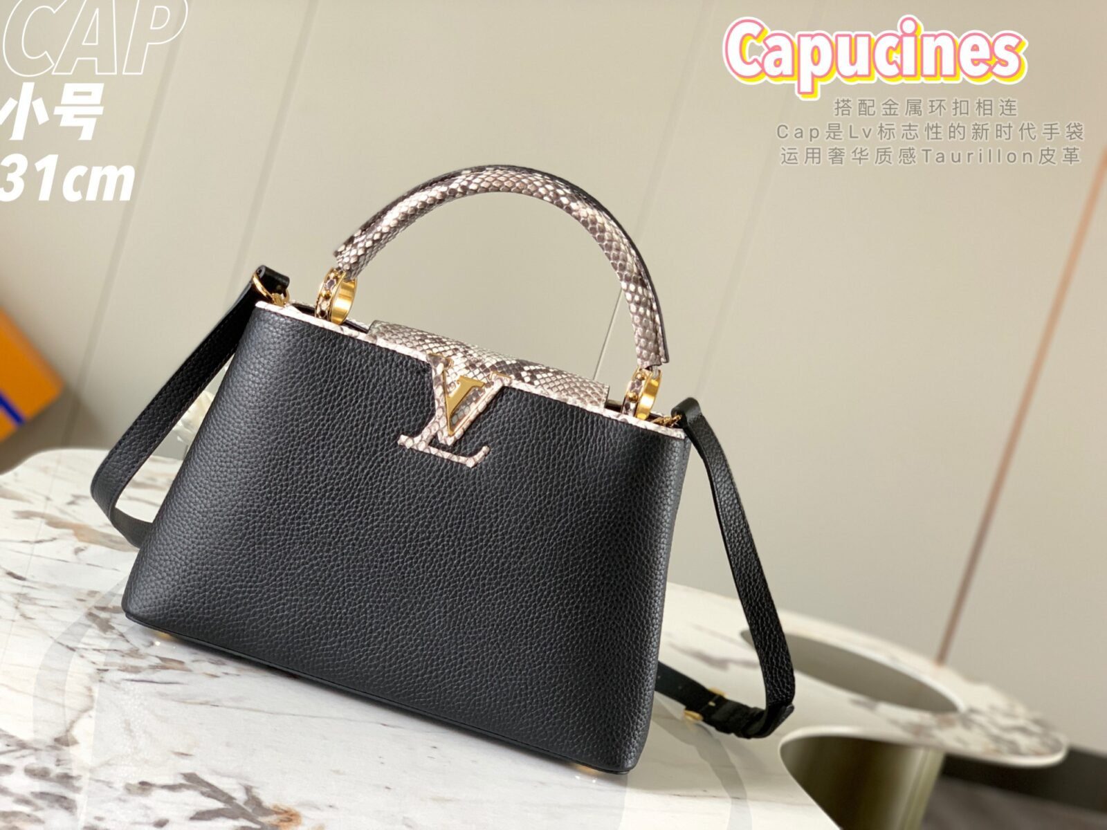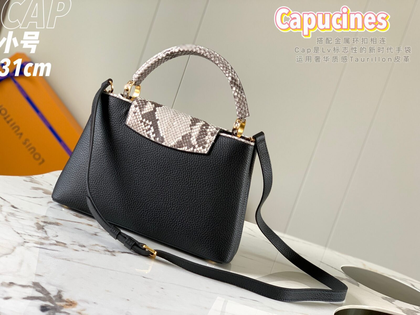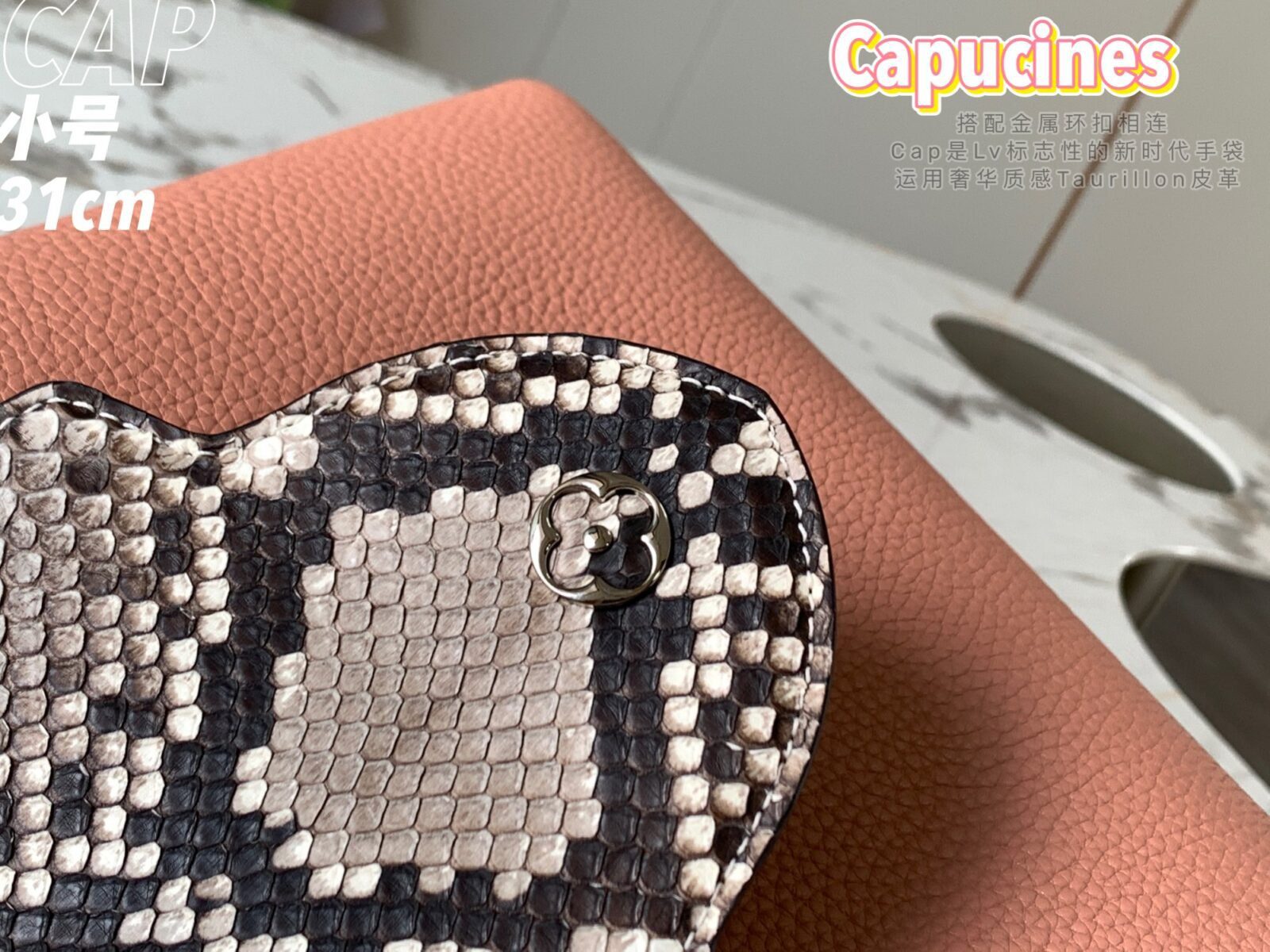 路易威登 Capucines 手袋得名于巴黎的卡普西纳街(Rue des Capucines)——即路易威登首家专卖店的所在地。作为一款永恒的经典杰作,它能为任何衣橱增添一抹深邃而优雅的格调。这款极尽奢华的特别版手袋,由工匠大师采用优质全粒面 Taurillon 牛皮(呈现出细腻丰富的荔枝纹理)精心打造,并巧妙融入了珍稀的大鳞纹蟒蛇皮细节,令其整体质感得到非凡升华。