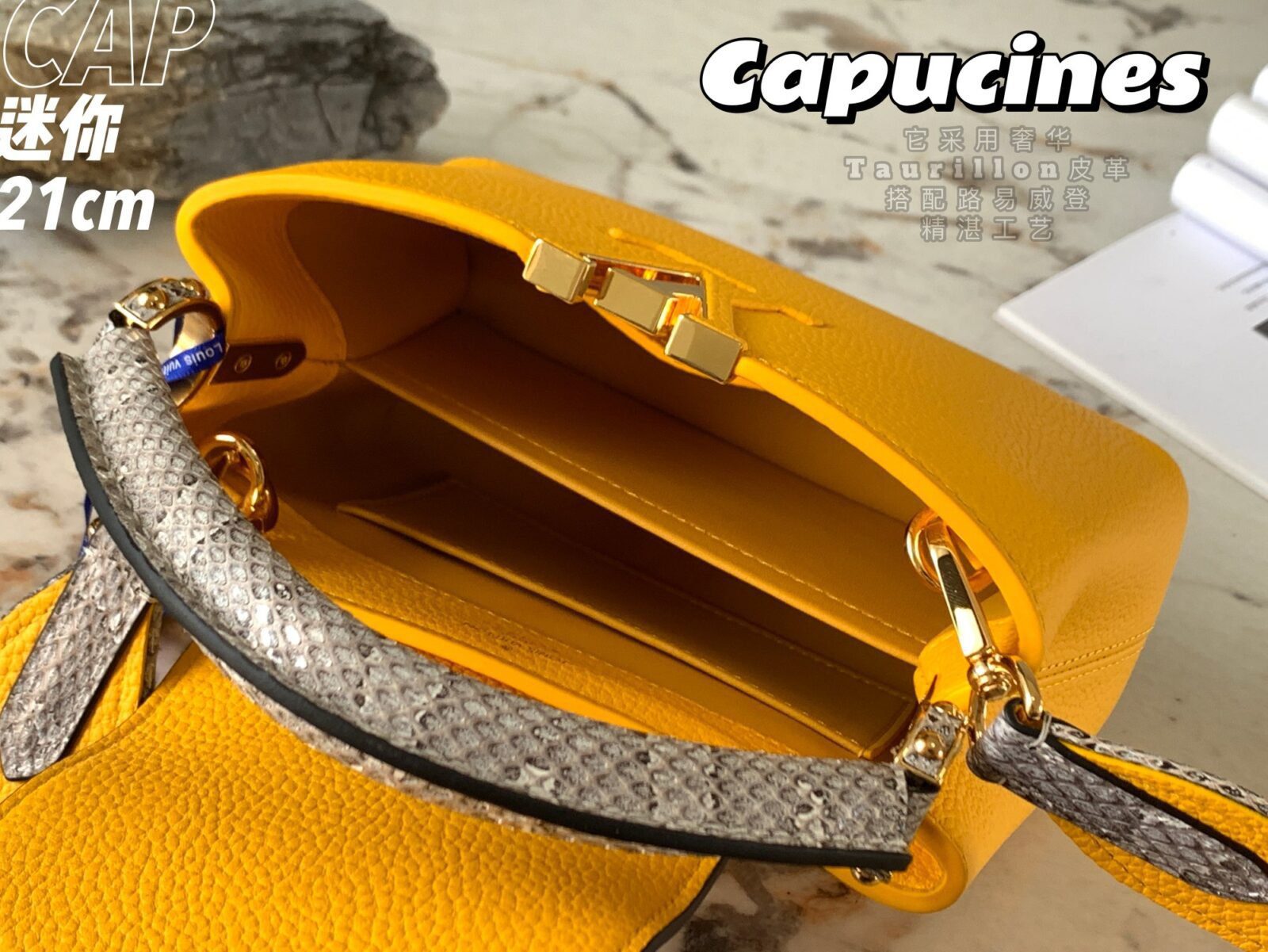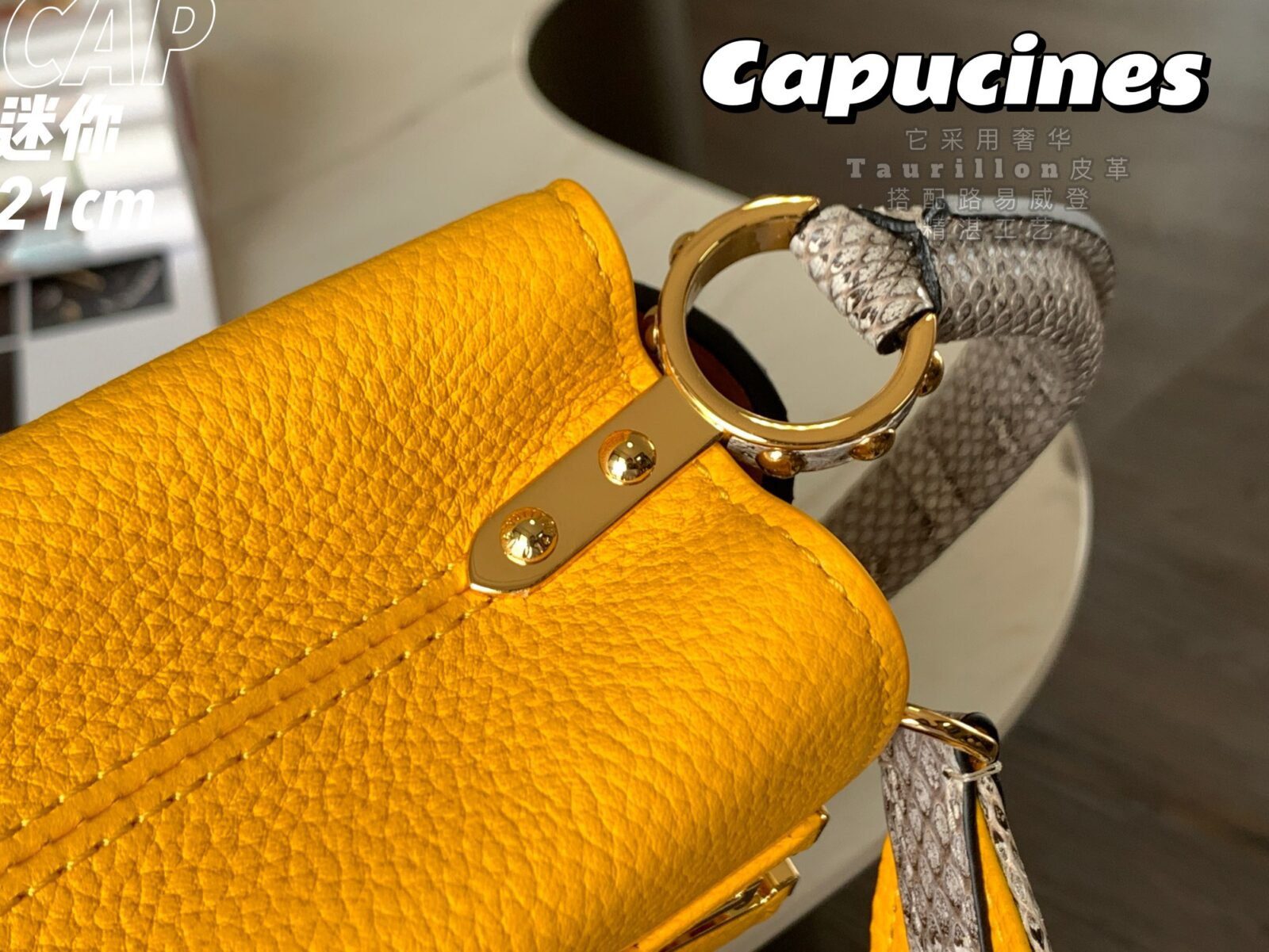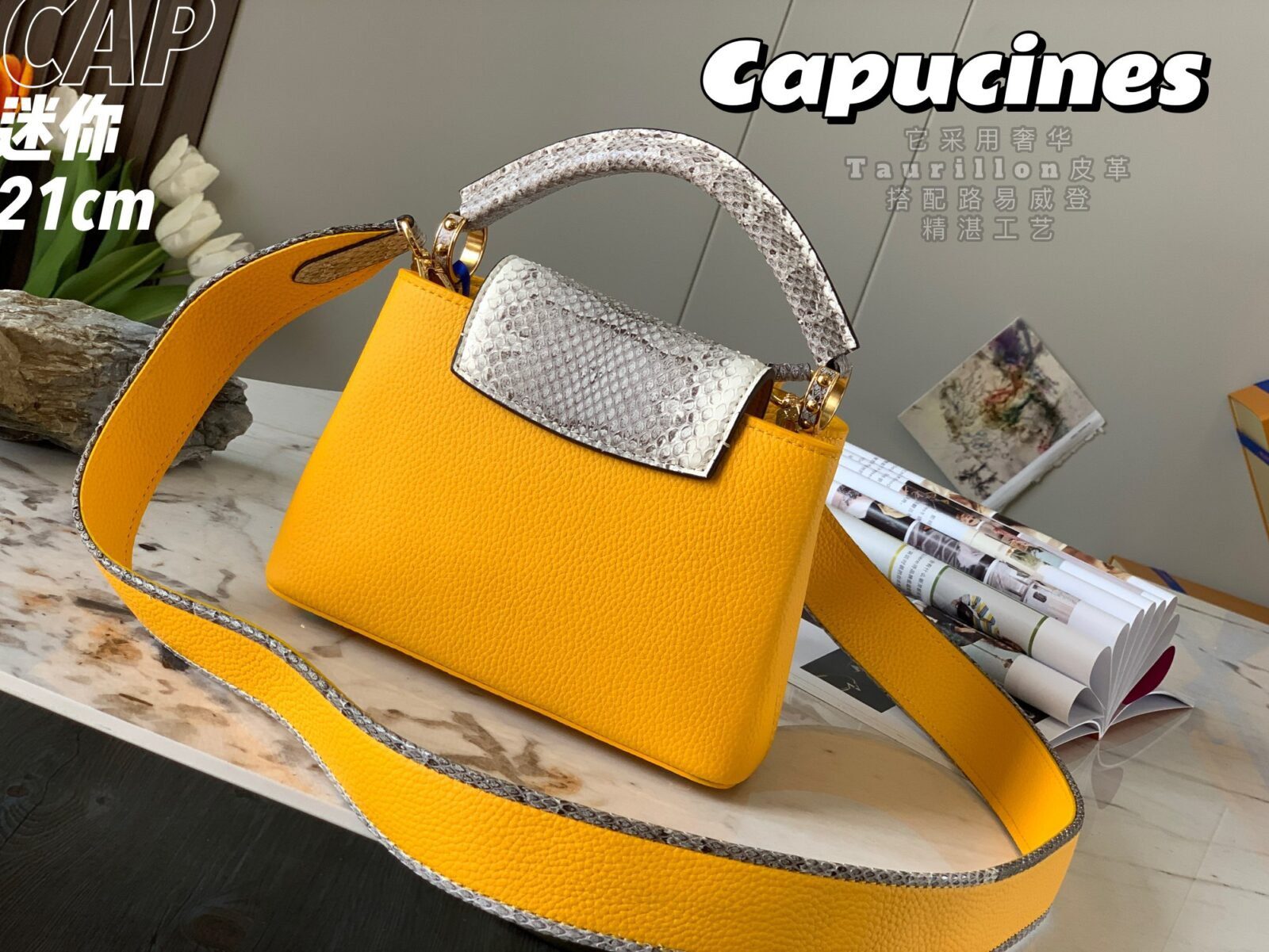 用这款精致非凡的 Louis Vuitton Capucines Mini 包袋,为您的收藏增添一抹卓尔不群的奢华风采。这款杰作由进口优质 Taurillon 牛皮精心打造,皮面呈现出细腻饱满的荔枝纹理;其独特的魅力更因醒目的珍稀蟒蛇皮细节装饰而得到升华。