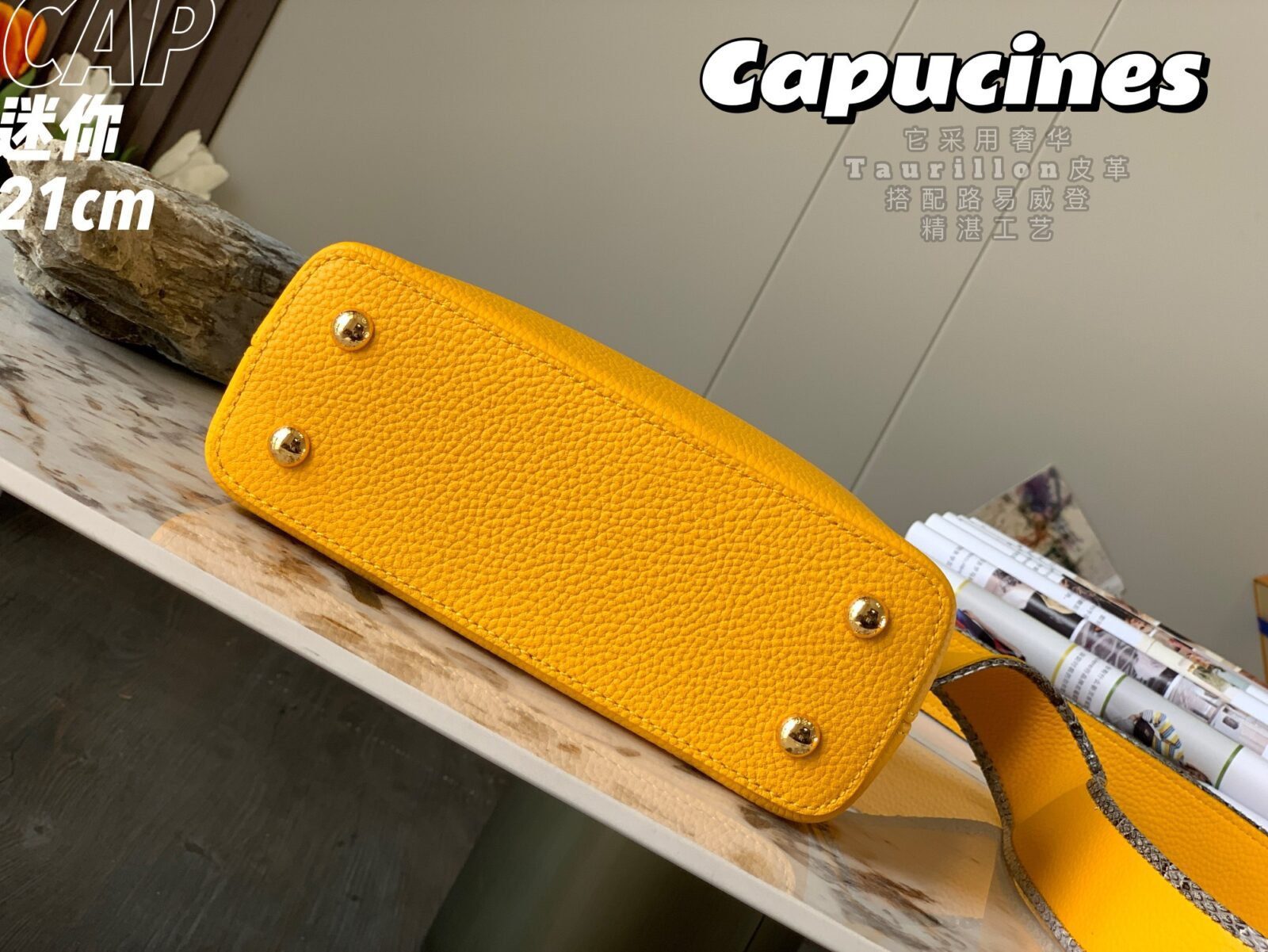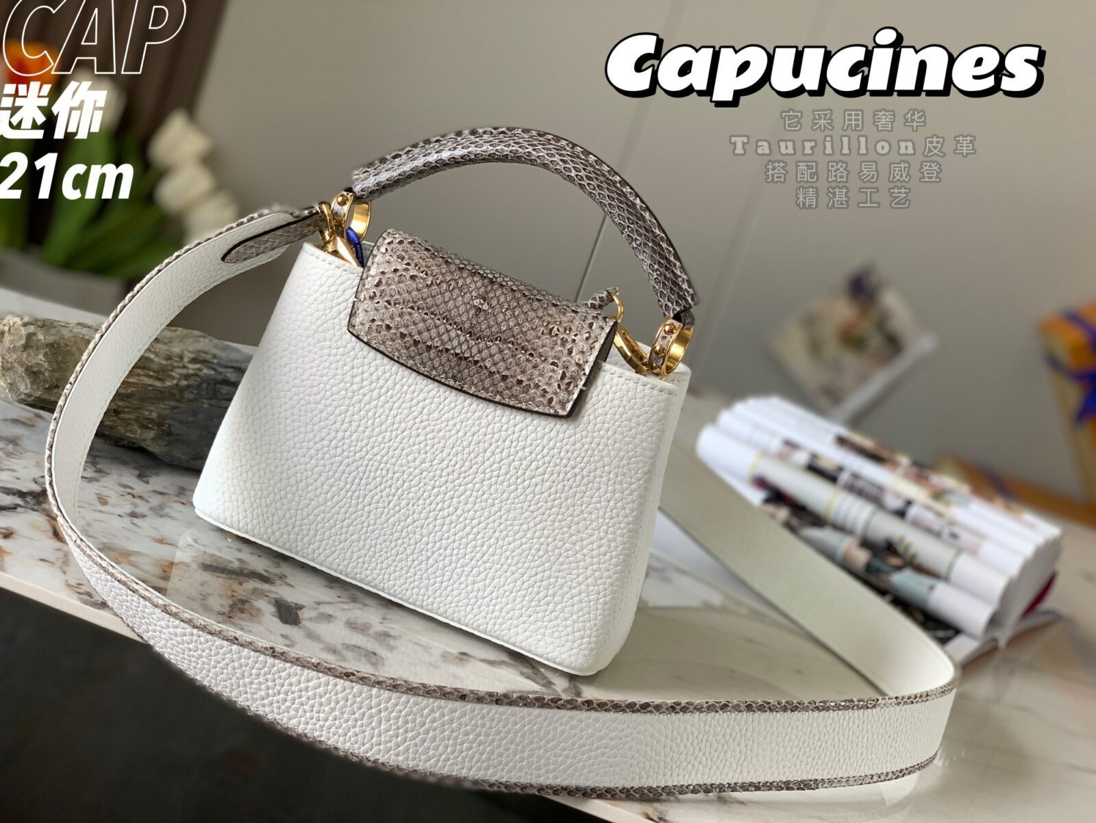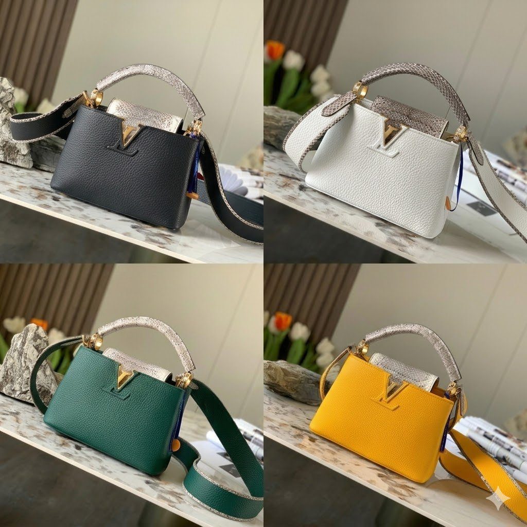 用这款精致非凡的 Louis Vuitton Capucines Mini 包袋,为您的收藏增添一抹卓尔不群的奢华风采。这款杰作由进口优质 Taurillon 牛皮精心打造,皮面呈现出细腻饱满的荔枝纹理;其独特的魅力更因醒目的珍稀蟒蛇皮细节装饰而得到升华。
