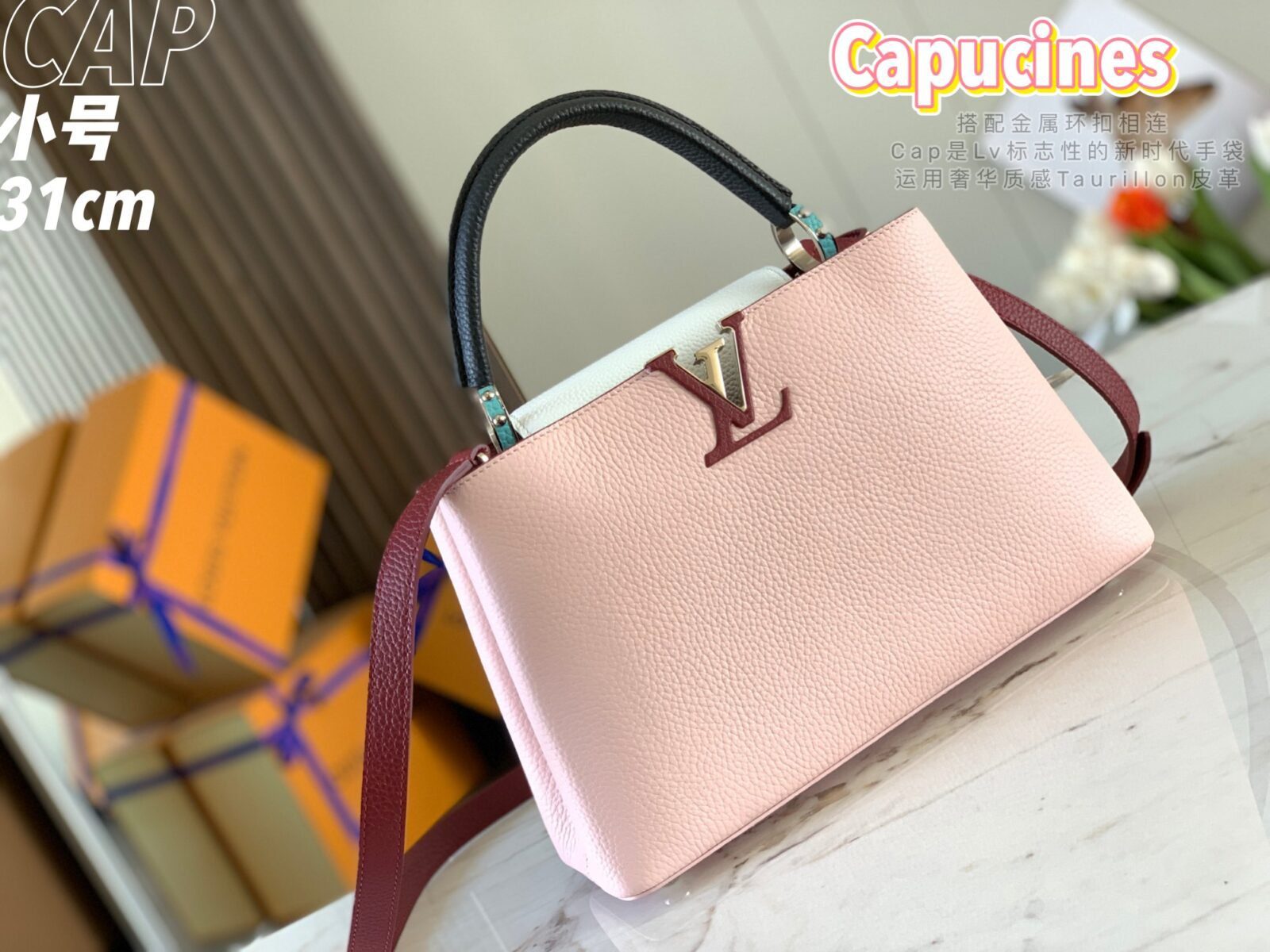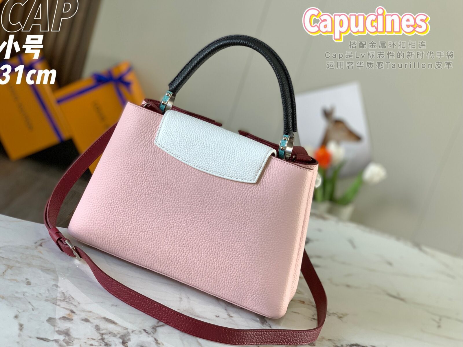现代感十足的“撞色柔粉色”:以黑色提手、纯白翻盖及酒红色 LV 标识形成鲜明对比,视觉效果惊艳。
