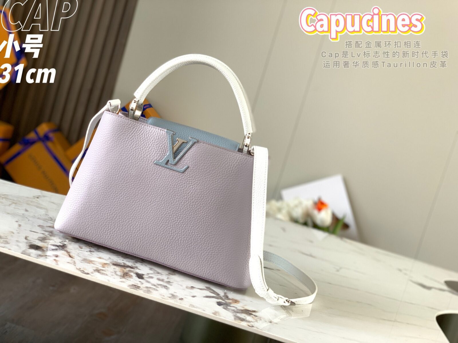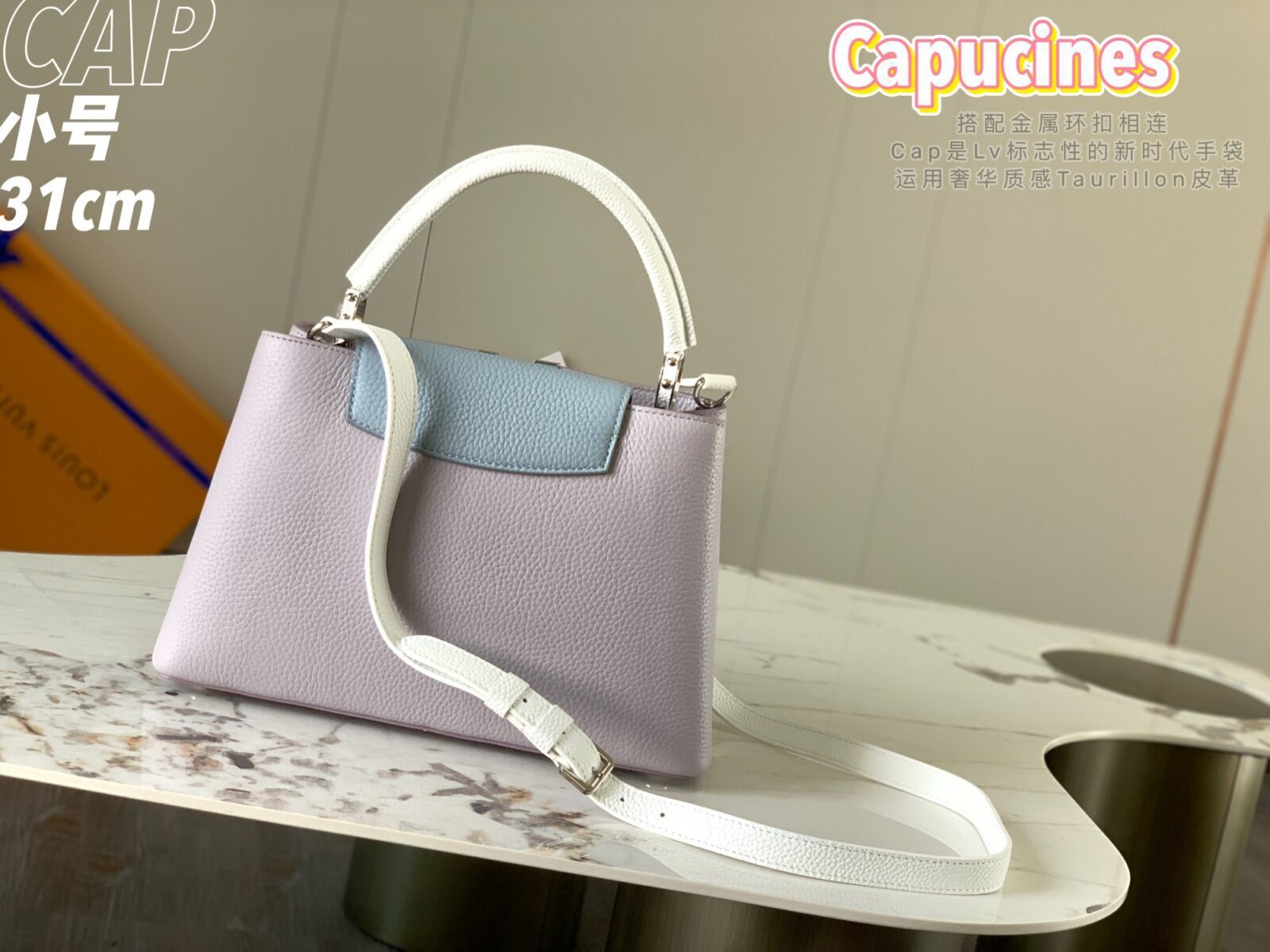 梦幻般的柔和色调“丁香紫/淡紫色”:搭配白色提手、淡蓝色翻盖以及同色系的柔和色调 LV 标识,尽显清新淡雅。