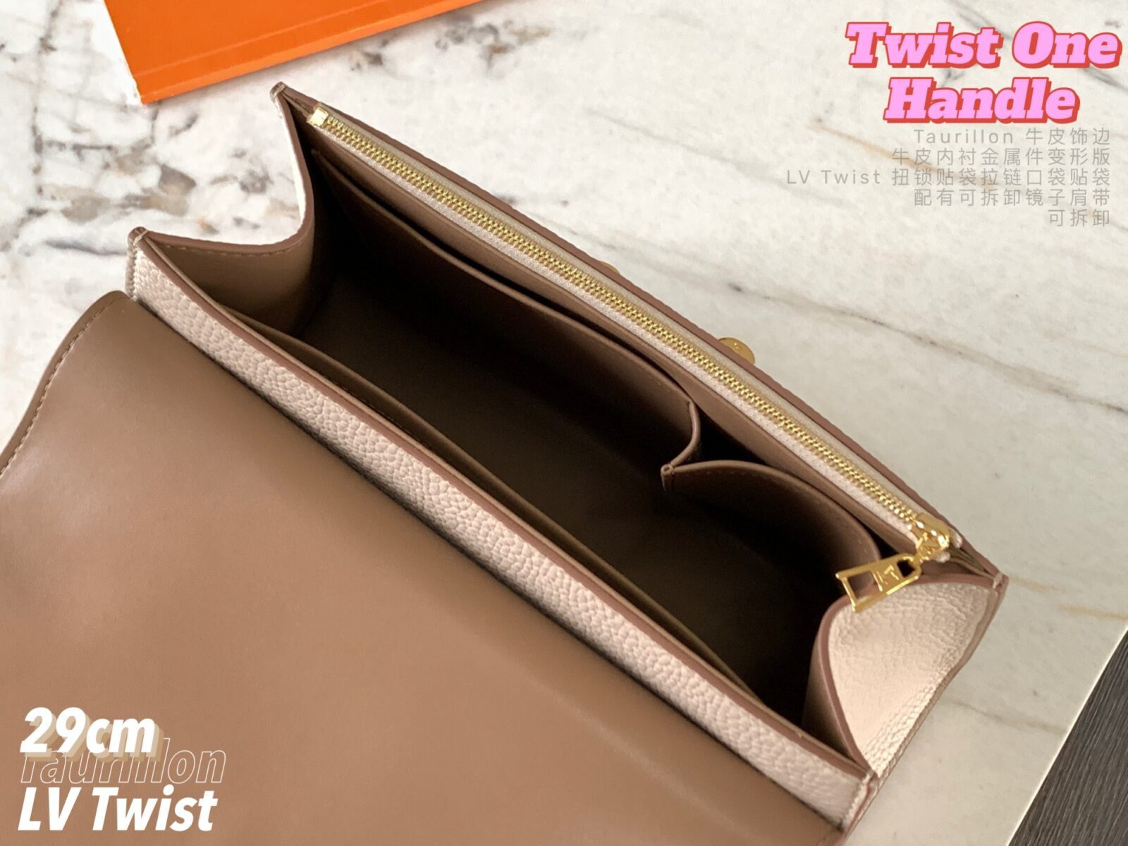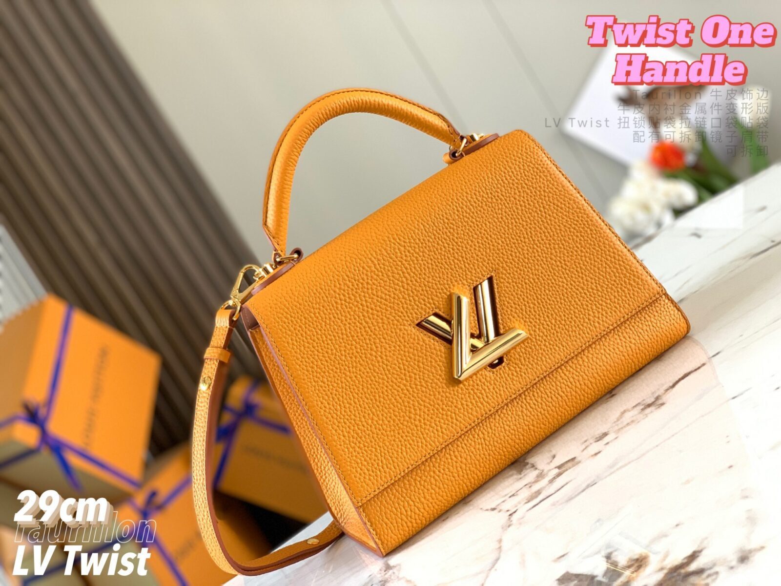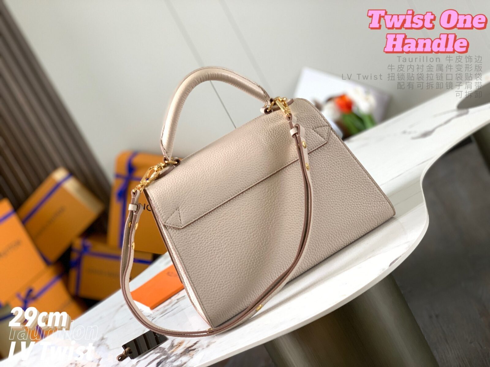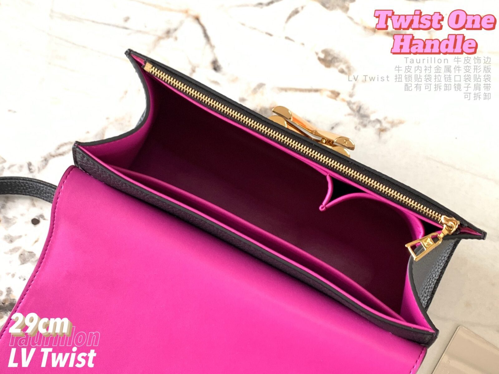 五金配件:金色金属饰件,配有标志性的可旋转 LV Twist 扭锁