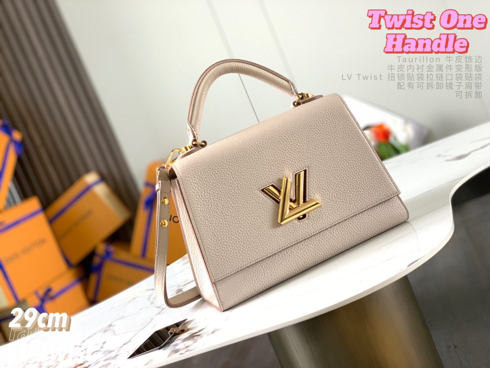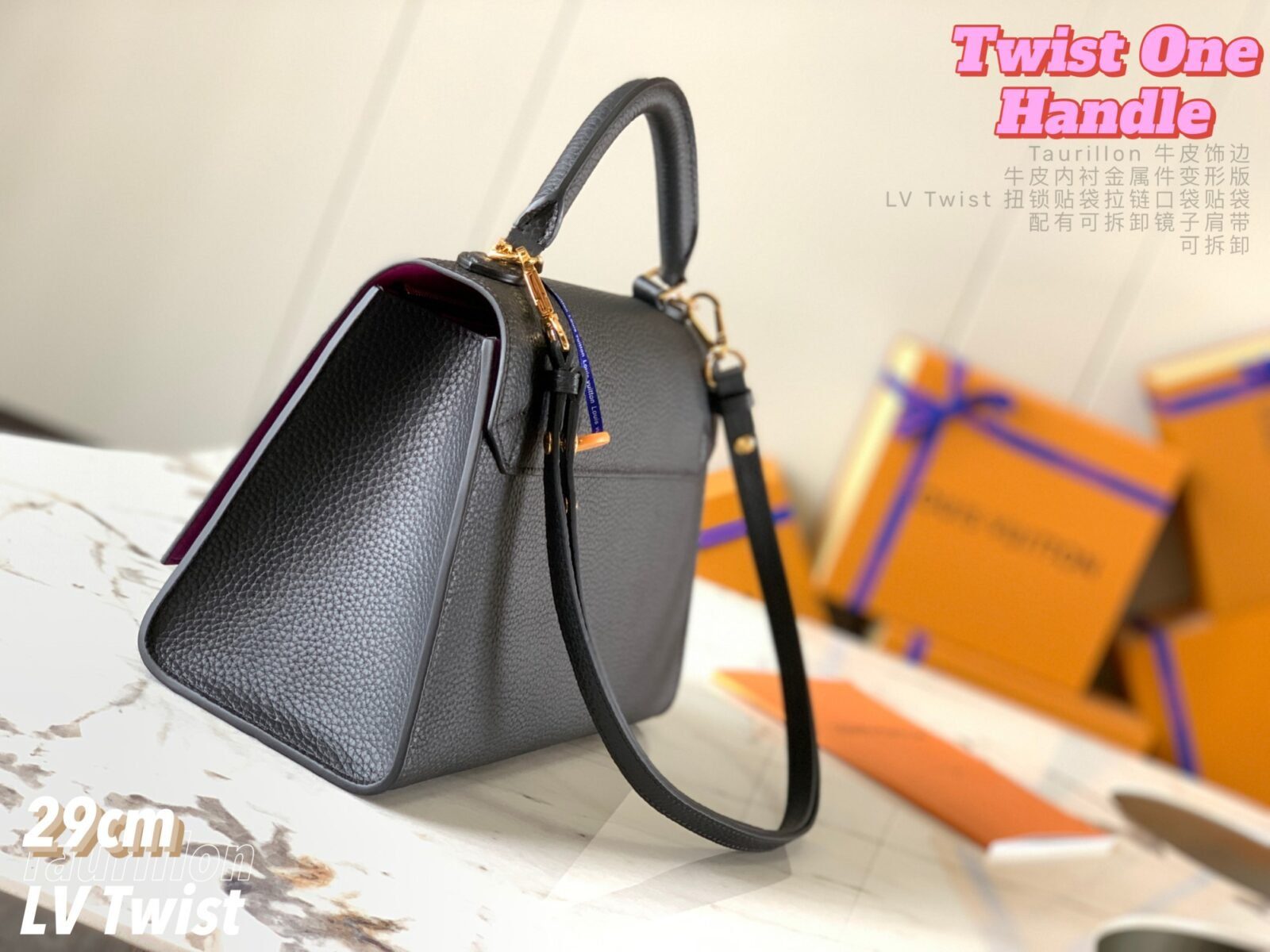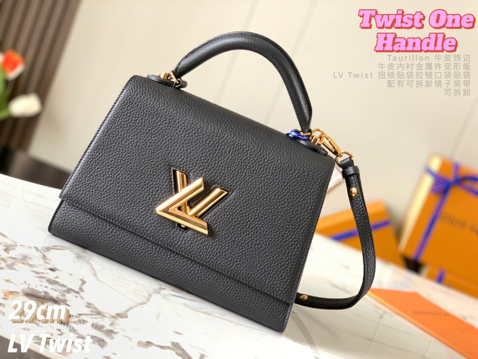五金配件:金色金属饰件,配有标志性的可旋转 LV Twist 扭锁