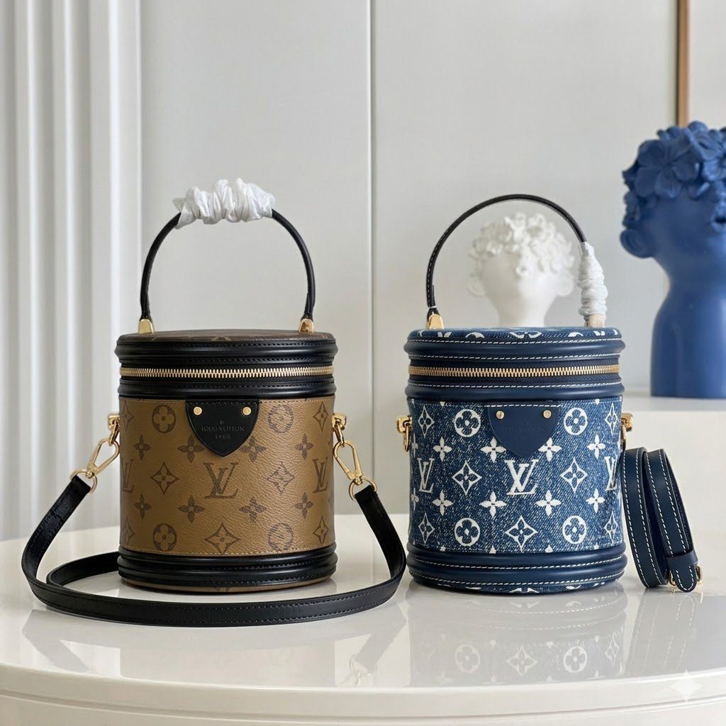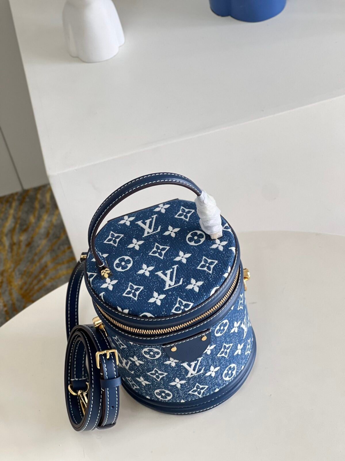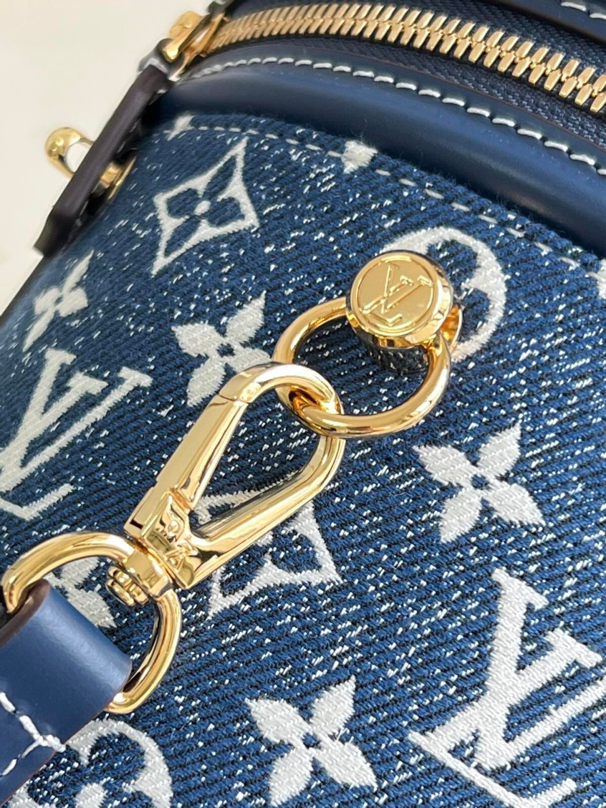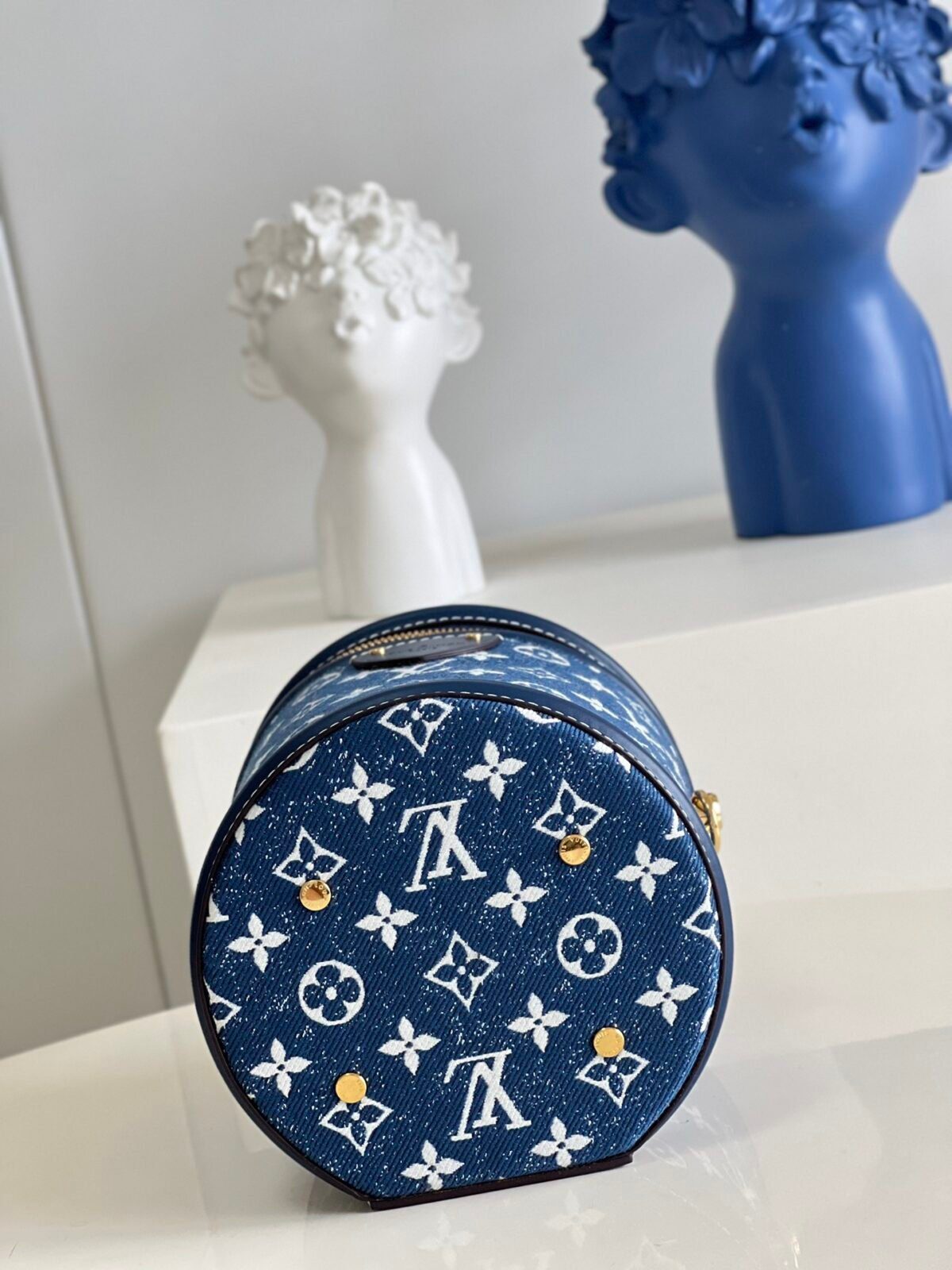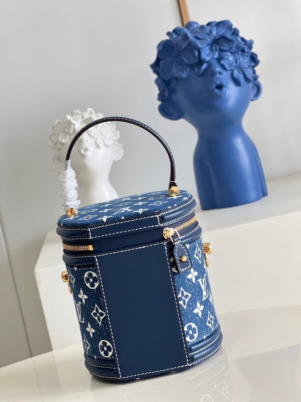 蓝色 Monogram Denim 款:一种清新且充满现代感的全新演绎;包身采用纹理细腻的蓝色丹宁面料,并巧妙织入了白色的 Monogram 图案;深邃的海军蓝色皮革饰边,为其增添了一抹迷人的点睛之笔。