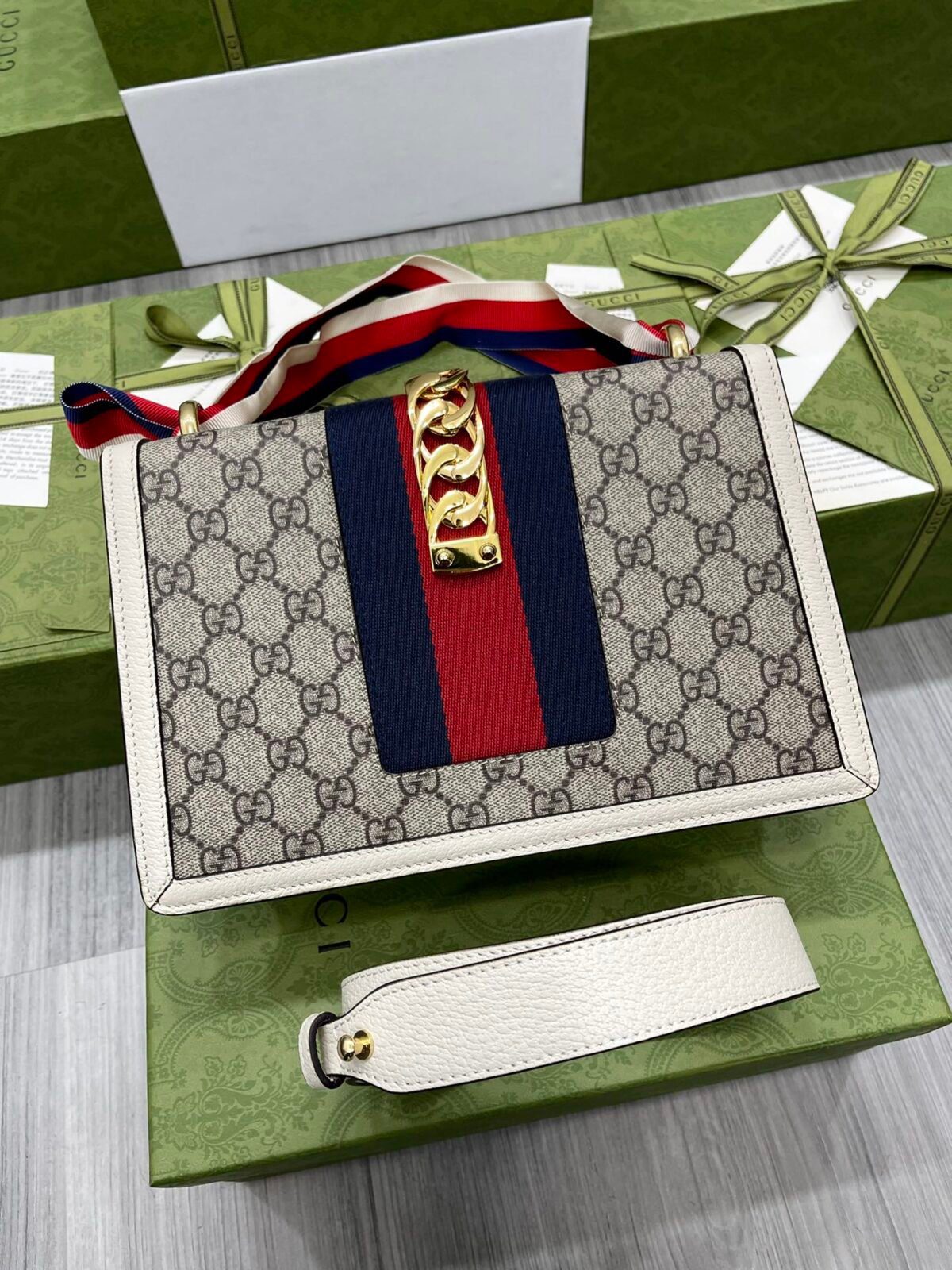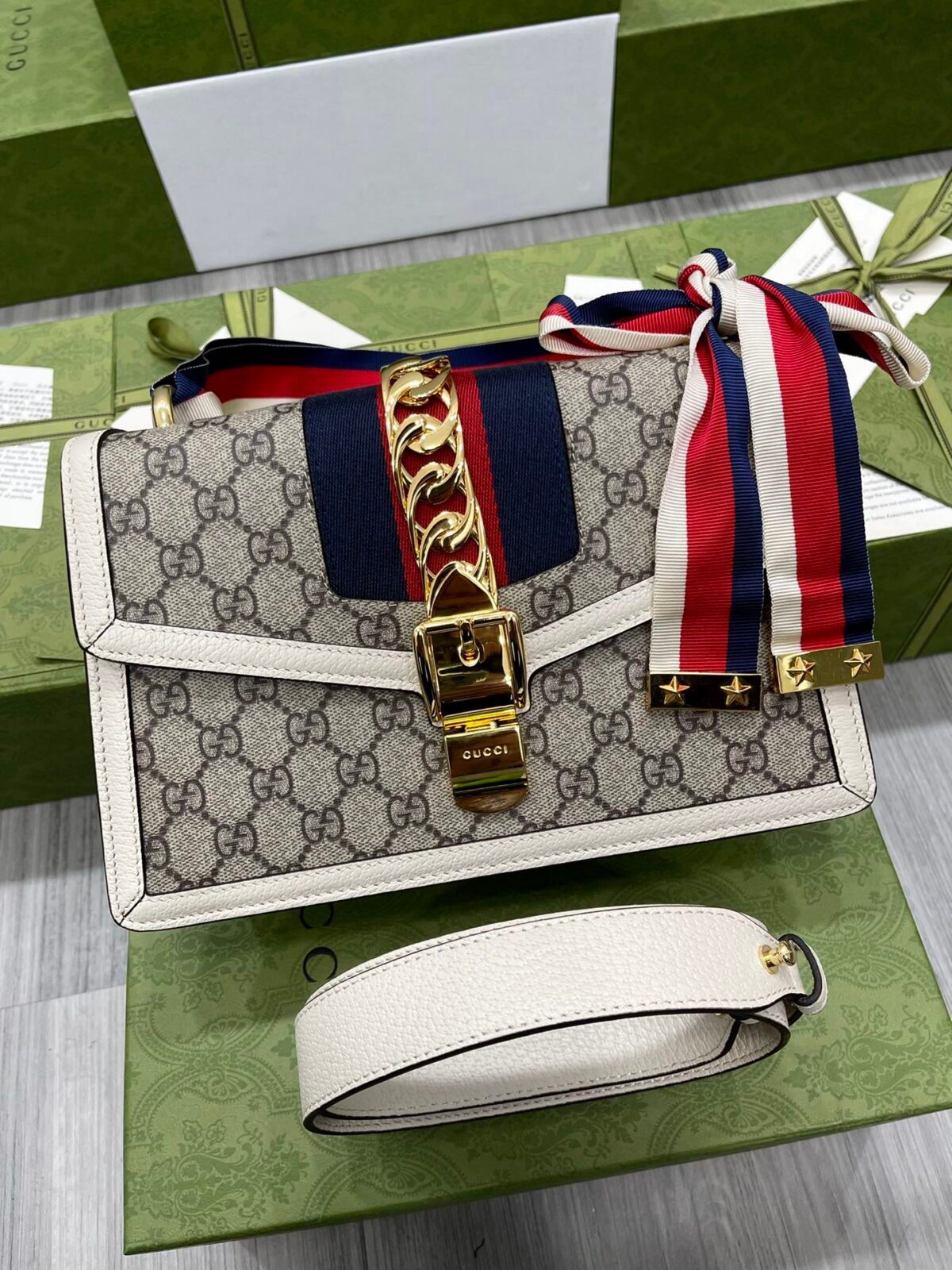 包身采用品牌标志性的 GG Supreme 涂层帆布精湛打造,硬挺立体的轮廓由质感丰润的光滑皮革饰边勾勒而成。Sylvie 系列真正的点睛之笔在于其标志性的尼龙织带细节——这道织带贯穿包身中央,并饰有一条醒目粗犷的金色链条及搭扣,这些经典元素均直接复刻自 Gucci 的品牌典藏档案。此外,包袋还配有一条标志性的可替换丝带肩带,末端饰有金色金属星星细节,为整体造型增添了一抹俏皮灵动的“森林精灵”般的美感;您可以将丝带系成柔美的蝴蝶结,打造出一种自信张扬、时髦至极的风格。