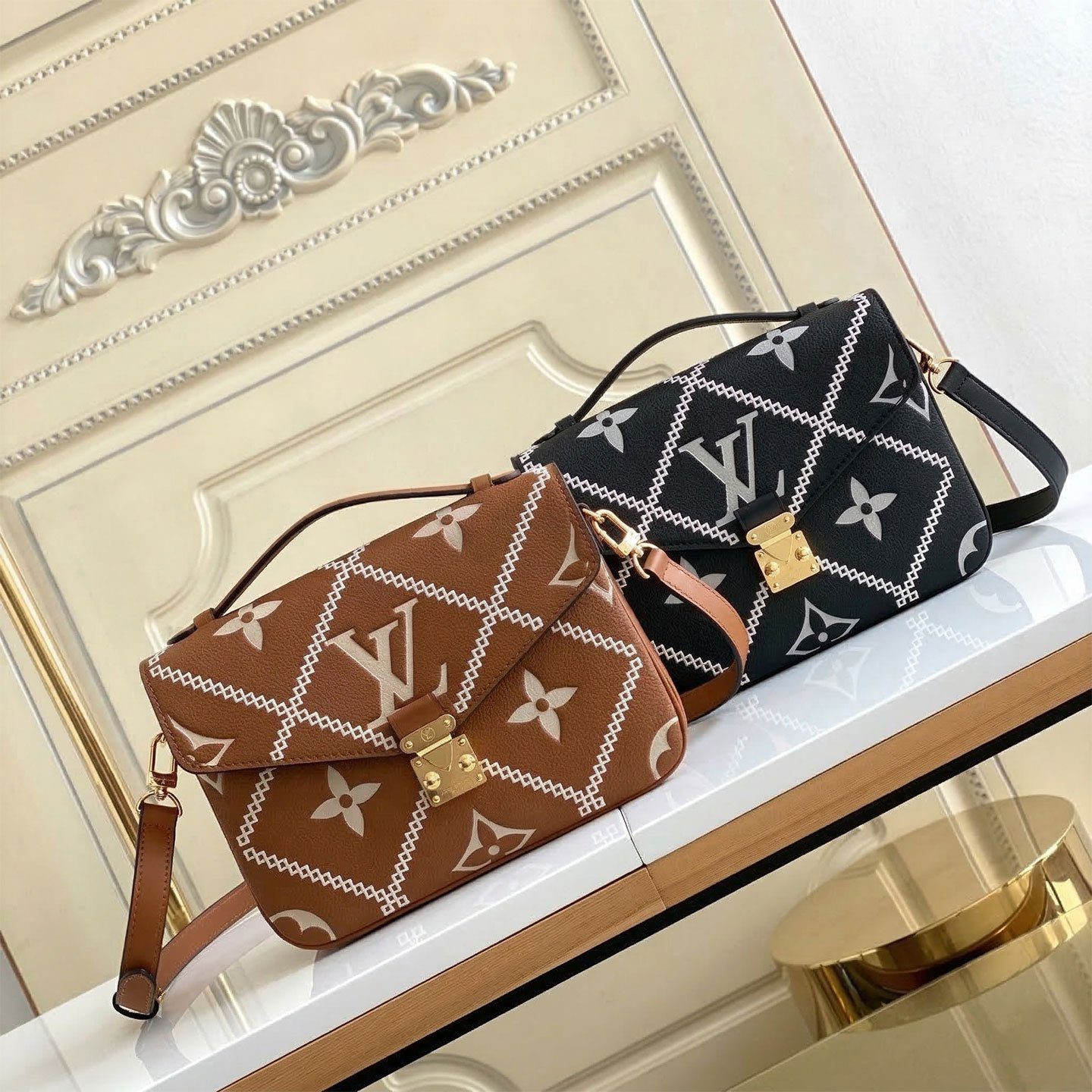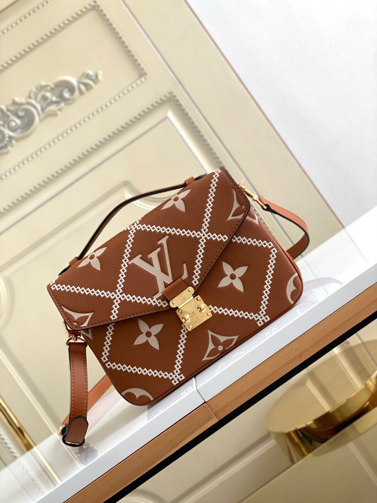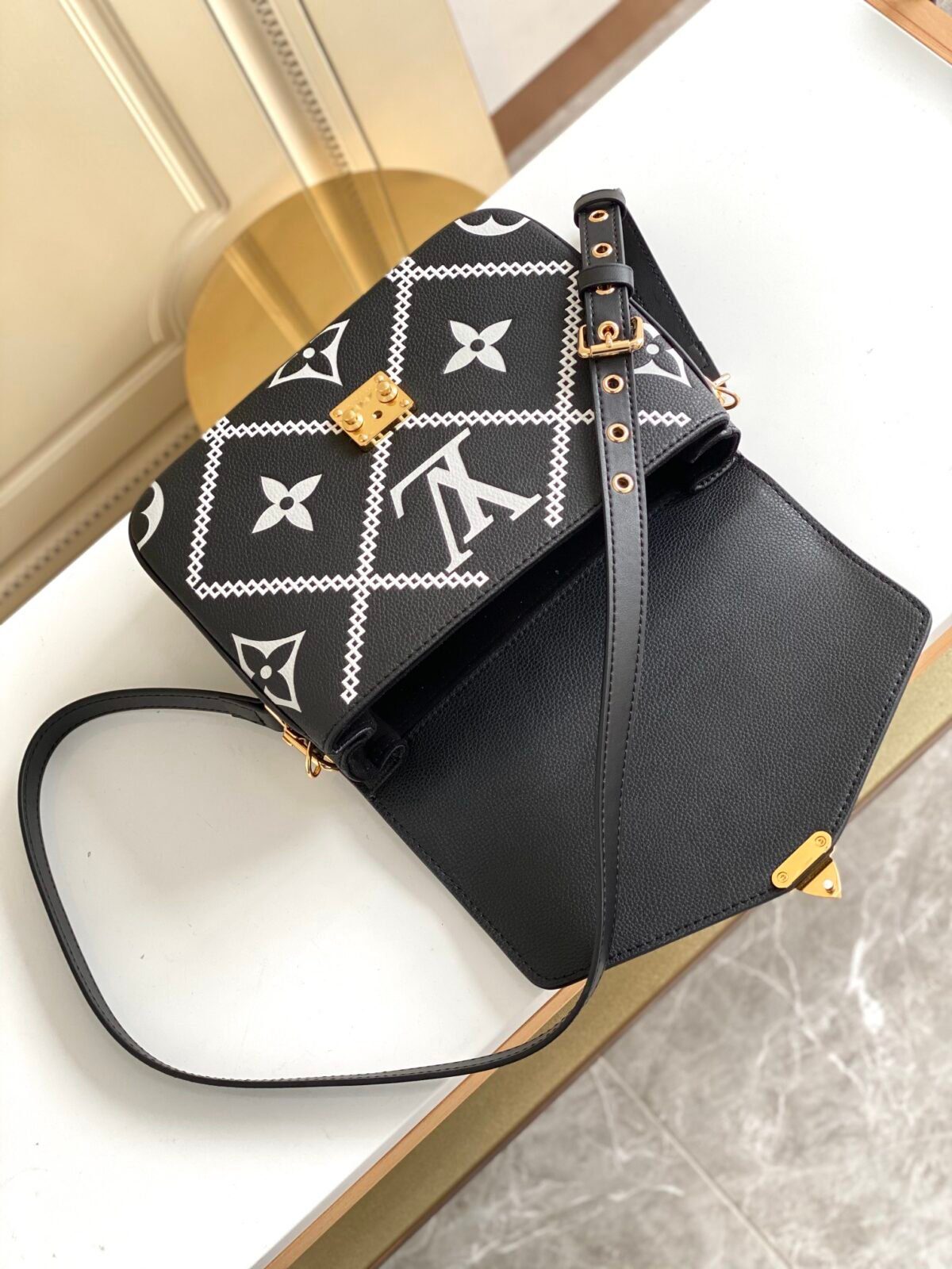 路易威登(Louis Vuitton)的 Pochette Métis 包款堪称优雅收纳的典范,而这款特别版更是在此基础上实现了进一步升华。它选用奢华柔韧的 Monogram Empreinte 压纹牛皮精制而成,饰有引人注目的丝网印花格纹刺绣——这种精致的菱形图案为标志性的 Monogram 压纹图案增添了一种兼具现代感与建筑美学的独特质感。