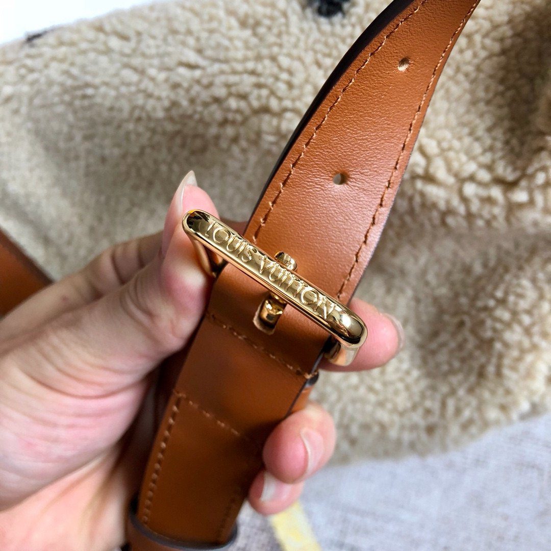 非凡的嵌花工艺——这款限量版包袋采用极其柔软的剪羊毛(小羊毛)精心打造。设计师运用精密的嵌花(Intarsia)工艺,将经典的 Monogram 图案直接织入蓬松的奶油色包身之中,营造出迷人的视觉对比,并带来顺滑、奢华的触感。包袋设计以顺滑的焦糖色牛皮饰边与璀璨的金色金属配件作点睛之笔,尽显优雅格调。