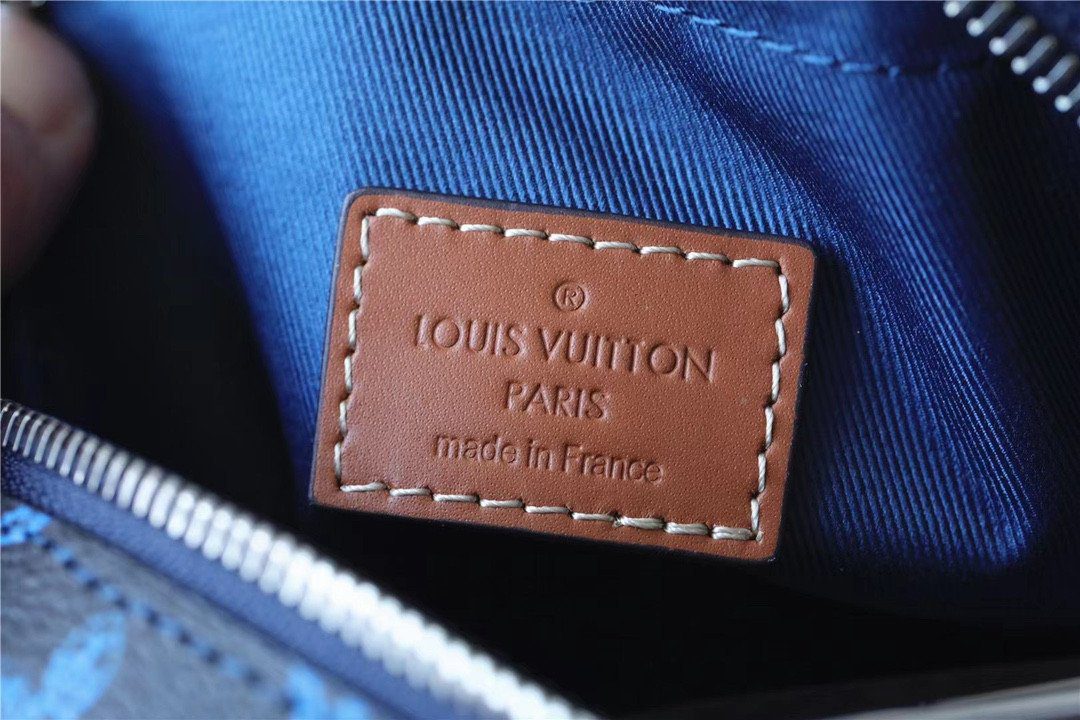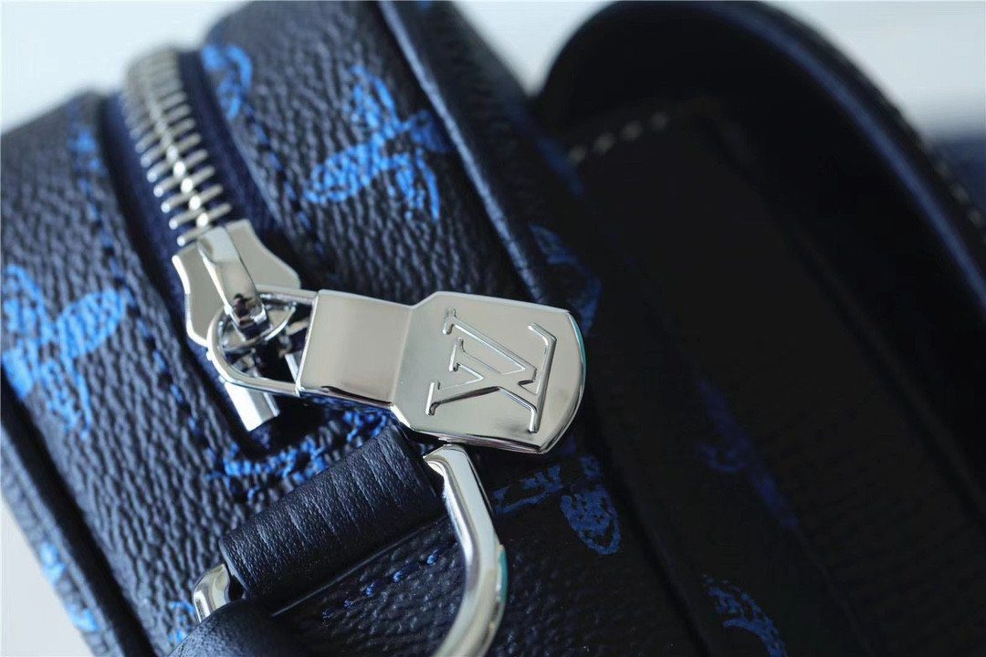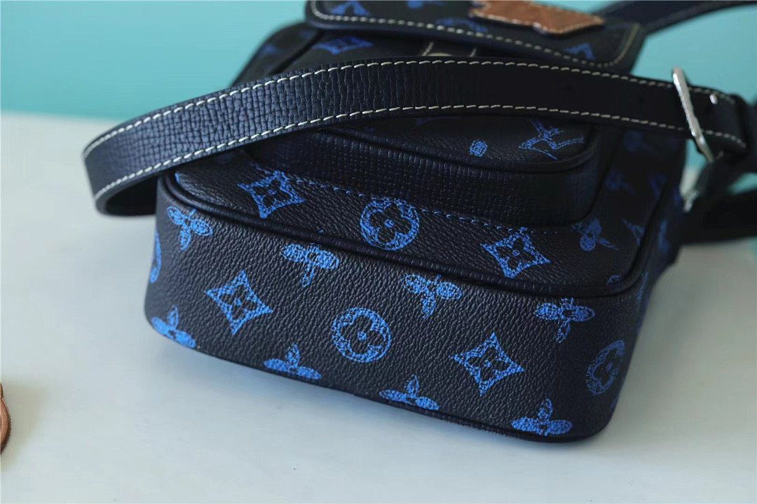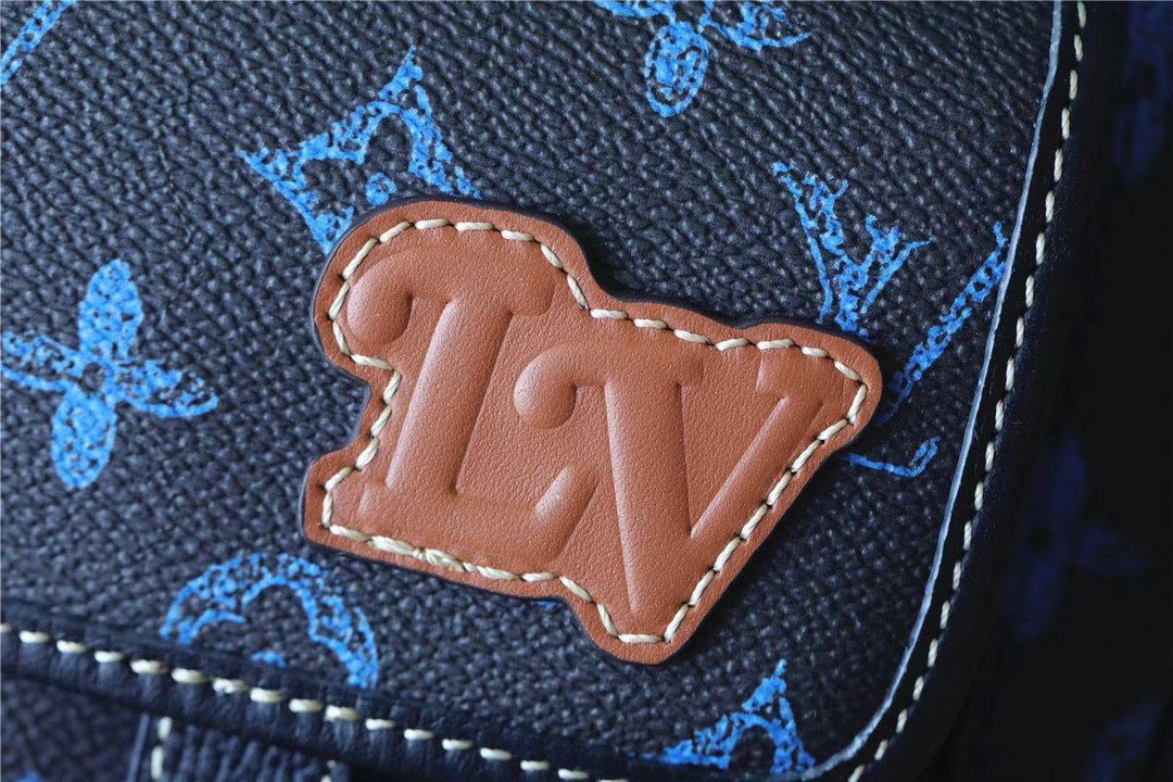 标志性细节与色彩反差:此款包袋选用耐磨的涂层帆布制成,其深色 Monogram 背景与鲜艳的蓝色细节之间形成了引人注目的色彩反差。整款包袋的视觉焦点在于前翻盖上那枚标志性的浅褐色皮革“LV”贴饰,为包身增添了一抹兼具匠心工艺与复古情调的独特韵味。辅以哑光质感的金属配件和利落的白色对比缝线,包身的每一处细节设计都旨在彰显精致考究的时尚格调。
