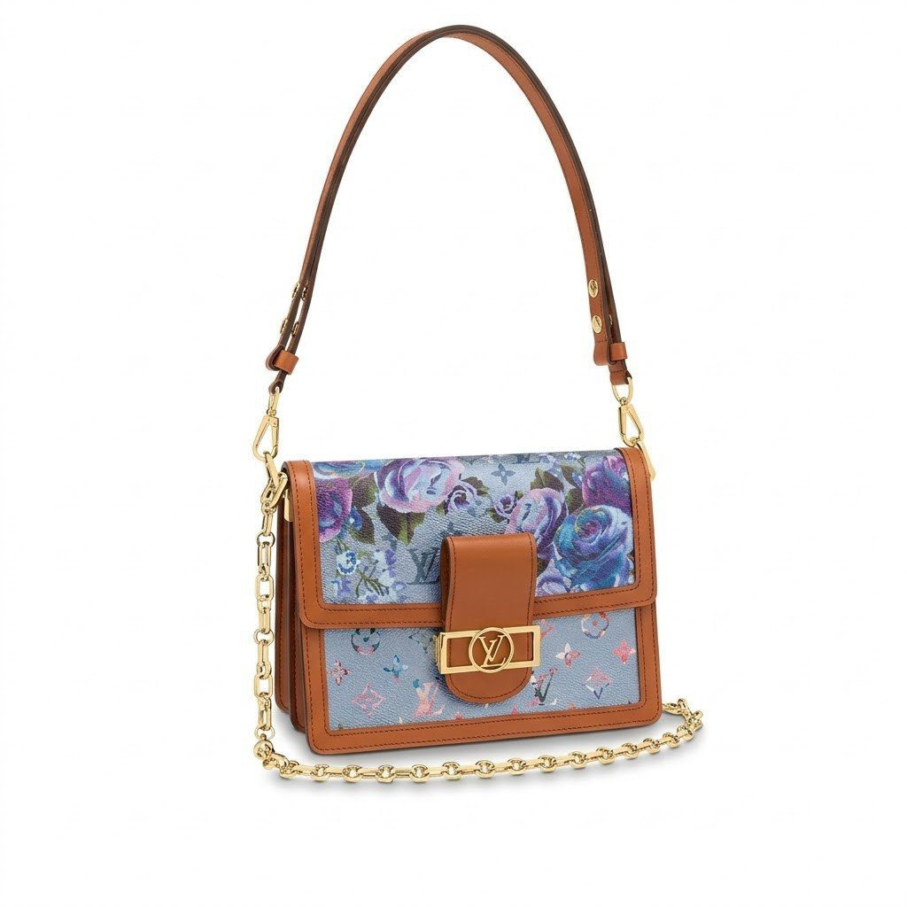 经典传承邂逅现代艺术:充满活力的冷色调金属感花卉印花,在温暖柔滑的棕色牛皮饰边映衬下显得格外动人,营造出强烈的视觉反差。手袋正面中央饰有标志性的 LV Circle 磁扣,采用抛光金色饰面,既彰显了路易威登深厚的品牌传承,又提供了安全且顺畅的开合体验。