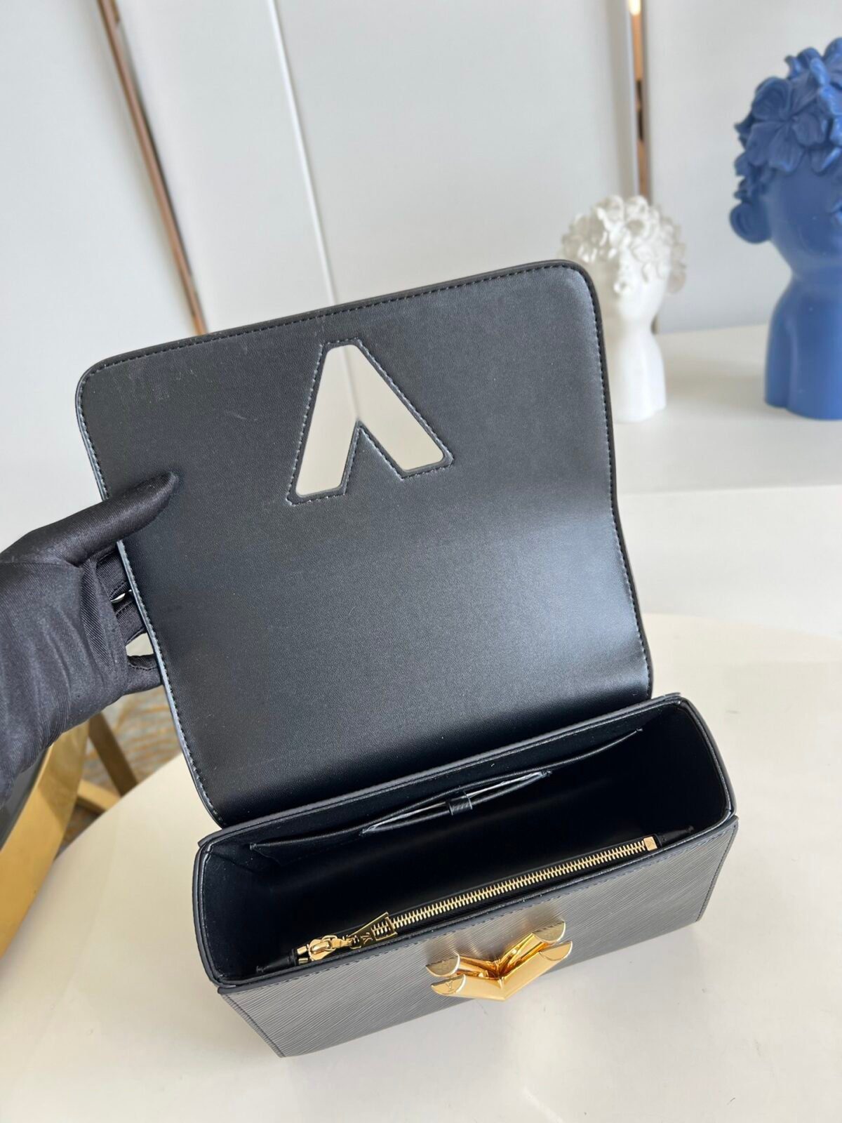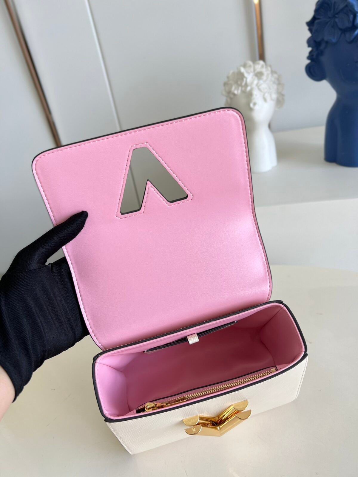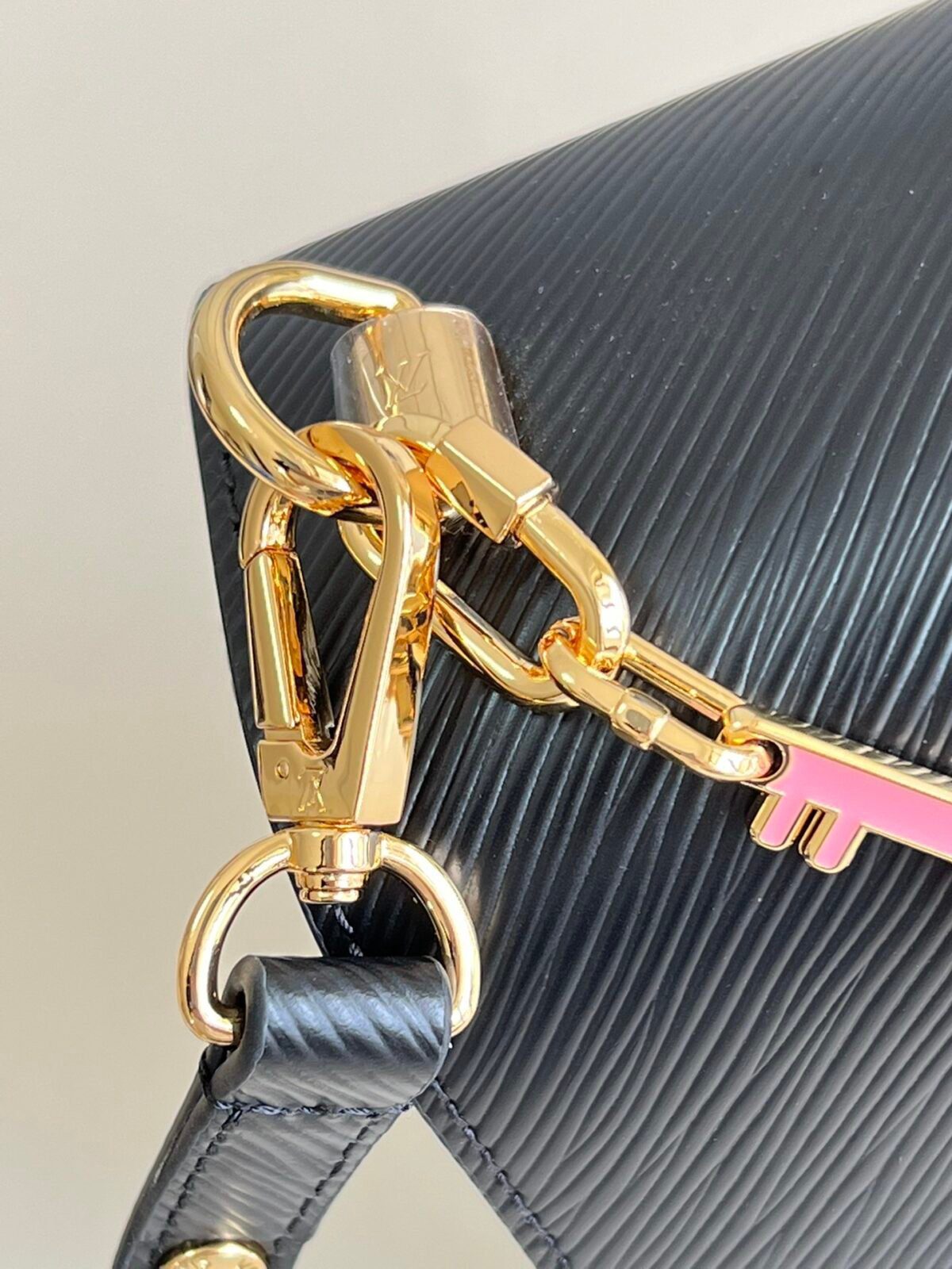 标志性 Epi 皮革与雕塑感五金:此款手袋选用路易威登品牌标志性的纹理 Epi 粒面牛皮精制而成,不仅具备卓越的耐用性,更呈现出细腻的触感与精致的饰面。整个设计的视觉焦点在于那闪耀着光泽、极具雕塑感的 LV Twist 锁扣。这堪称功能与艺术完美结合的典范——只需轻轻一扭,字母“L”便顺滑地旋转变为“V”,在开启手袋的同时,绽放出璀璨的金属光泽。