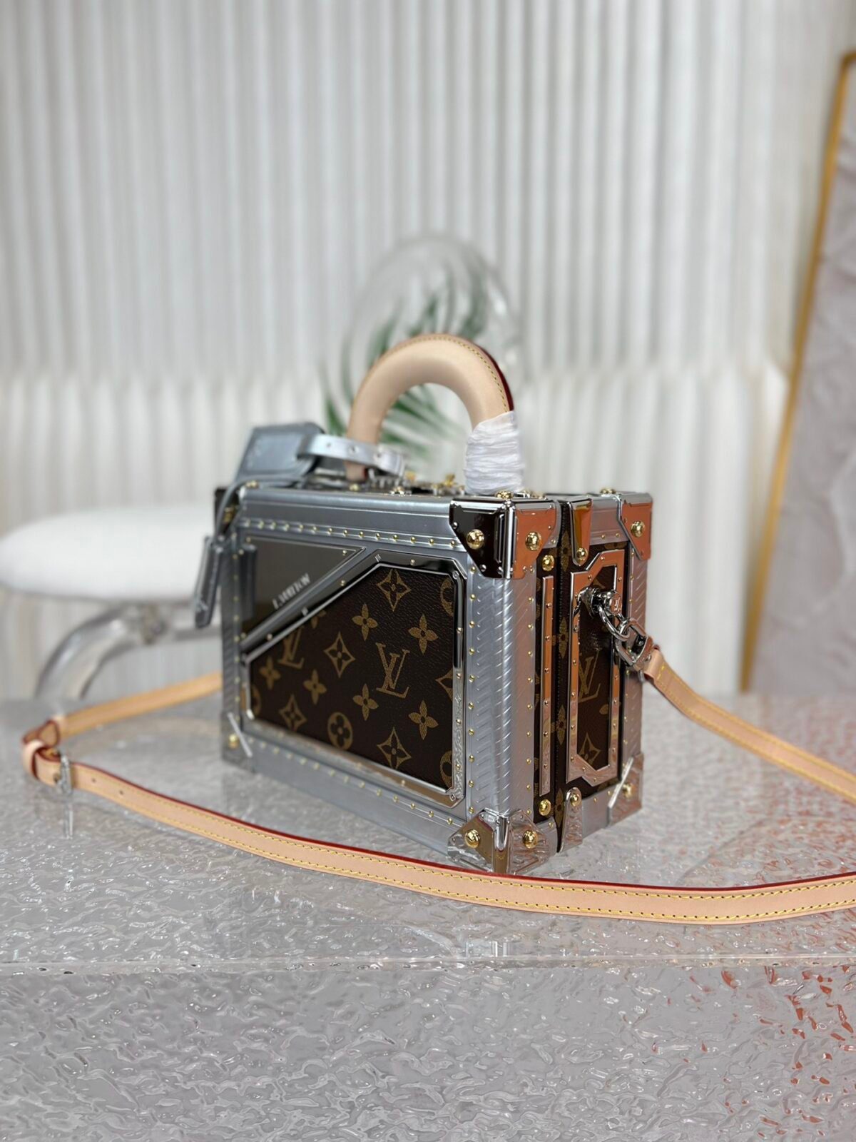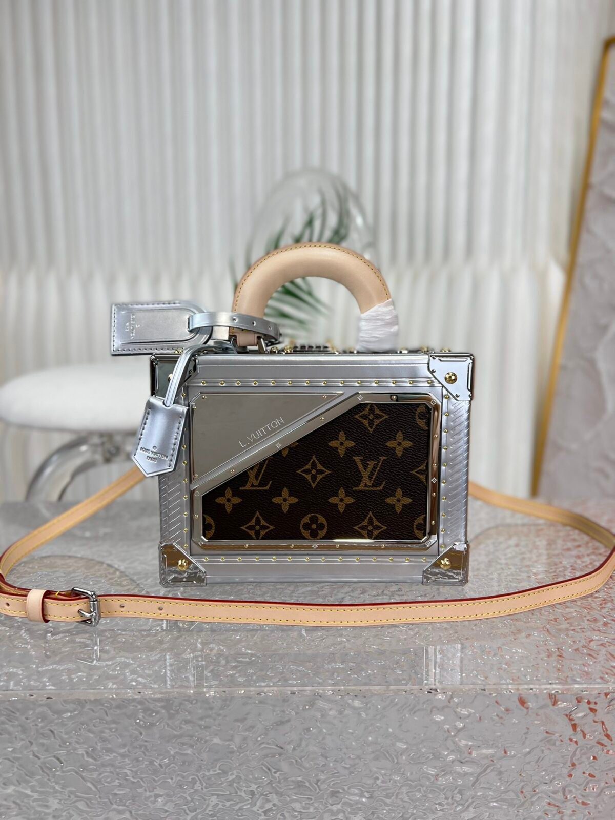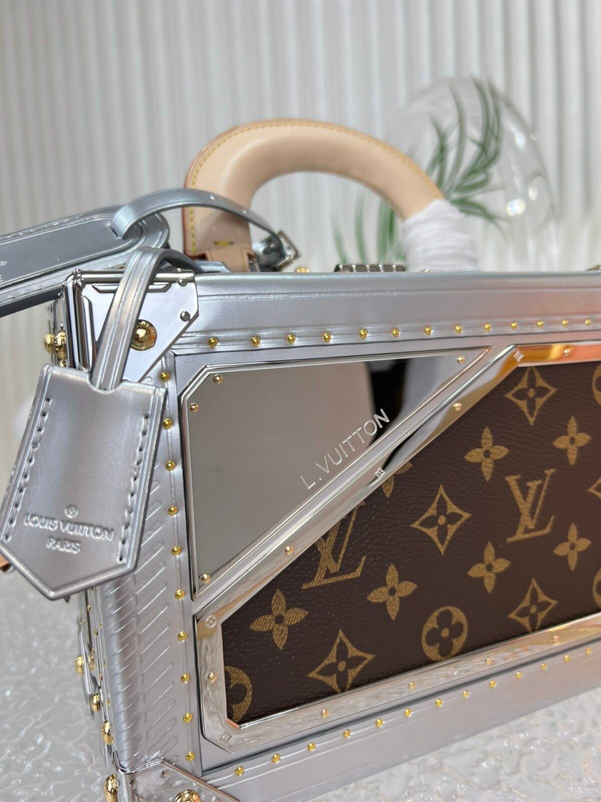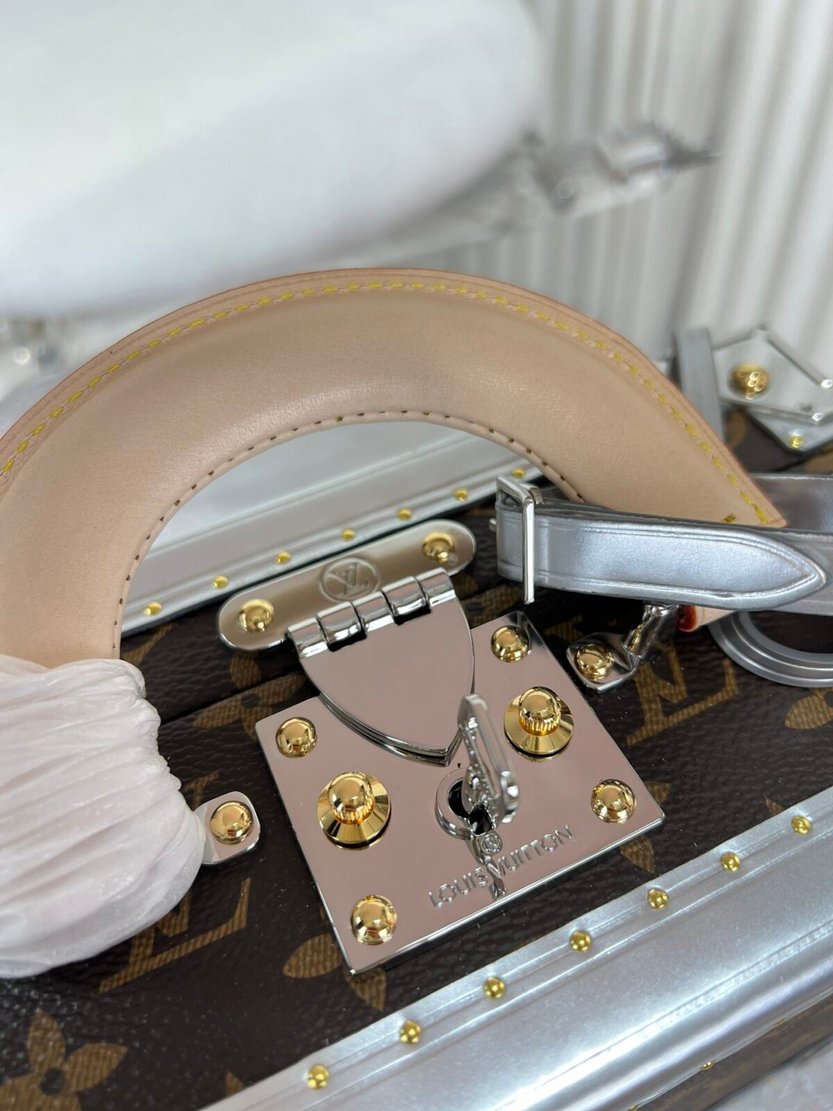 鲜明对比与结构杰作——这款小巧的硬质手提箱凭借其创新的材质运用,瞬间成为全场瞩目的焦点。包身正面饰有标志性的棕色 Monogram 涂层帆布,并被流畅的黑色饰边与醒目的“L.VUITTON”品牌标识细节戏剧性地分割开来。整个包身外框由光泽璀璨、如镜面般的银色金属材质包裹,其上精心点缀着粗犷醒目的金色铆钉与加固护角。这种材质与金属的辉煌碰撞,营造出一种极具立体感与宇宙未来感的视觉氛围。