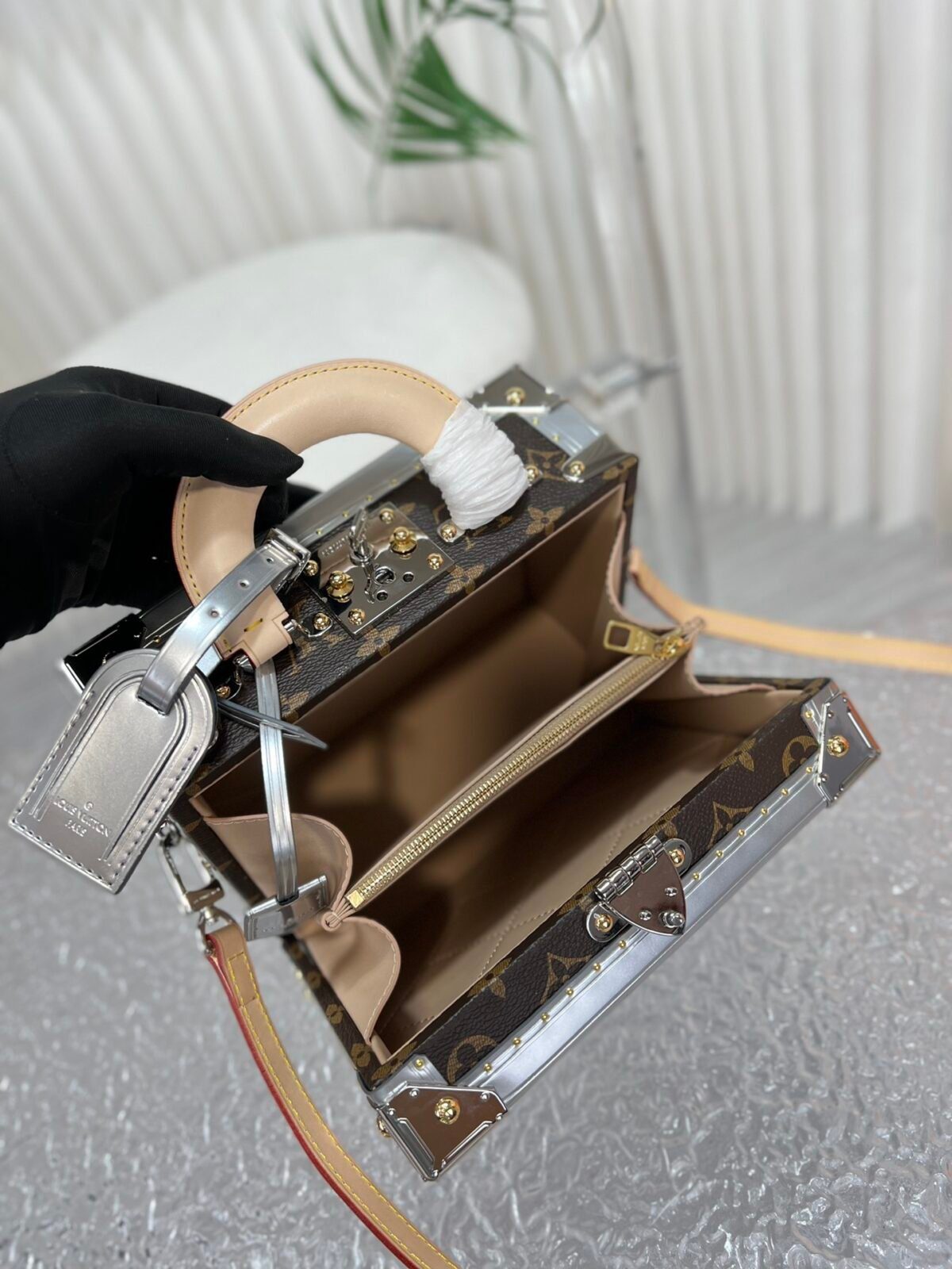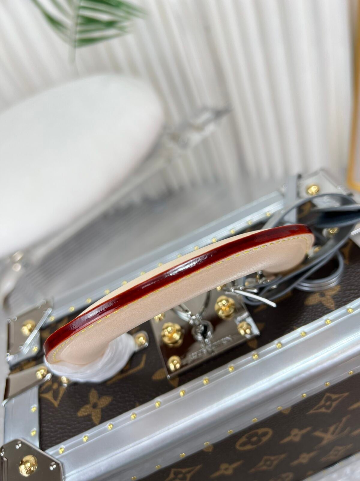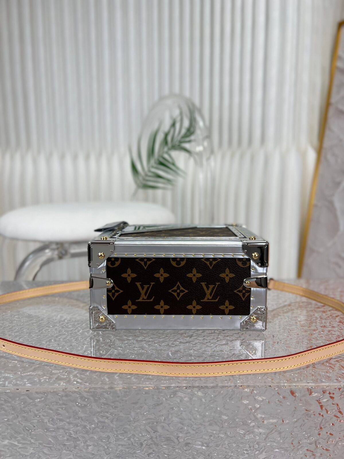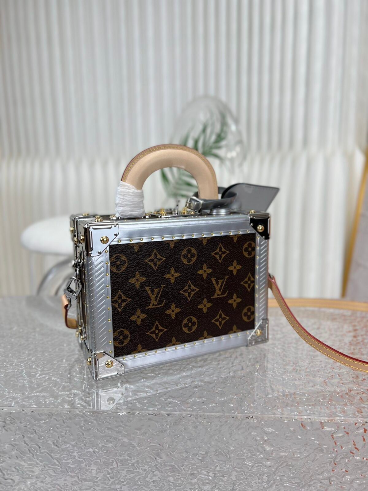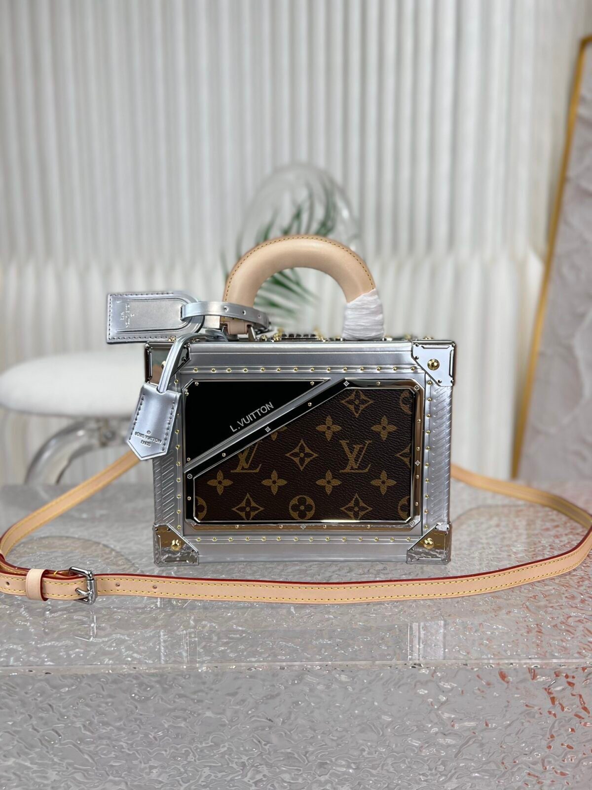 鲜明对比与结构杰作——这款小巧的硬质手提箱凭借其创新的材质运用,瞬间成为全场瞩目的焦点。包身正面饰有标志性的棕色 Monogram 涂层帆布,并被流畅的黑色饰边与醒目的“L.VUITTON”品牌标识细节戏剧性地分割开来。整个包身外框由光泽璀璨、如镜面般的银色金属材质包裹,其上精心点缀着粗犷醒目的金色铆钉与加固护角。这种材质与金属的辉煌碰撞,营造出一种极具立体感与宇宙未来感的视觉氛围。
