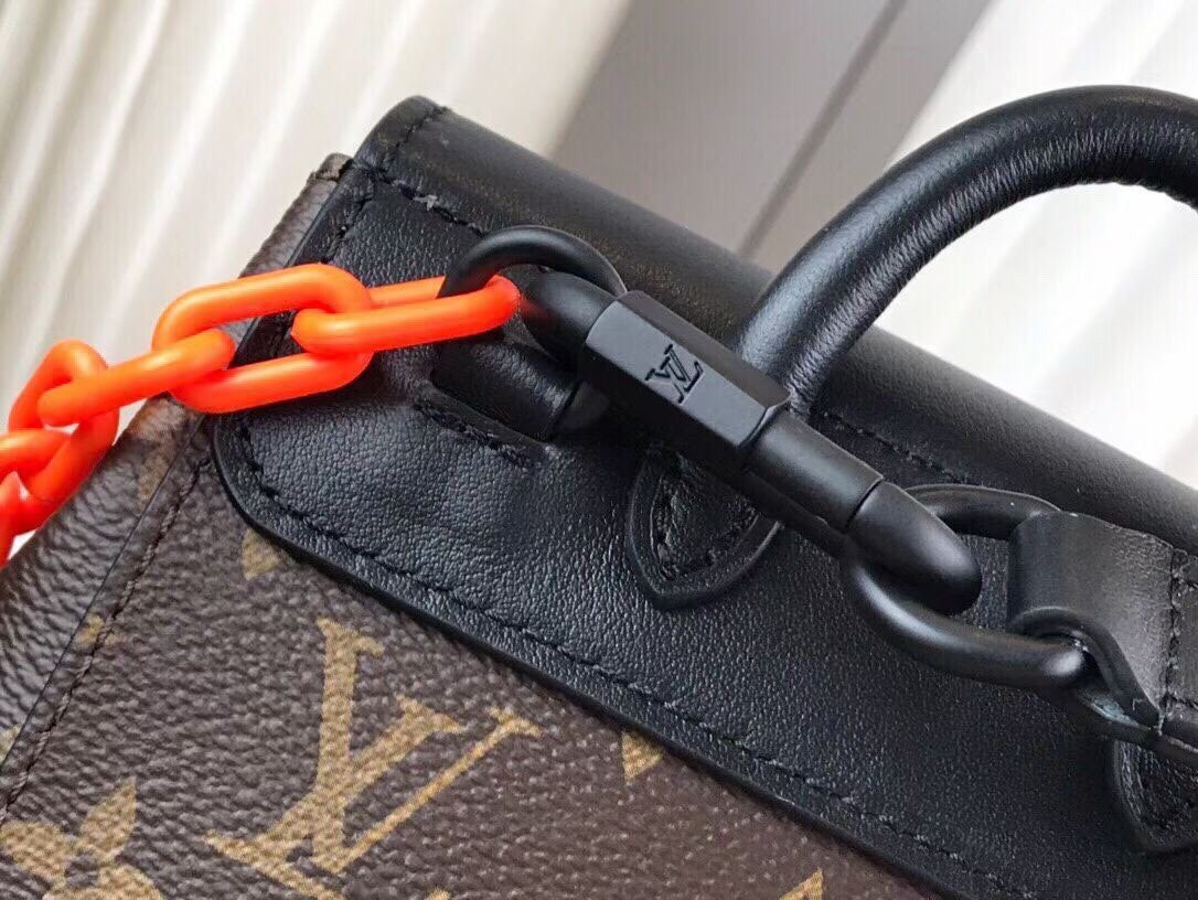 经典 Steamer 传承的全新演绎:这款 Nano 迷你版包袋灵感源自 1901 年问世的经典 Steamer 包袋,在小巧便携的廓形中,原汁原味地保留了原作的所有标志性元素。包身采用经典的 Monogram 涂层帆布制成,搭配哑光黑色皮革饰边及加固包角,散发出一种既粗犷硬朗又不失精致优雅的独特美学气息。设计亮点在于那条醒目亮丽的橙色树脂链条,为包袋注入了一抹大胆前卫的工业风色彩,这正是 Virgil Abloh 执掌 Louis Vuitton 时期最具代表性的设计语言。