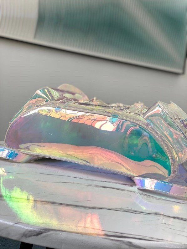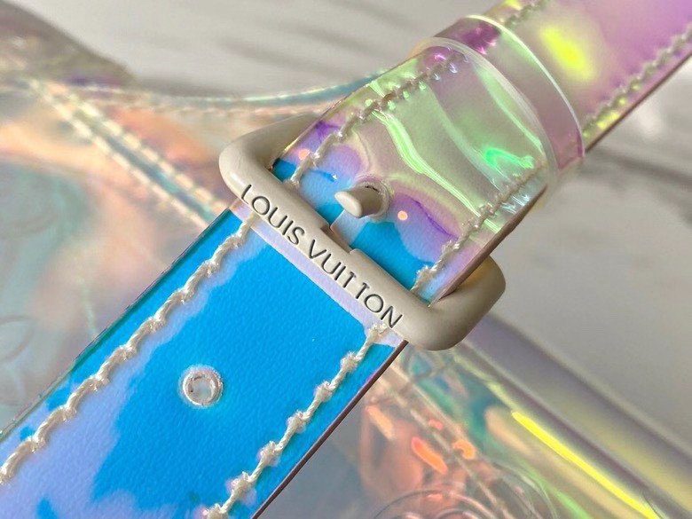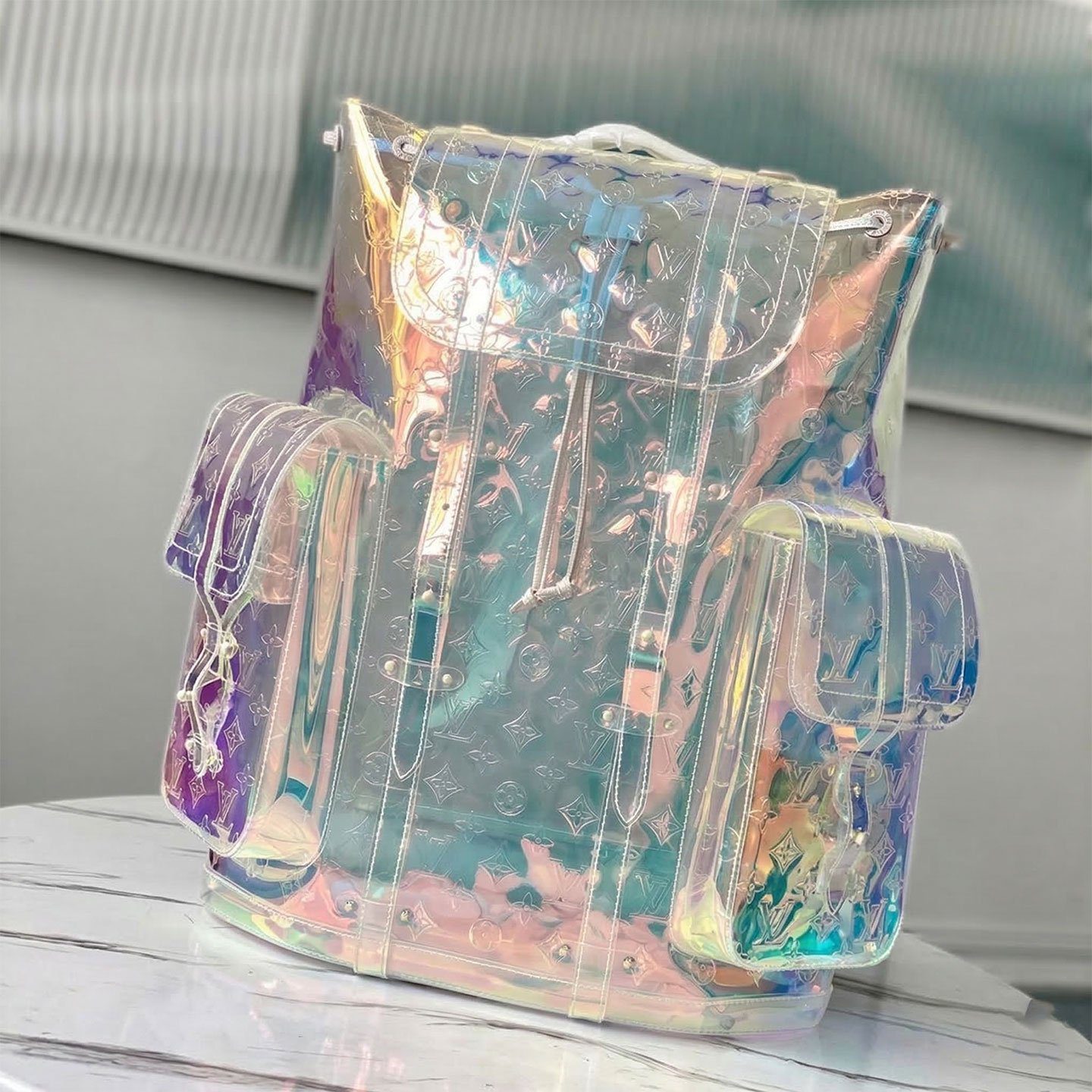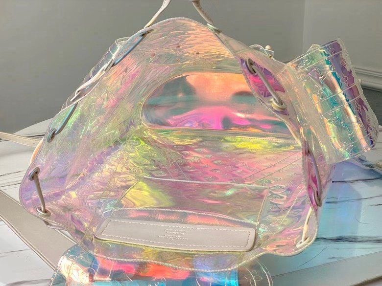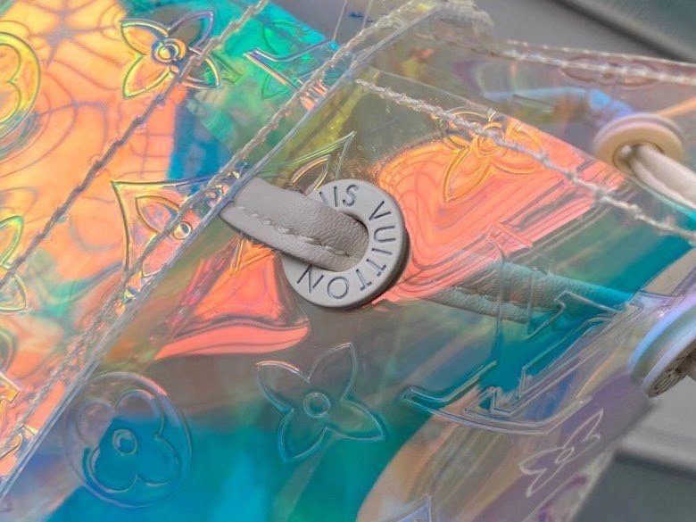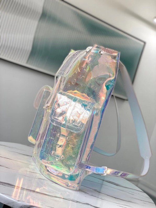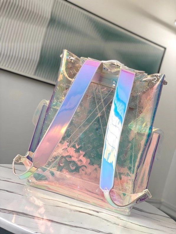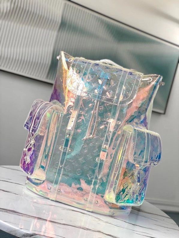 梦幻棱镜设计与标志性传承:这款背包采用革命性的虹彩 Monogram 压纹 PVC 材质精制而成,能够捕捉并折射光线,营造出令人惊叹的彩虹般流光溢彩效果。Christopher GM 的设计灵感源自传统登山背包的硬朗轮廓,既致敬了路易威登深厚的旅行文化根基,又凭借其透明且充满未来感的材质突破了设计界限。标志性的金属铆钉与搭扣细节,为背包那梦幻般的通透主体增添了一抹鲜明、硬朗的工业风格对比。