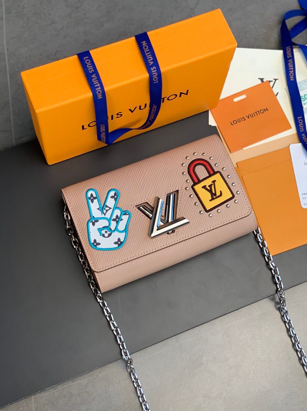致敬旅行传承的趣致之作——用这款出自备受赞誉的“LV Stories”系列的精美 Twist 链条钱包,为您的奢华藏品增添一抹亮色。这款限量版单品以充满奇思妙想的创意,向路易威登(Louis Vuitton)传奇般的旅行及硬箱制作历史致以崇高敬意。它选用耐用且纹理细腻的 Epi 皮革制成,呈现优雅柔美的玫瑰裸色调;包身化作精致的画布,承载着一系列色彩鲜艳、材质多样的装饰贴饰——其中包括以 Monogram 帆布打造的“胜利”手势图案,以及饰有铆钉细节的 LV 挂锁图案。
