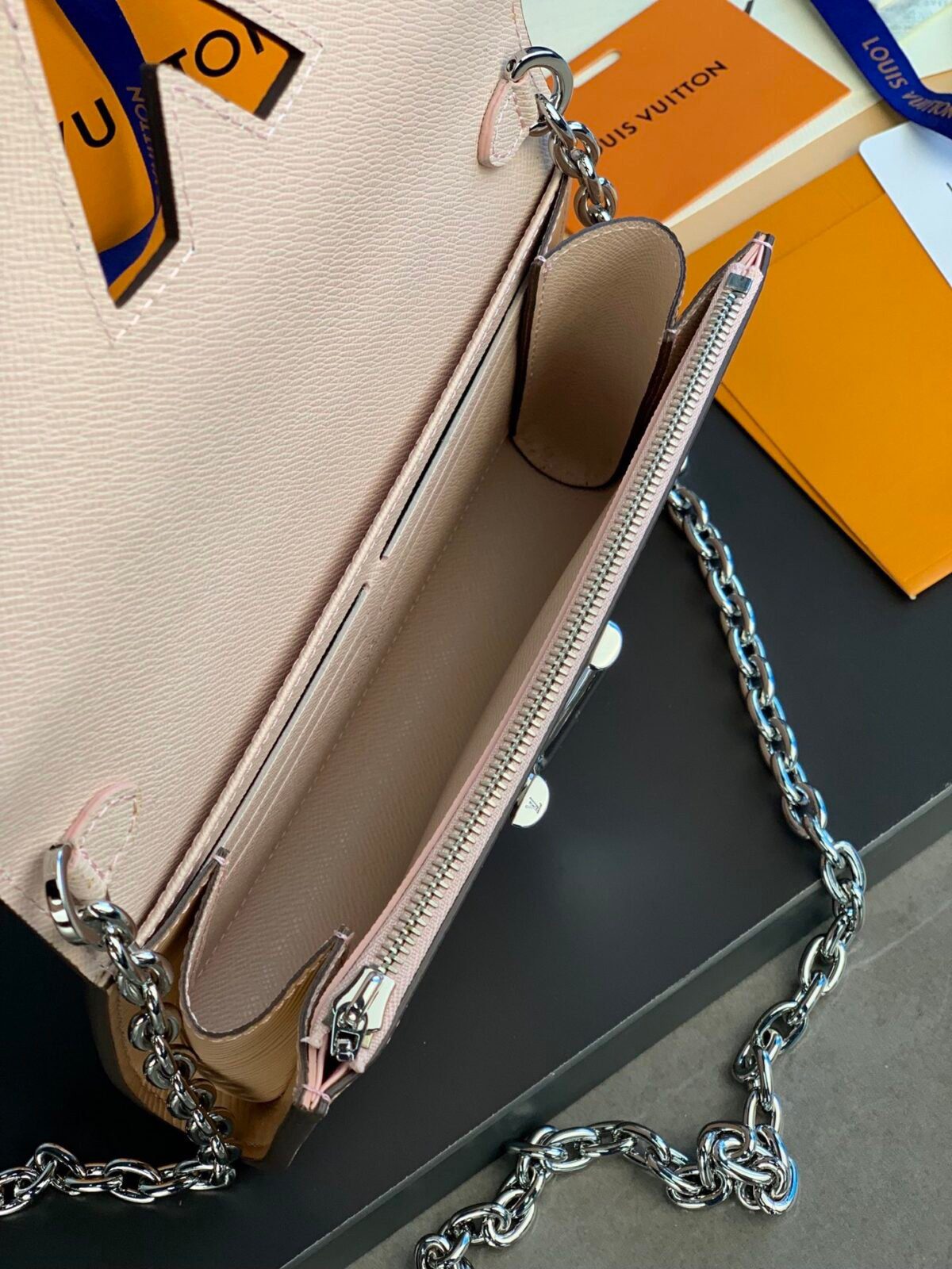 主要特征:可旋转变换的 LV Twist 锁扣、刺绣与帆布材质贴饰、铆钉装饰细节、6个信用卡槽、内置拉链隔层、可拆卸链条肩带。