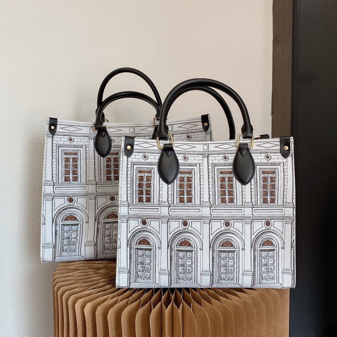 包身饰有一幅引人注目的黑白建筑立面插画,细节刻画精美绝伦——路易威登标志性的 Monogram 图案若隐若现,透过古典的拱形窗户与门廊悄然探出。此包款选用优质原厂材质并经由一丝不苟的细节处理打造而成;光滑的黑色皮革手柄与饰边勾勒出包身轮廓,与结构感十足且充满视觉张力的印花帆布形成了优雅而鲜明的对比。
