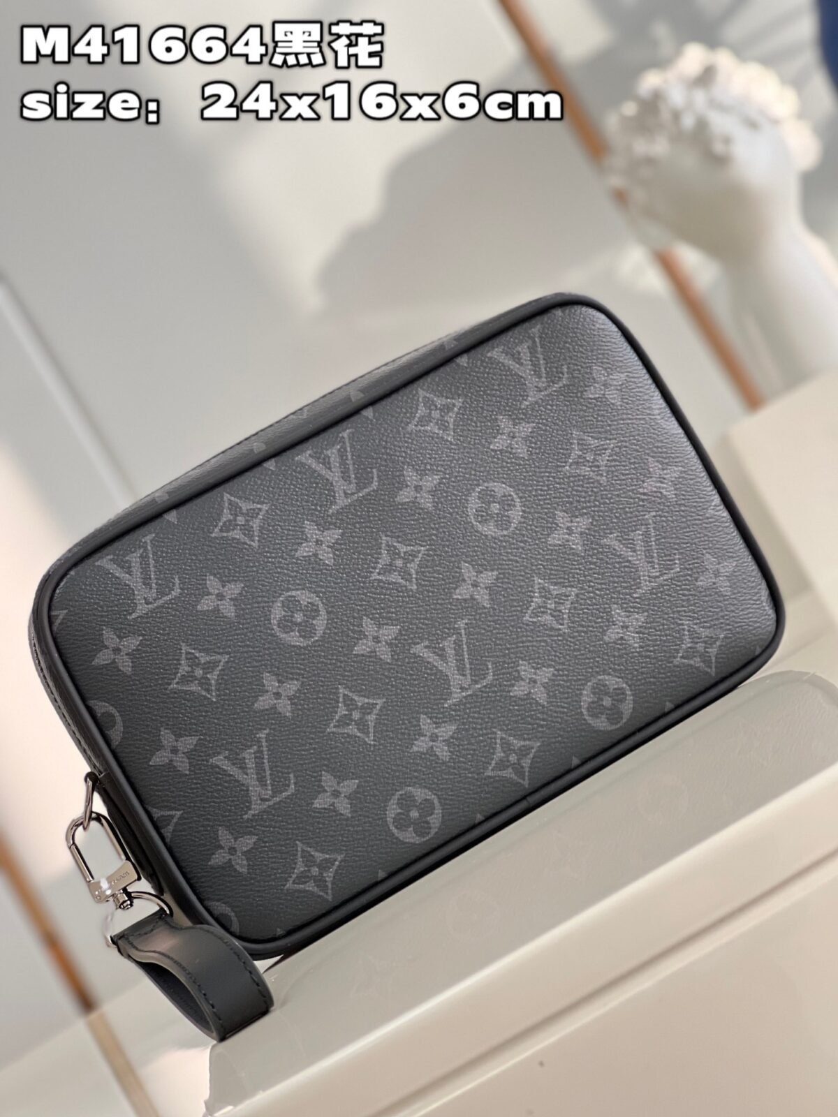 该手拿包采用引人注目的 Monogram Eclipse 涂层帆布(常被称为“黑花”)制作,呈现出一种精致且充满阳刚之气的审美风格。宽大顺滑的顶部拉链开启后,内部空间出乎意料地宽敞;而丰富的内外口袋与卡槽设计,确保您的所有随身必需品——从手机、钥匙,到各类卡片及旅行证件——都能井井有条地收纳妥当,且触手可及。