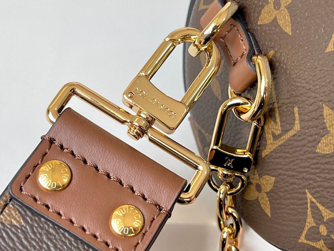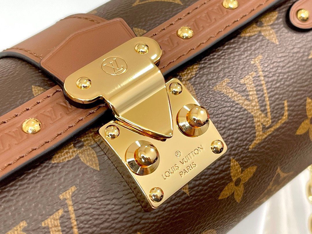 此款结构感十足的手袋采用经典的 Monogram 涂层帆布精心打造,并辅以浓郁的棕色皮革饰边、压花边缘细节以及闪耀的金色金属配件,尽显华贵质感。其核心亮点在于标志性的抛光 S 锁扣——这一设计不仅直接致敬了品牌悠久的硬箱制作传奇,更能确保您的日常随身物品安全无虞。