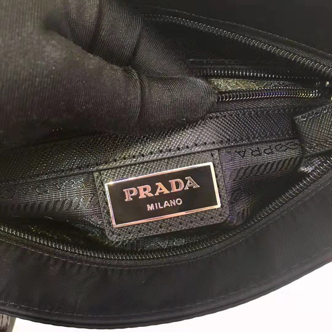 细节之处尽显匠心独运。包袋配有优质的铂金拉丝金属配件,并饰以 Prada 标志性的珐琅三角徽标——该徽标由纯铜打造并经电镀工艺处理而成。此外,包袋还配有一条宽版且可调节的编织肩带,无论日常通勤还是周末短途旅行,都能为您带来极致的“解放双手”的舒适体验。