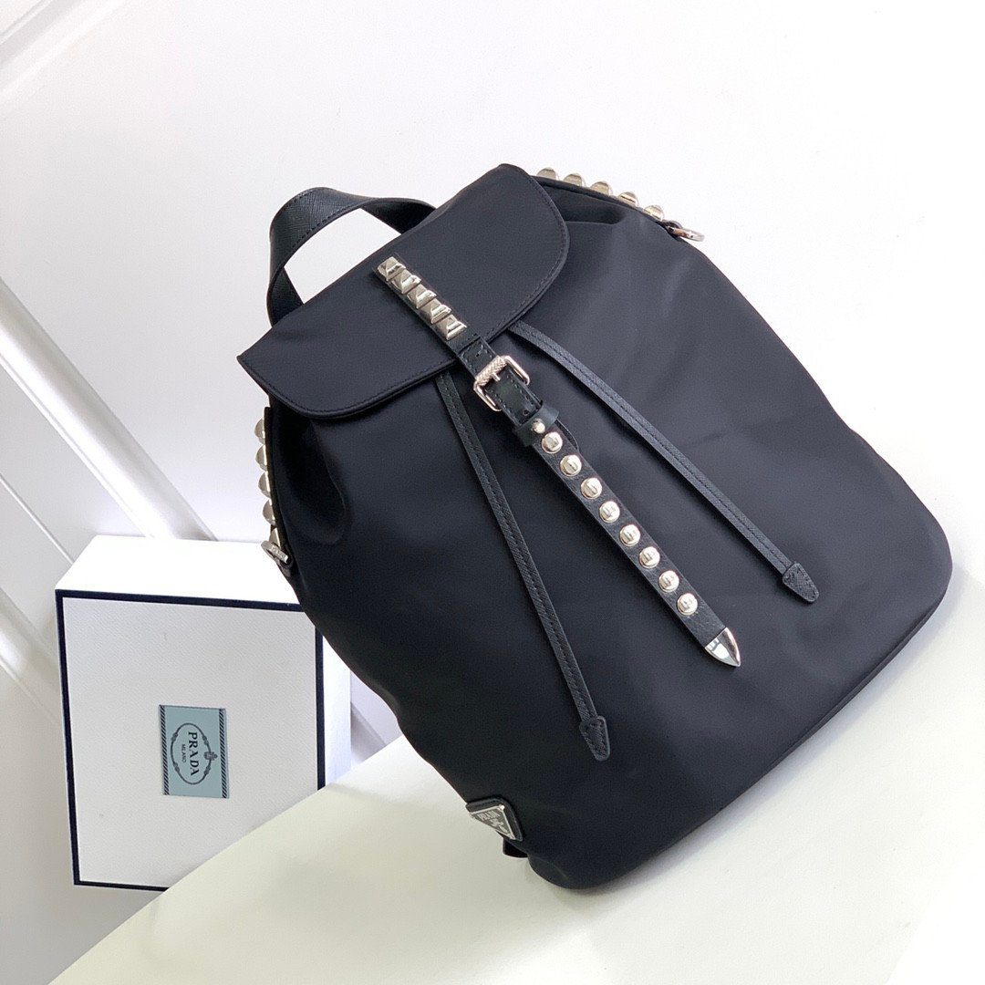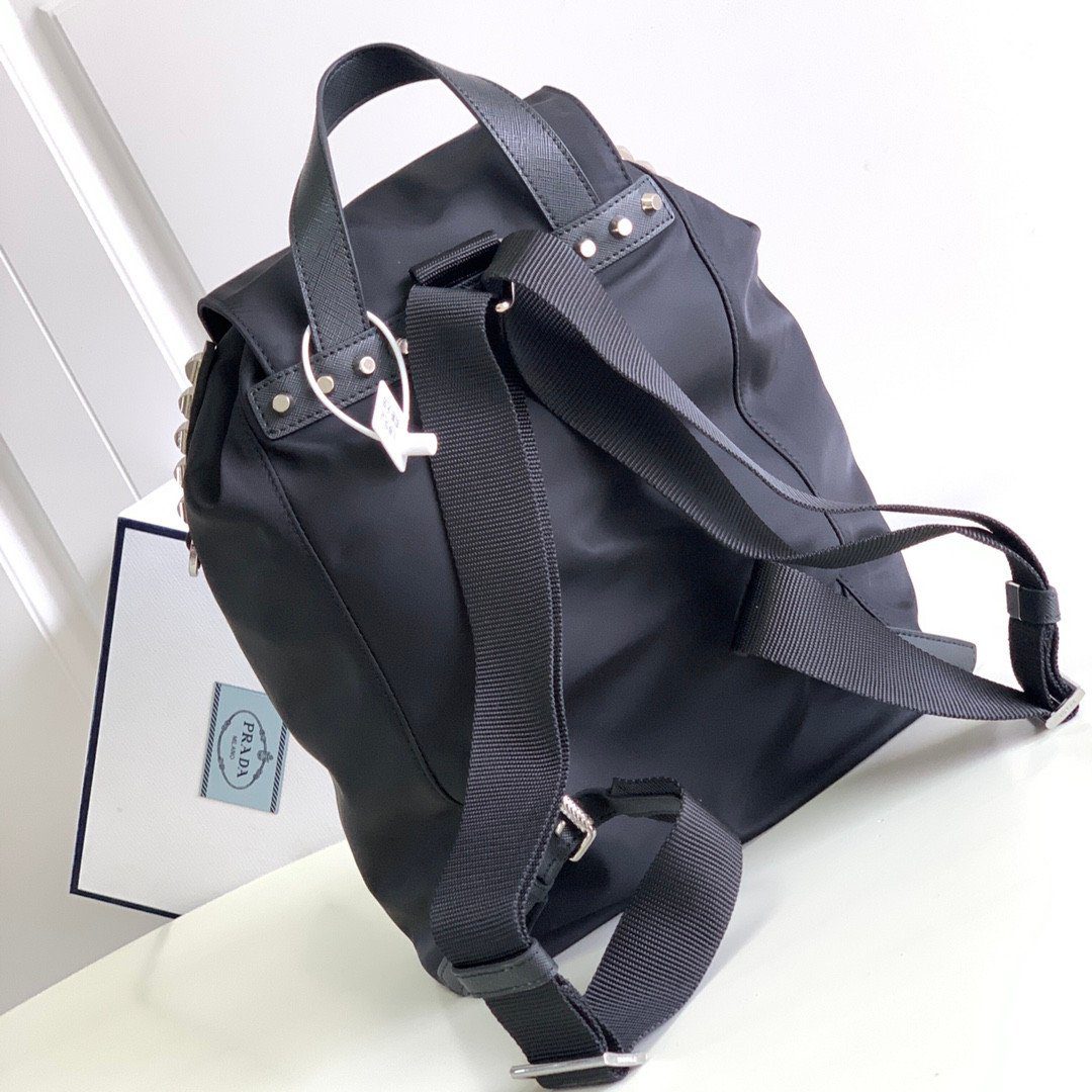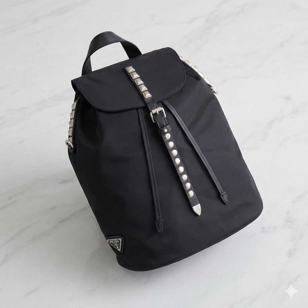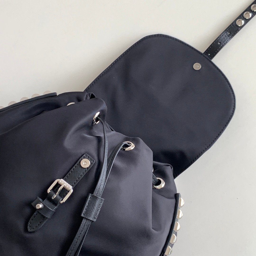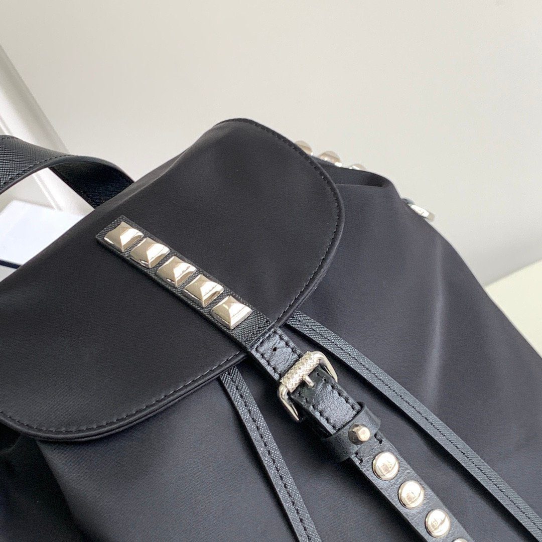 Prada 1BZ032 铆钉双肩包将 Prada 标志性的实用尼龙材质与叛逆前卫的现代格调完美融合。这款引人注目的单品沿袭了品牌经典的双肩包轮廓,并巧妙地融入了令人过目难忘的设计细节:耀眼的银色金属铆钉沿着中央皮革饰带一路延伸,并点缀于包身的上缘轮廓之上。它完美结合了高级时装的优雅气质与摇滚风格的时尚态度,无疑是任何街头潮流或休闲奢华衣橱中的点睛之笔。