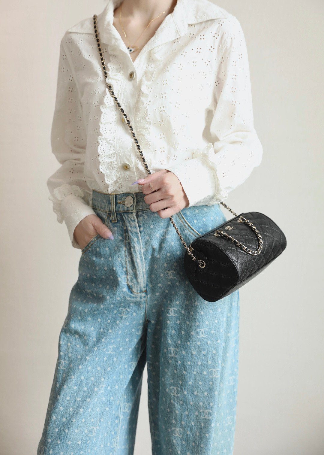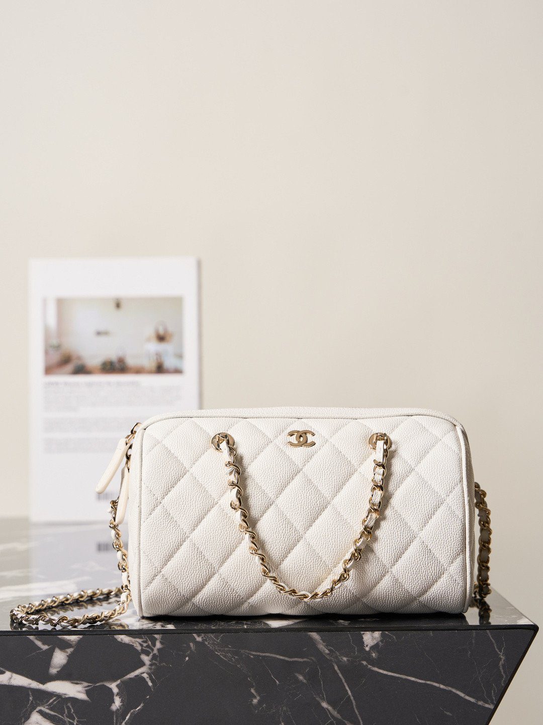 此包袋由著名的 Haas 皮革厂出品的优质中粒纹小牛皮精心打造——这种材质因其作为 Chanel 标志性的“鱼子酱皮”(Caviar Leather)而深受收藏家喜爱,不仅触感奢华且富有纹理,更具备卓越的耐磨特性,轻松抵御日常使用的磨损。包身饰有低调内敛的 CC 标志,并搭配品牌标志性的皮穿链肩带;五金配件均采用惊艳的厚镀 14K 浅金工艺,散发出柔和而精致的璀璨光泽。