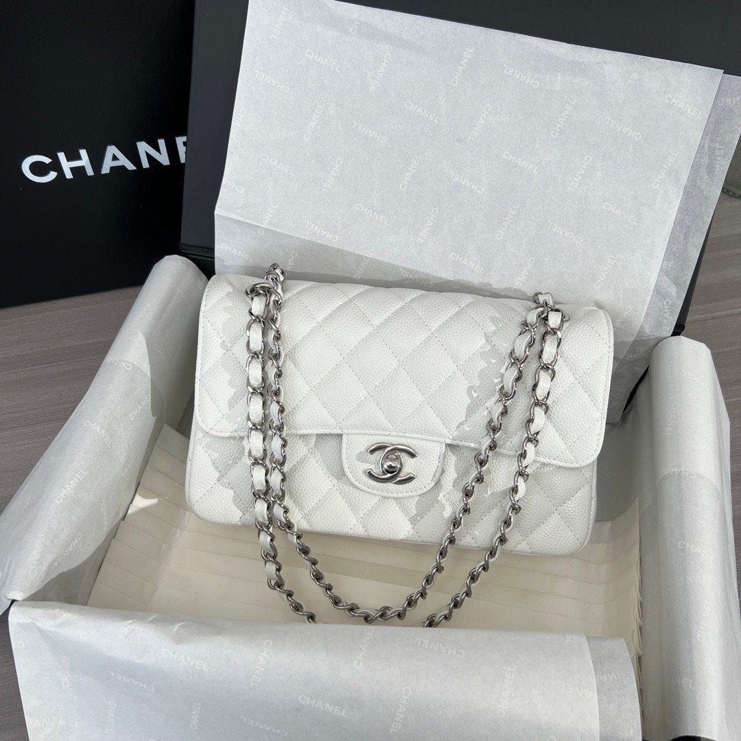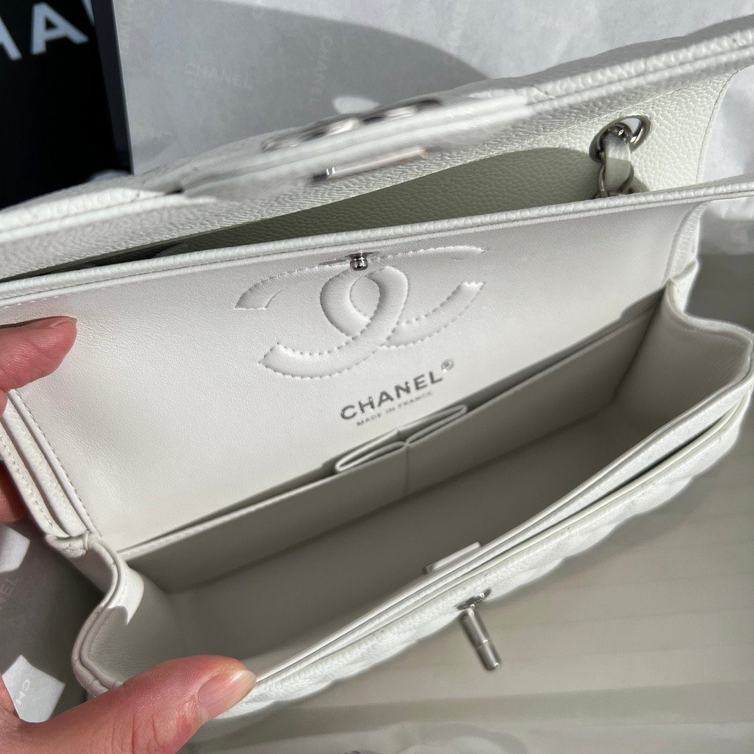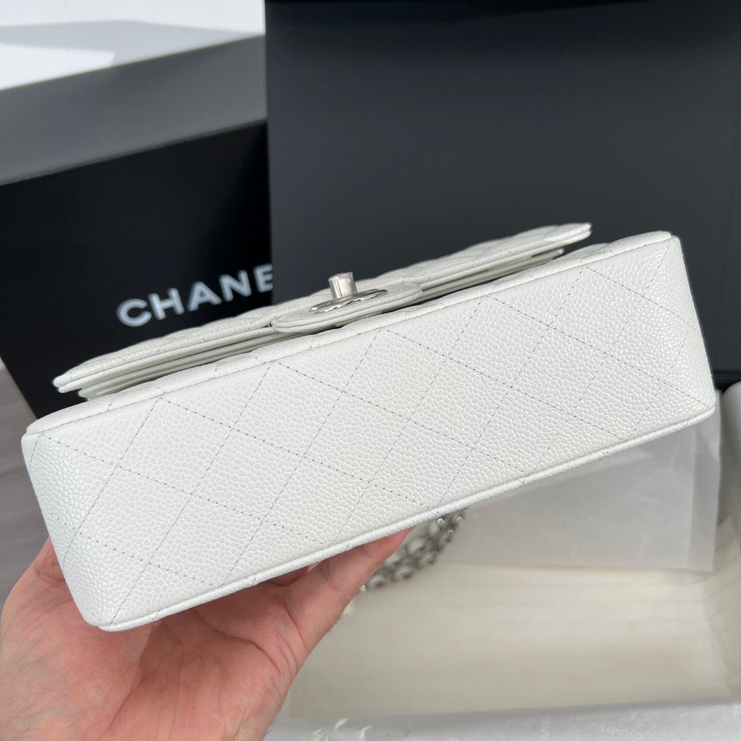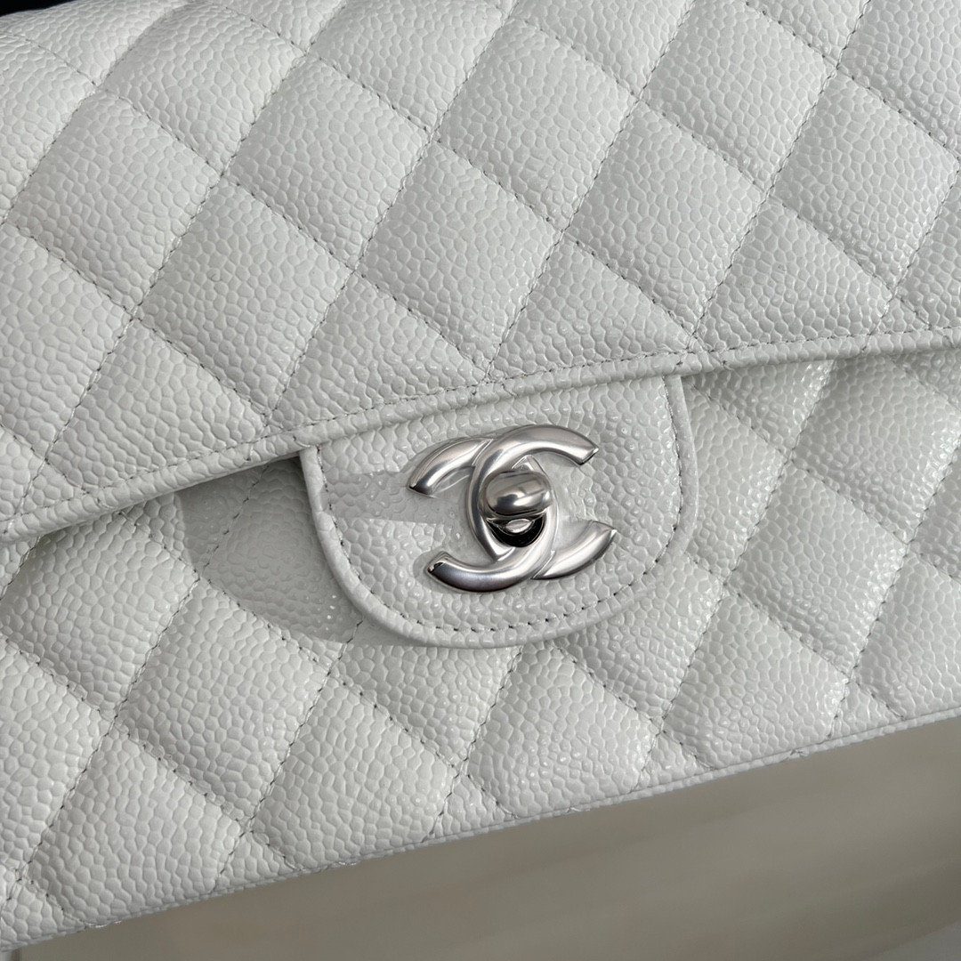 品牌:CHANEL | 款式:经典翻盖包 (Classic Flap Bag) | 材质:粒纹小牛皮(鱼子酱皮) | 颜色:白色 | 五金配件:银色 | 特色:菱格纹绗缝、双层翻盖、CC 旋转锁扣、皮革链条肩带