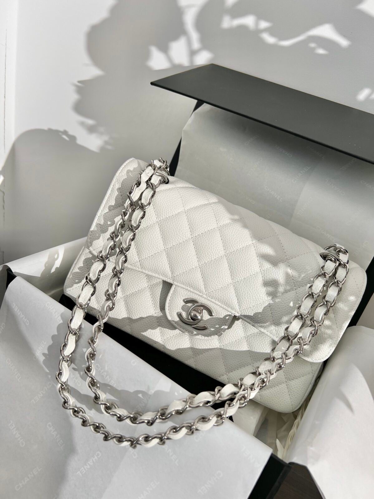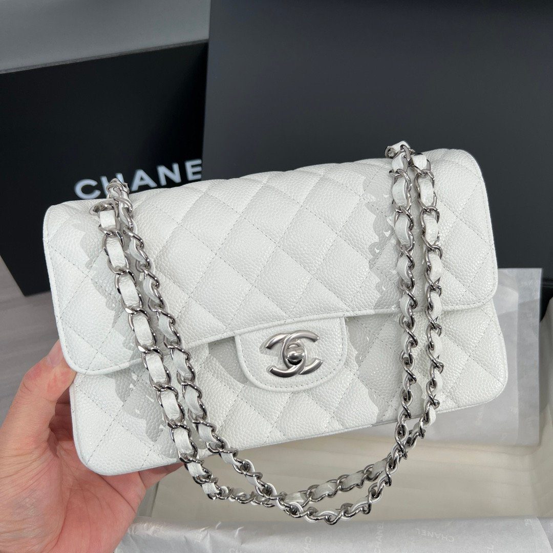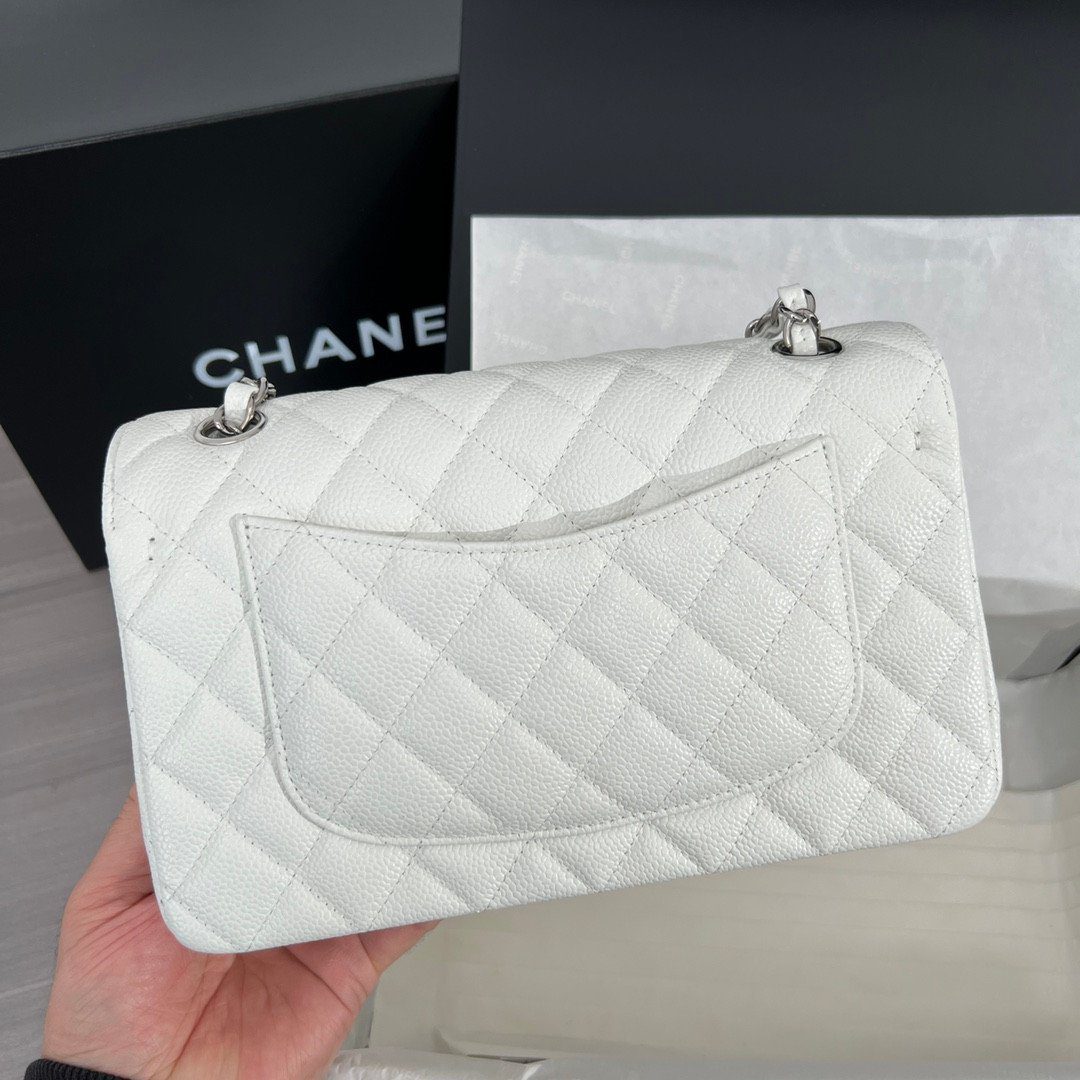 品牌:CHANEL | 款式:经典翻盖包 (Classic Flap Bag) | 材质:粒纹小牛皮(鱼子酱皮) | 颜色:白色 | 五金配件:银色 | 特色:菱格纹绗缝、双层翻盖、CC 旋转锁扣、皮革链条肩带