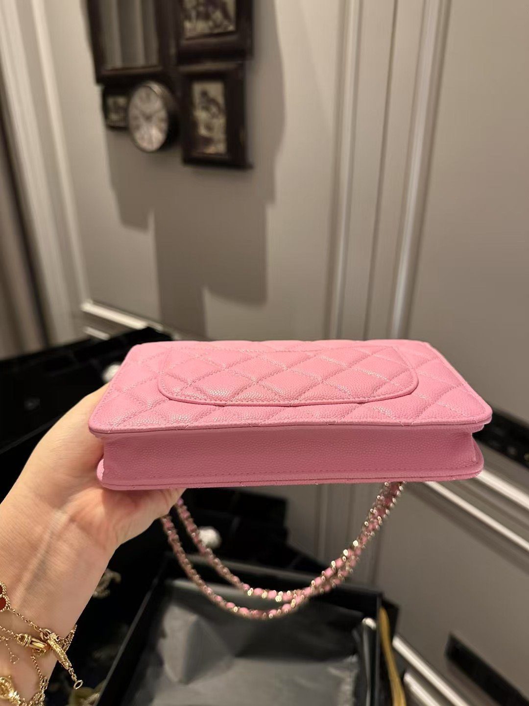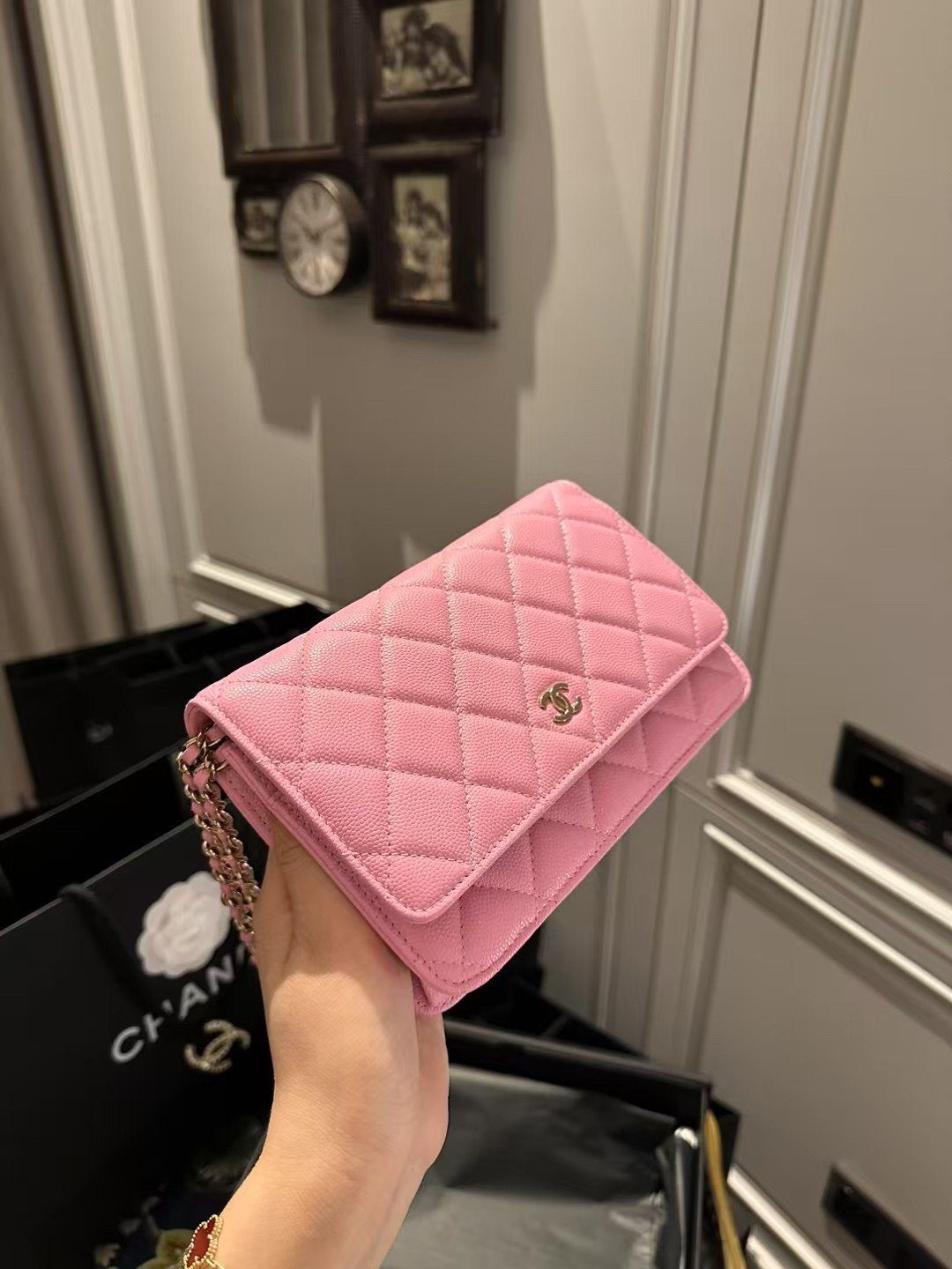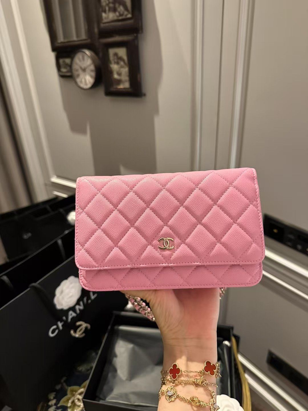 本款 WOC 提供两种经典且极具格调的配色供您选择:永恒的经典黑与明媚的活力粉。包身饰有品牌标志性的菱格纹绗缝图案,并搭配质感丰润、光泽细腻的抛光五金配件。为了让您彻底消除后顾之忧并确保奢华品质的真实性,每一件单品均附带专属的“独立 ID 编码身份认证”。