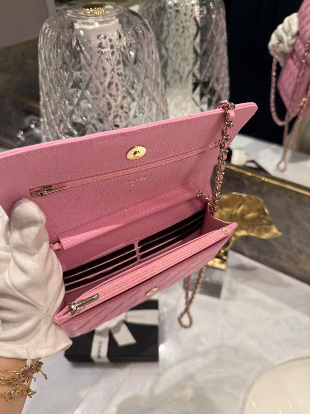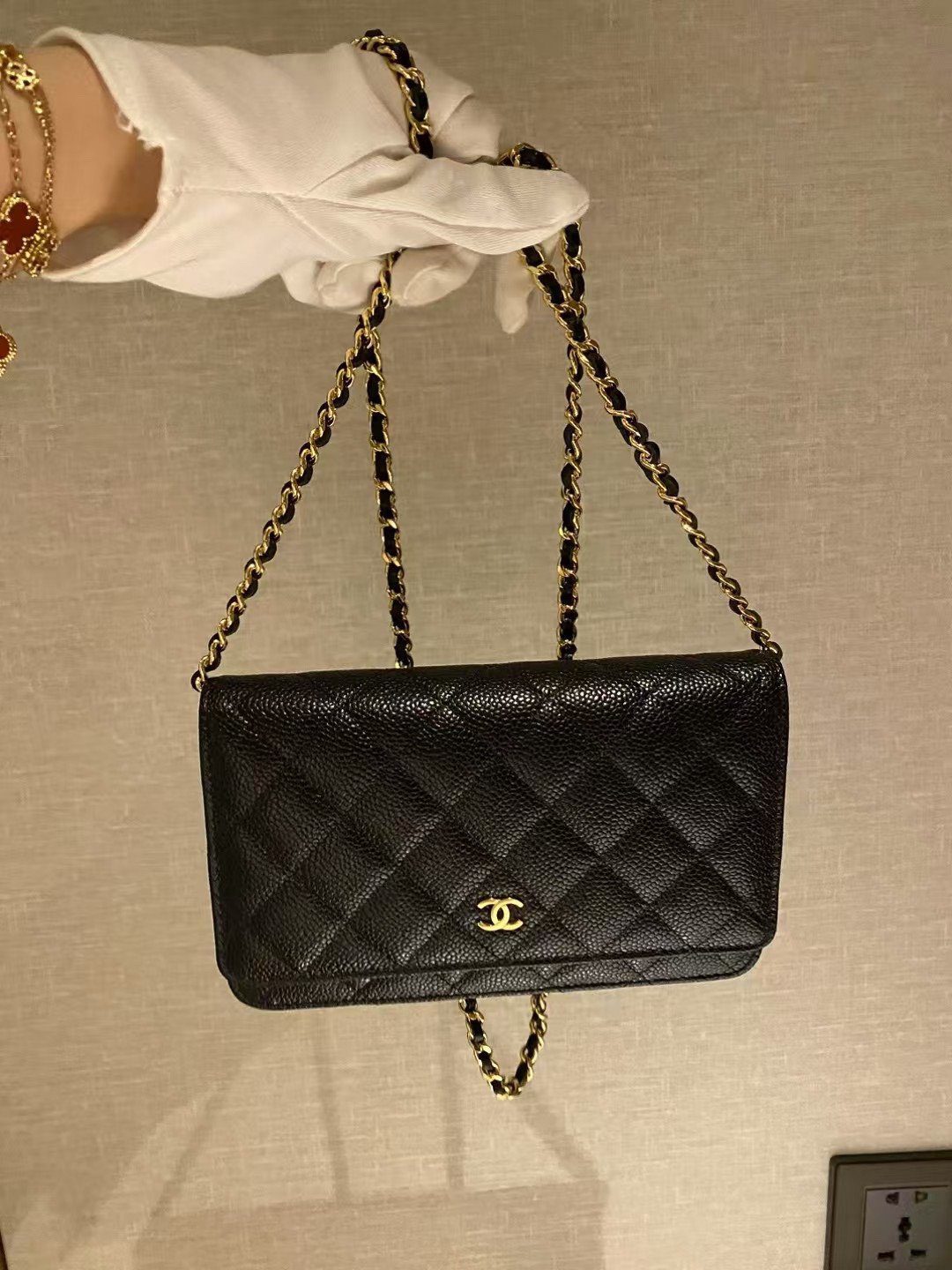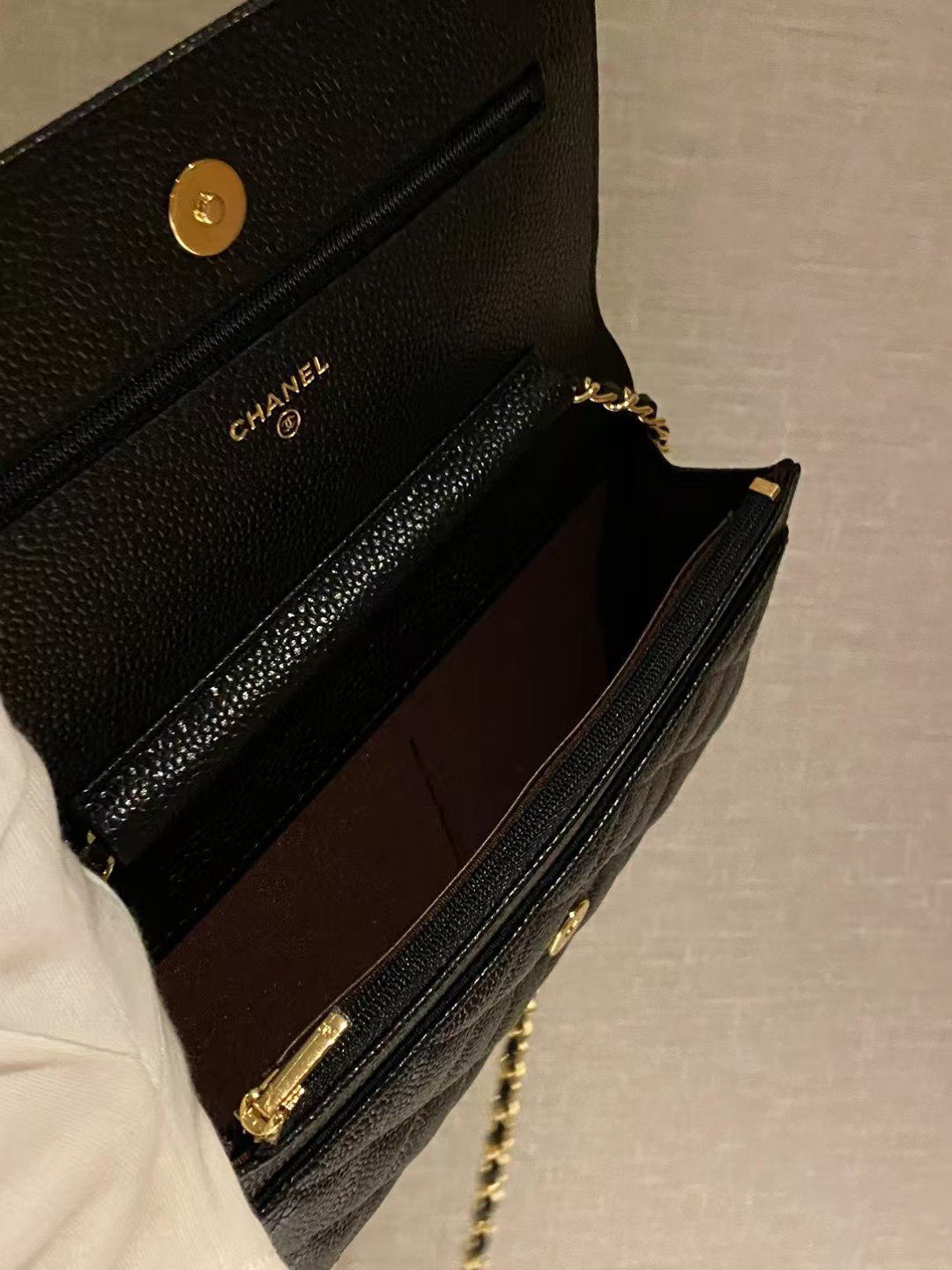 用这款精致非凡的 Chanel 经典链条钱包(WOC)来提升您的收藏品味吧——这是一款兼具永恒魅力与实用功能的完美配饰。此款单品采用享誉业界的“Hass”鱼子酱皮精心打造,所用皮革直接源自原厂供应商的顶级选材。若仔细端详(尤其是在放大镜下观察),您会发现只有真正的鱼子酱皮才具备的那种独特的、不规则的天然纹理;得益于高品质的滚筒染色工艺,皮革表面的天然毛孔痕迹依然清晰可见。