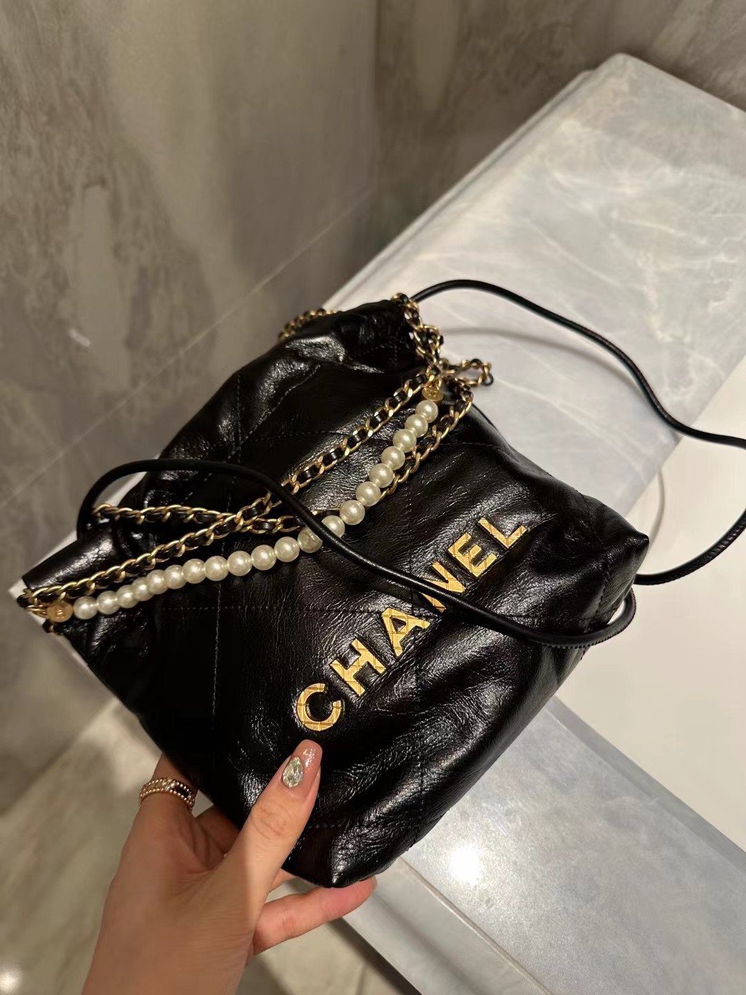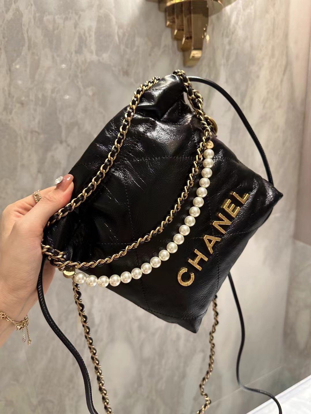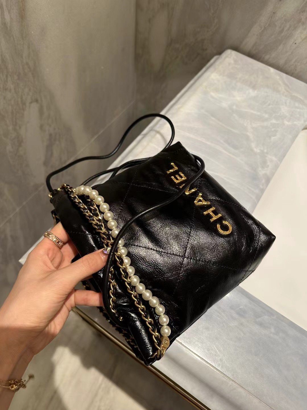 手袋的设计巧夺天工,奢华的珍珠点缀链条与品牌标志性的金色金属配件相映成辉。链条的每一个链节均经过精密的 3D 立体切割,呈现出平整的切面与复古做旧的质感,与手袋主体那光洁亮泽的皮革表面形成了完美的审美反差。凭借其摩登的抽绳廓形与经久不衰的细节设计,这款手袋堪称当代奢华风范的典范之作。