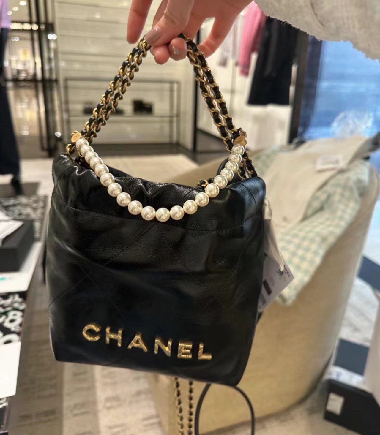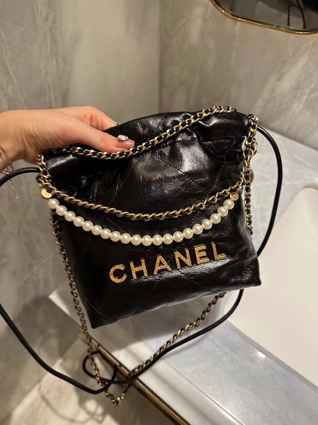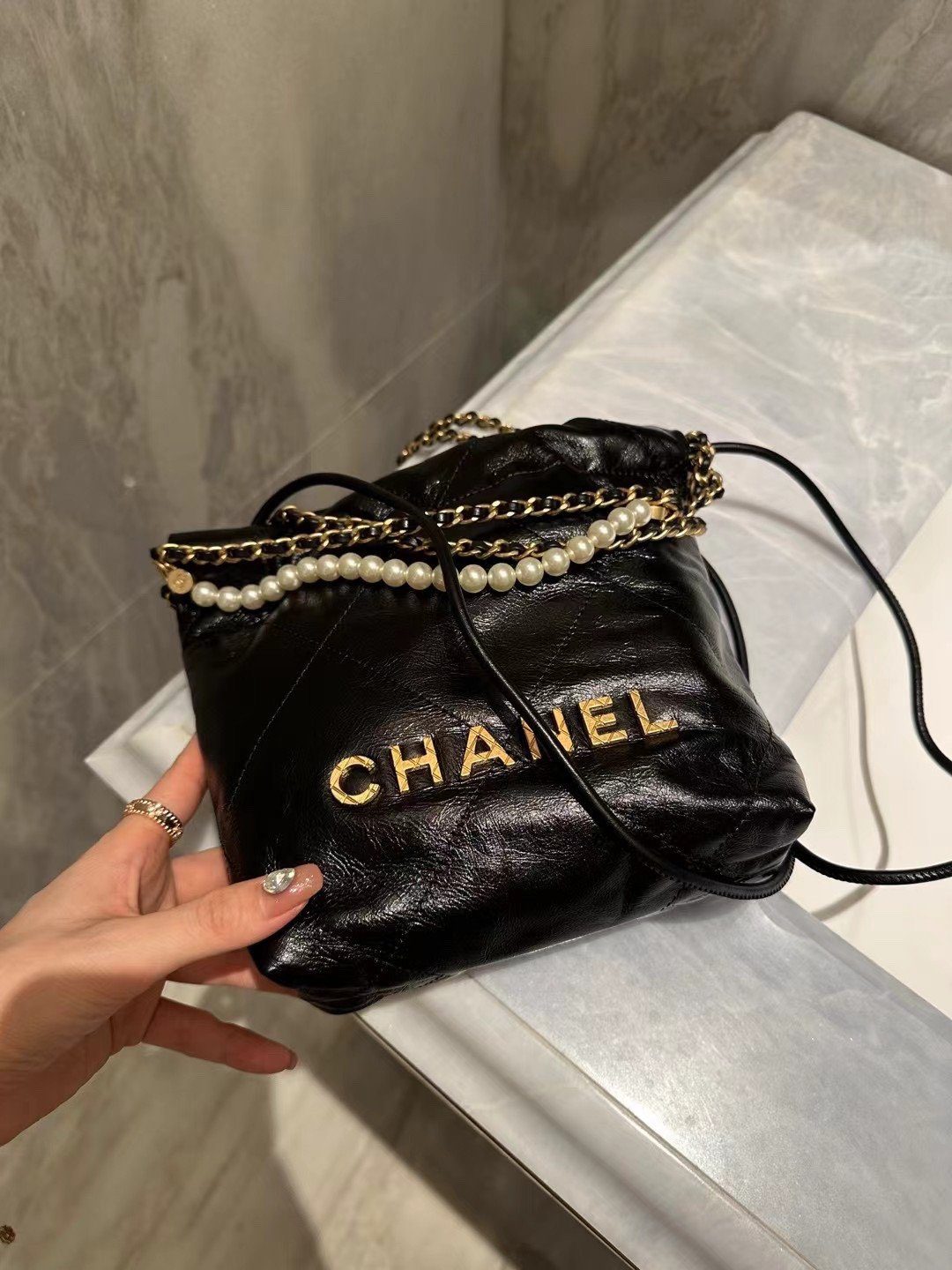 手袋的设计巧夺天工,奢华的珍珠点缀链条与品牌标志性的金色金属配件相映成辉。链条的每一个链节均经过精密的 3D 立体切割,呈现出平整的切面与复古做旧的质感,与手袋主体那光洁亮泽的皮革表面形成了完美的审美反差。凭借其摩登的抽绳廓形与经久不衰的细节设计,这款手袋堪称当代奢华风范的典范之作。