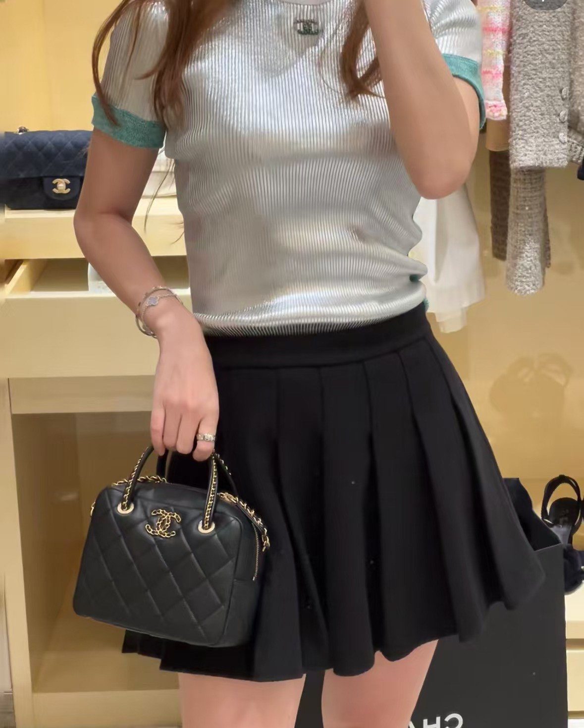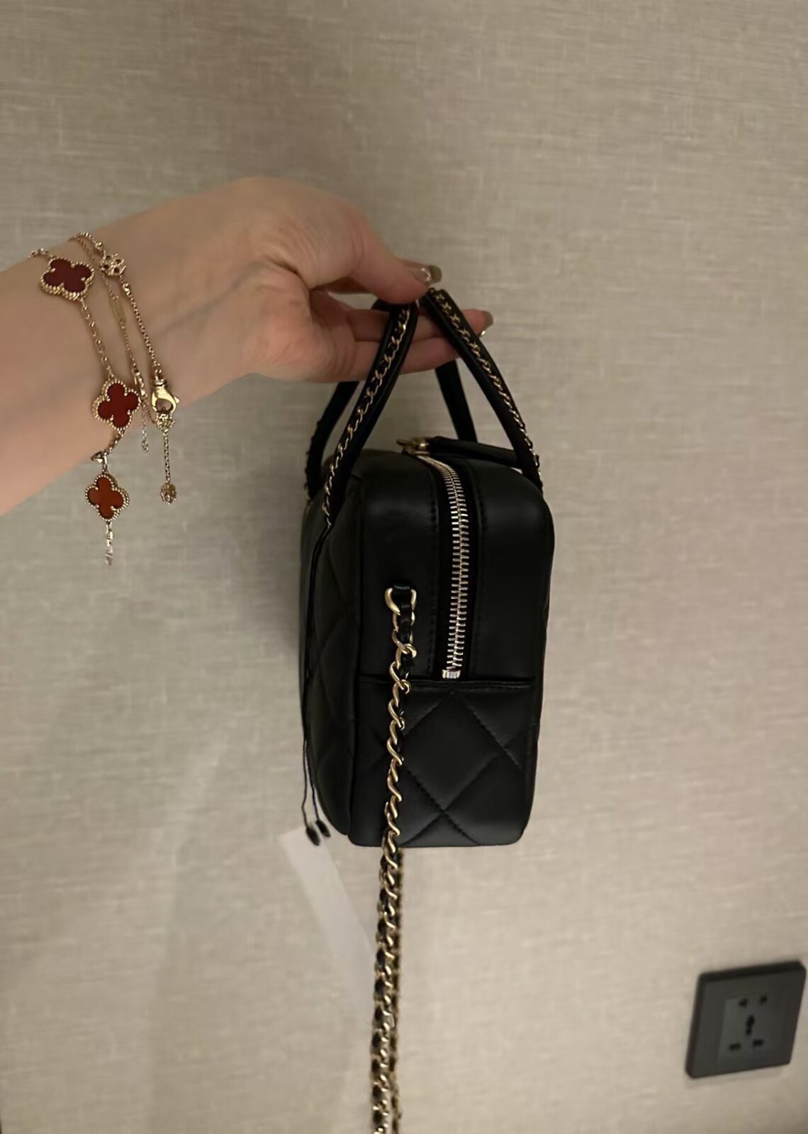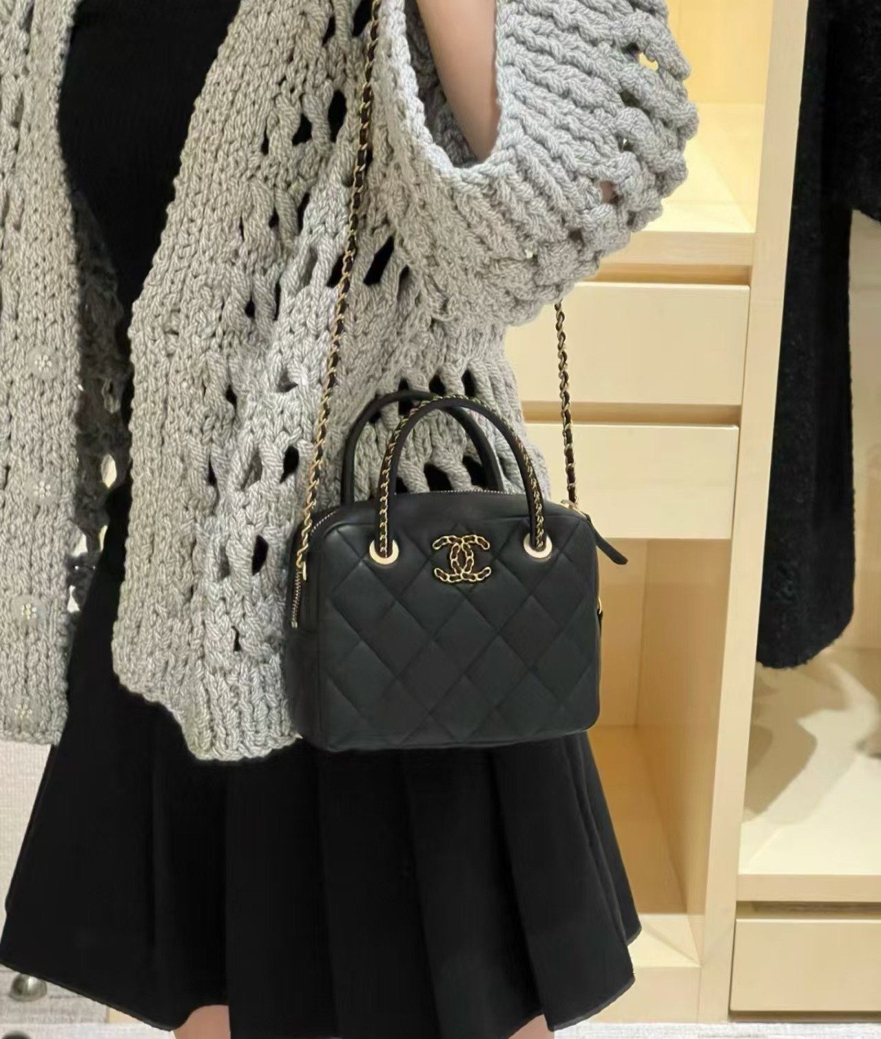 设计细节:菱格绗缝、顶部提手、皮穿链肩带、双拉链开合
