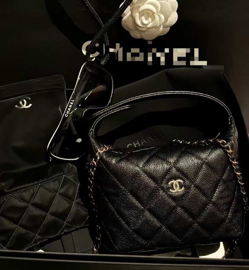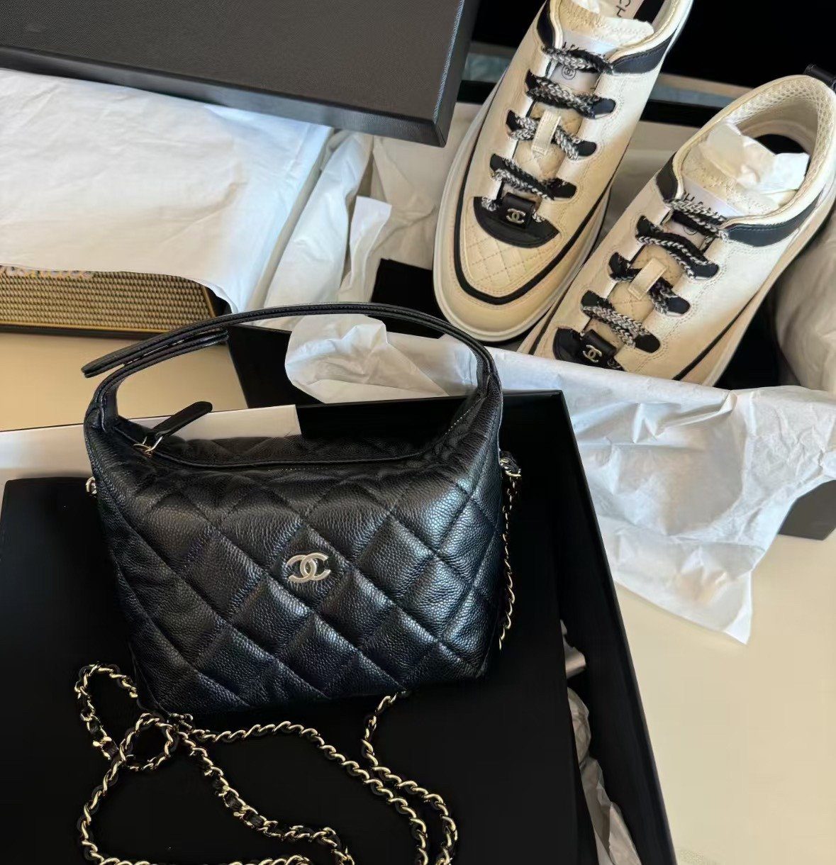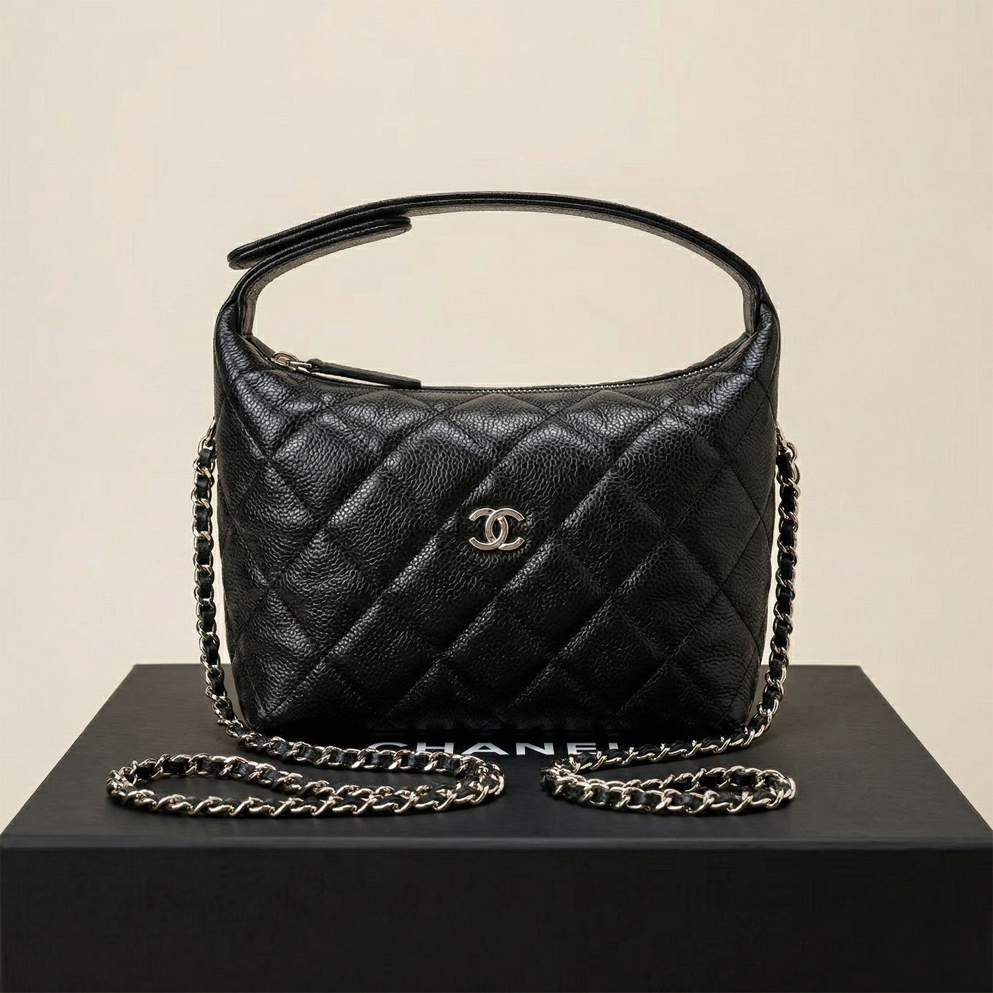 为了满足现代生活的实用需求,这款 Hobo 包配备了舒适的顶部皮革提手,便于手提;同时配有一条经典的银色金属与皮革拼接链条肩带,为佩戴方式增添了更多灵活性。包身内部空间紧凑却布局高效,并配有顶部拉链封口以确保物品安全。包袋置于标志性的黑色 Chanel 礼盒之上,进一步彰显了其尊贵非凡的品牌血统。
