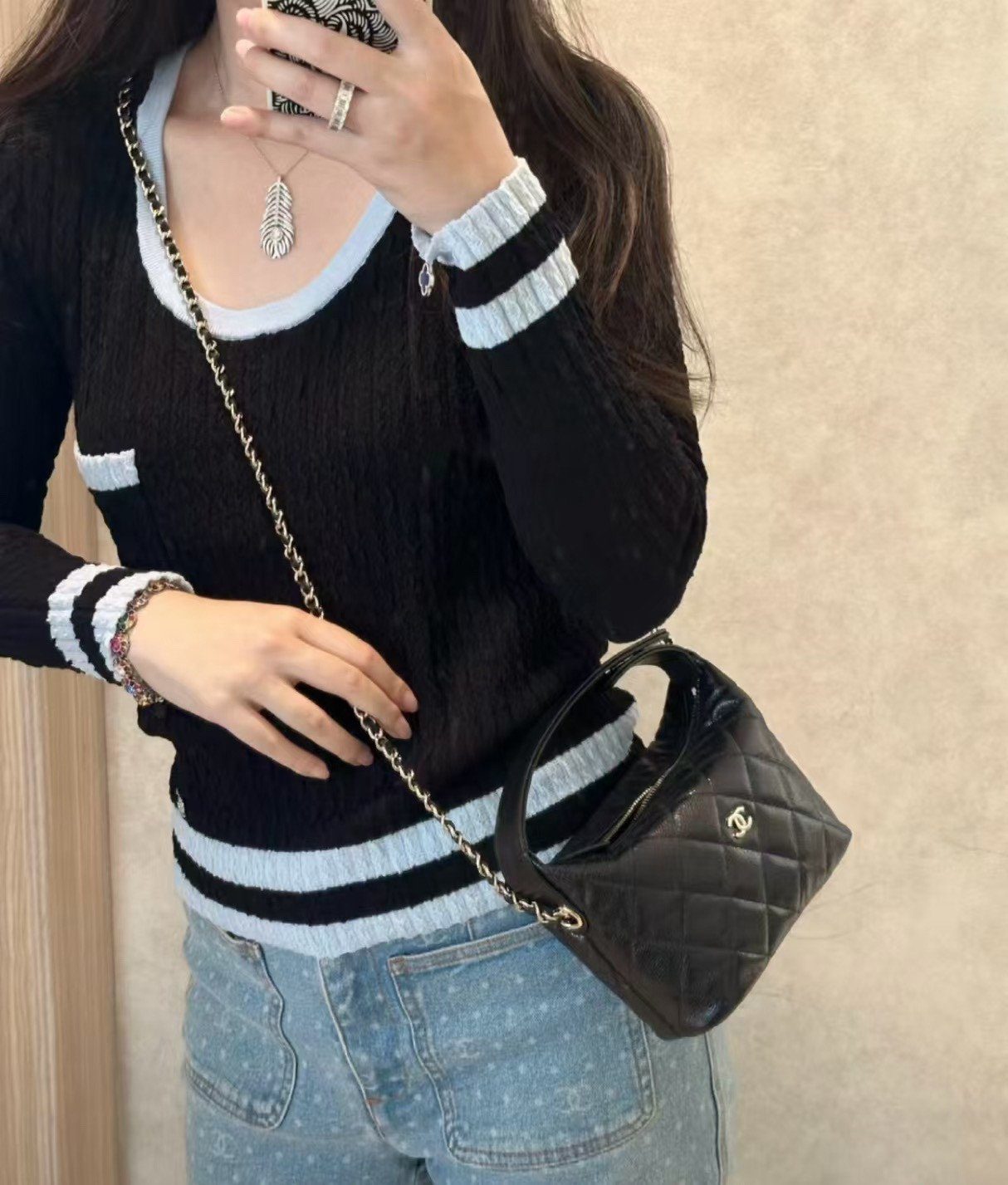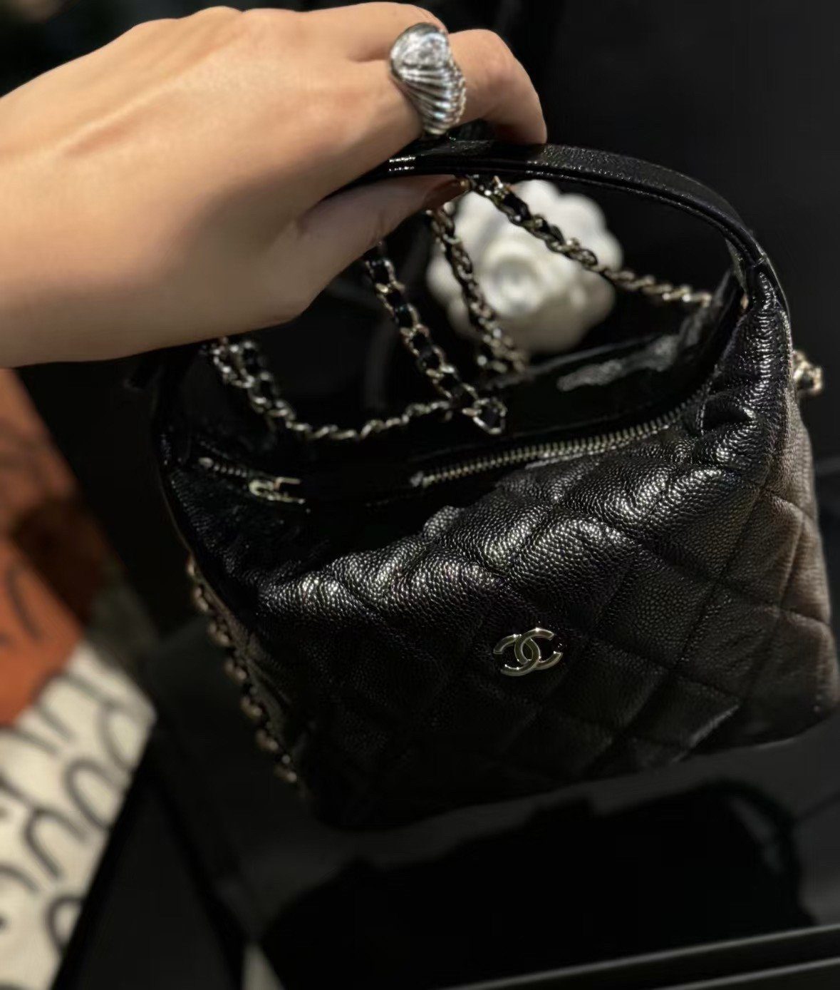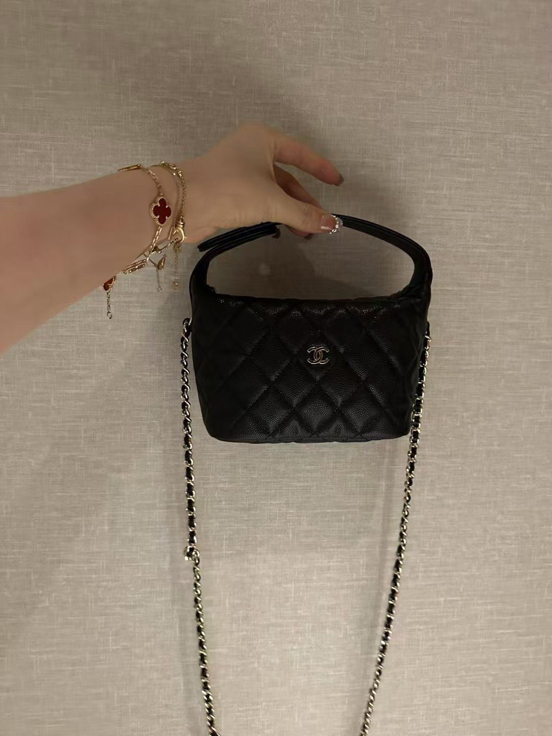 为了满足现代生活的实用需求,这款 Hobo 包配备了舒适的顶部皮革提手,便于手提;同时配有一条经典的银色金属与皮革拼接链条肩带,为佩戴方式增添了更多灵活性。包身内部空间紧凑却布局高效,并配有顶部拉链封口以确保物品安全。包袋置于标志性的黑色 Chanel 礼盒之上,进一步彰显了其尊贵非凡的品牌血统。