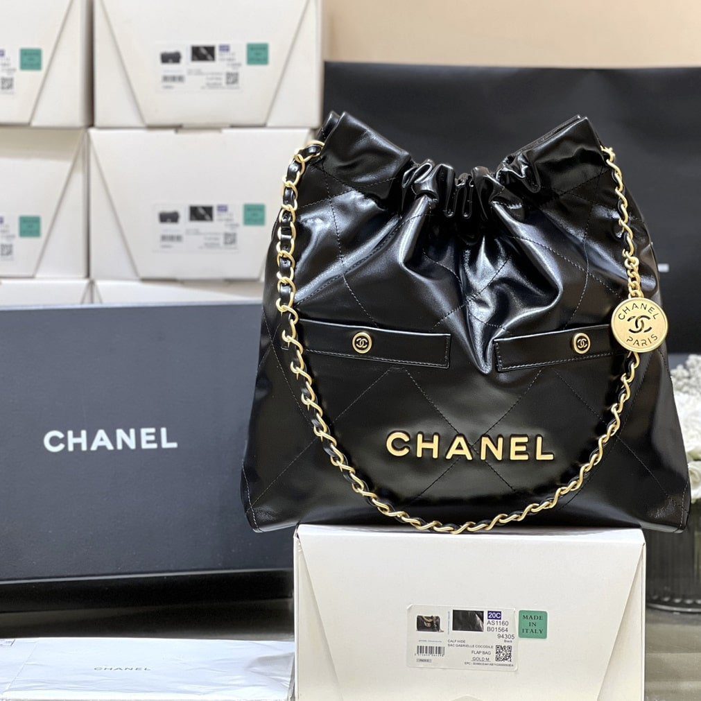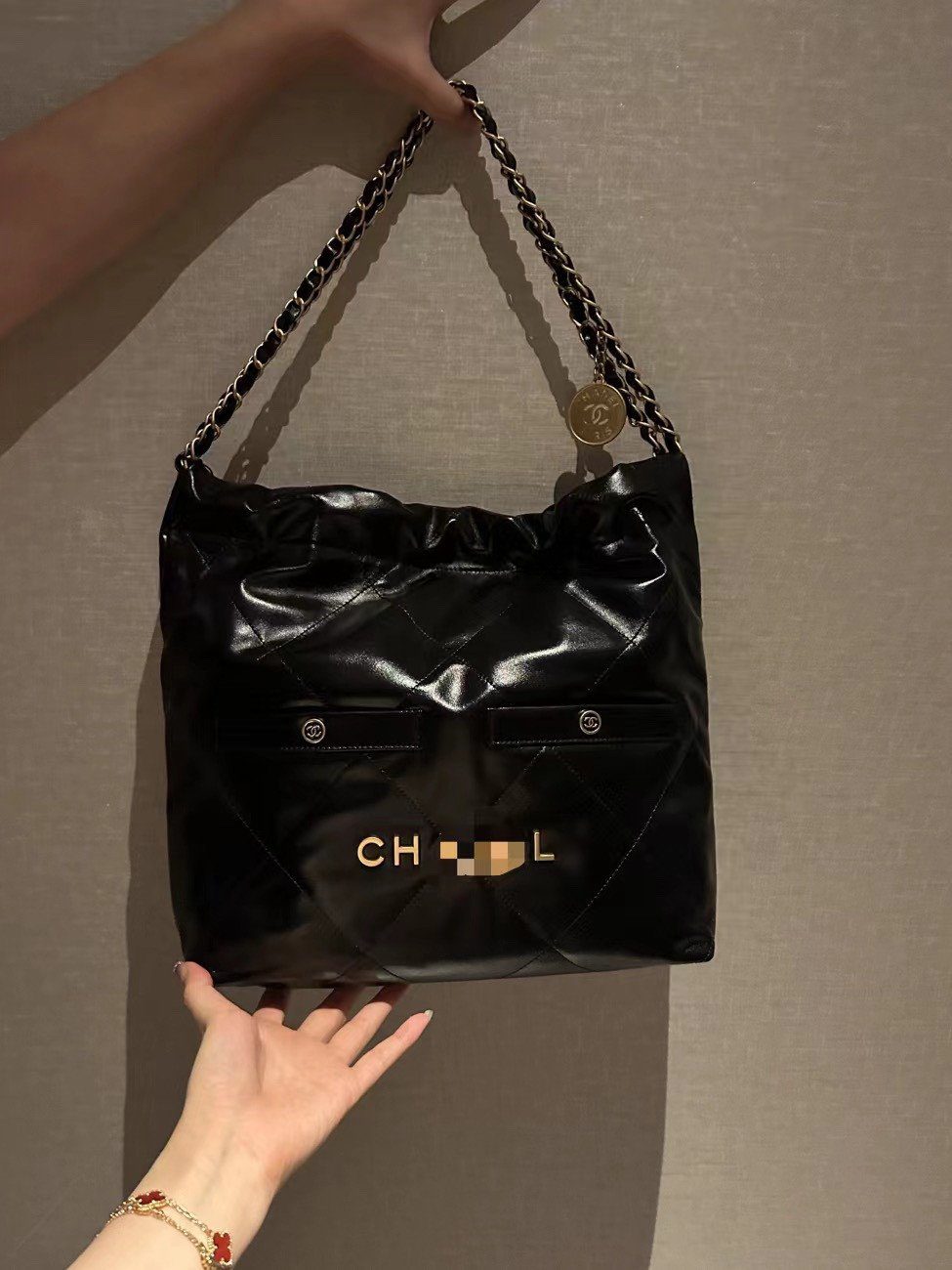 包身外侧饰有醒目且光洁的金黄色“CHANEL”字母标识。包身正面点缀着两枚独特的金色饰面 Chanel 双 C 纽扣。链条肩带上悬挂着一枚硕大且工艺精湛的金银双色 Chanel 徽章吊坠,为整款包袋增添了一抹奢华的层次感。