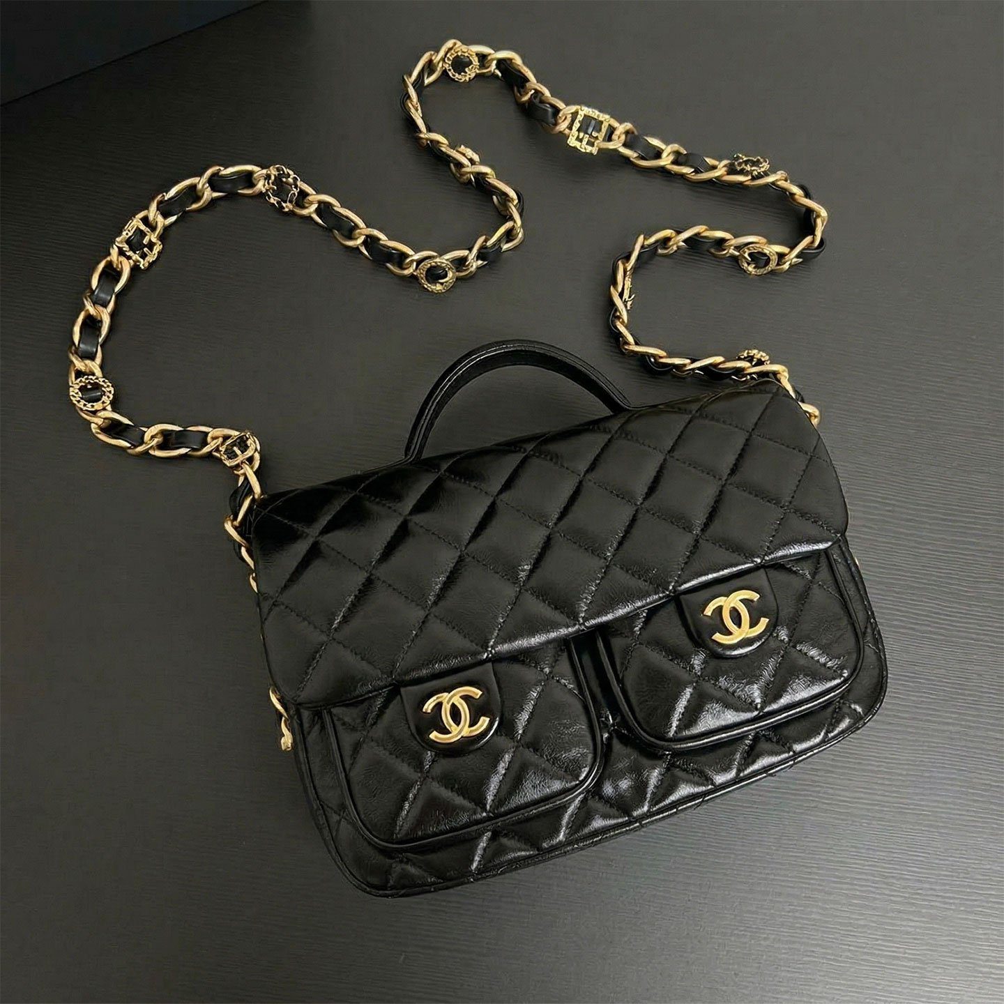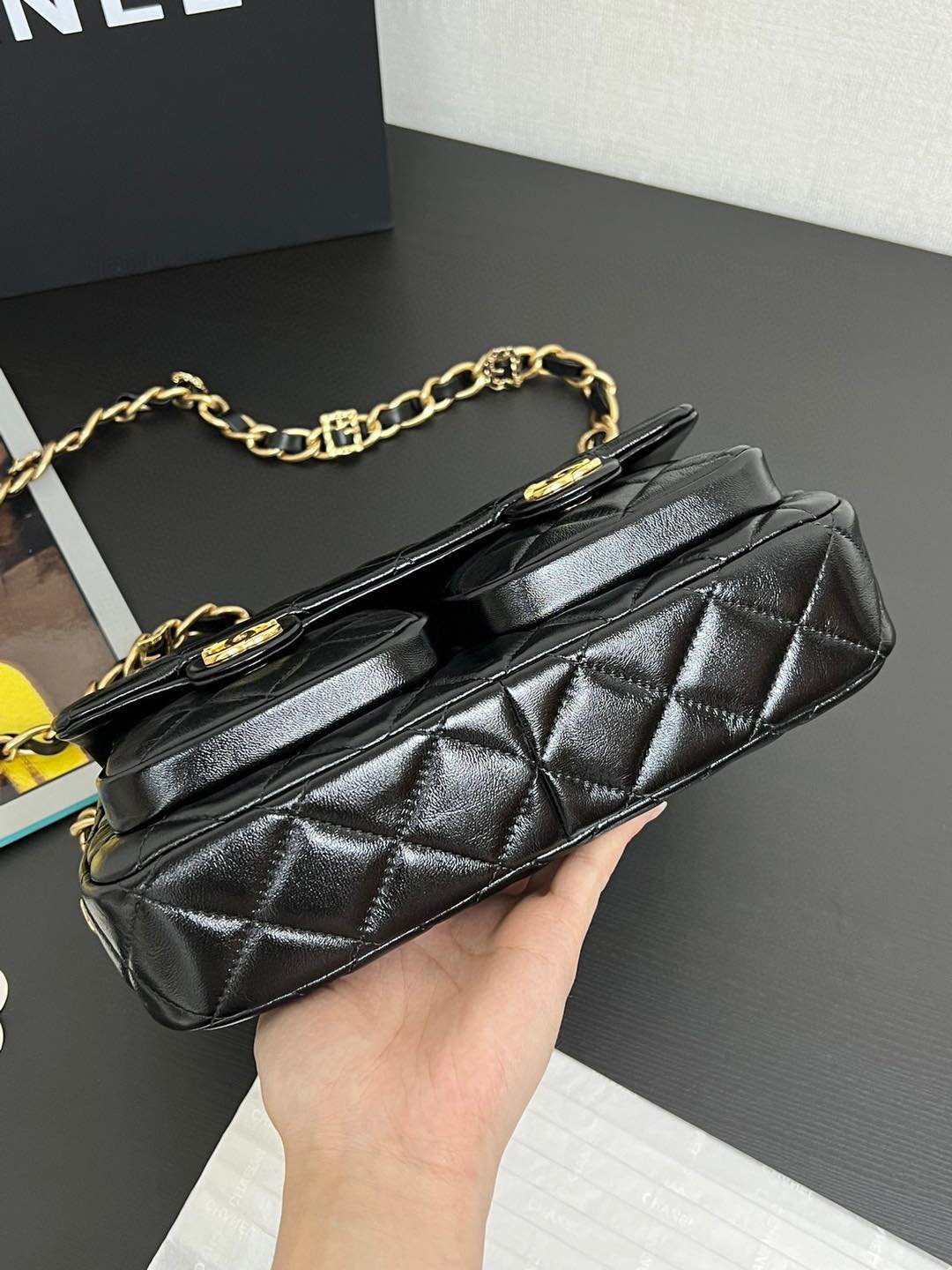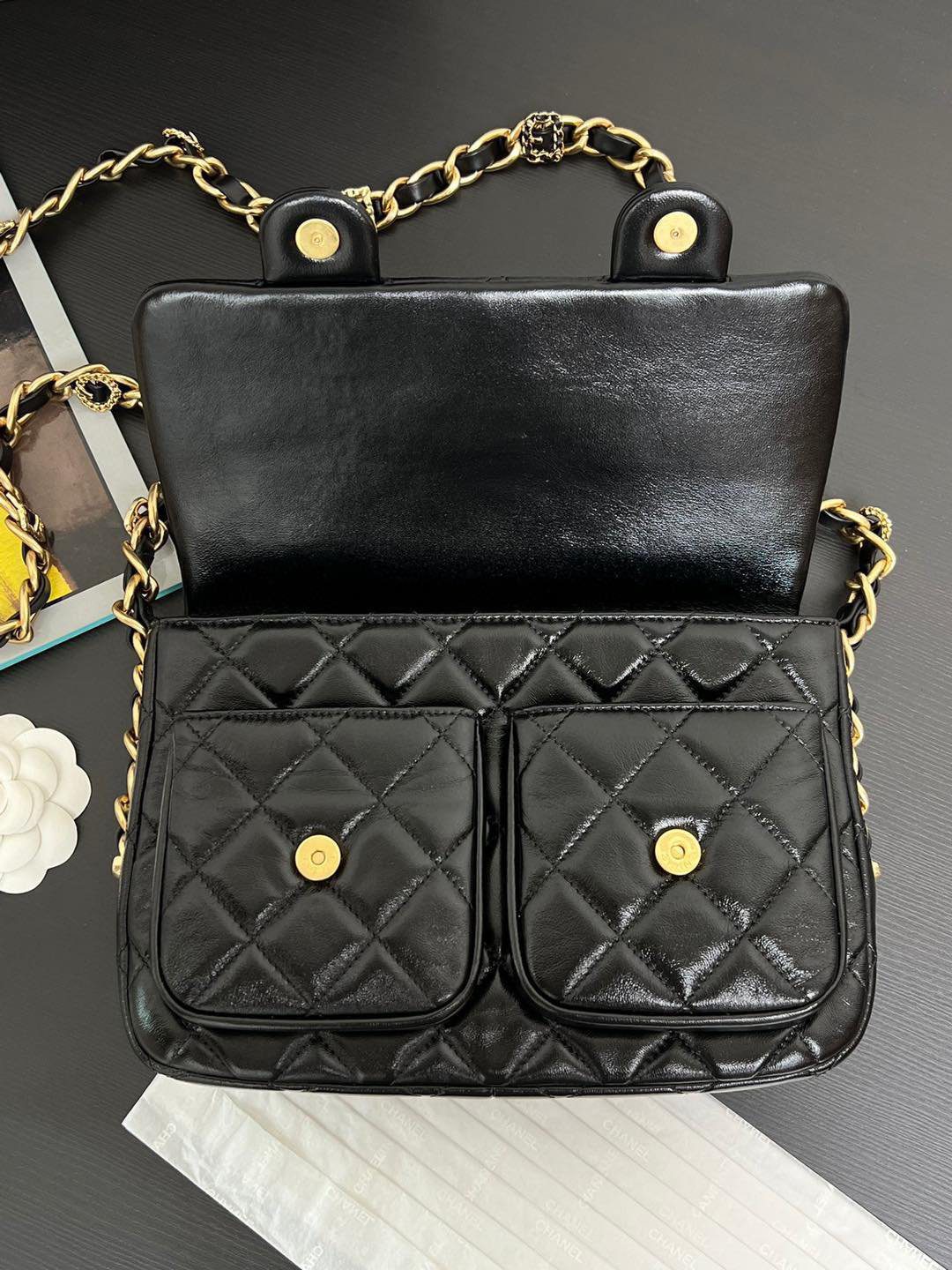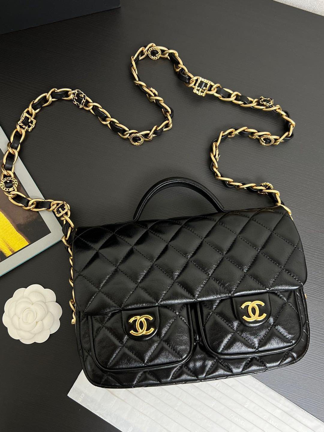 真正令这款包袋脱颖而出的,是其通过特殊渠道独家定制的五金配件。五金基底采用实心铜材打造,并经过厚实的24K复古金电镀处理。它历经精密的做旧工艺,呈现出斑驳的古董质感,随后再覆上一层明亮的电镀封层。这种繁复的多层工艺造就了一种浓郁而温润的金色光泽,这是普通包袋上绝无仅有的独特色调。包身配有优雅的顶部提手、粗链条交织肩带,以及两个饰有标志性 CC 旋扣的便捷前置口袋;整款包袋将复古魅力与现代实用功能完美融合,相得益彰。