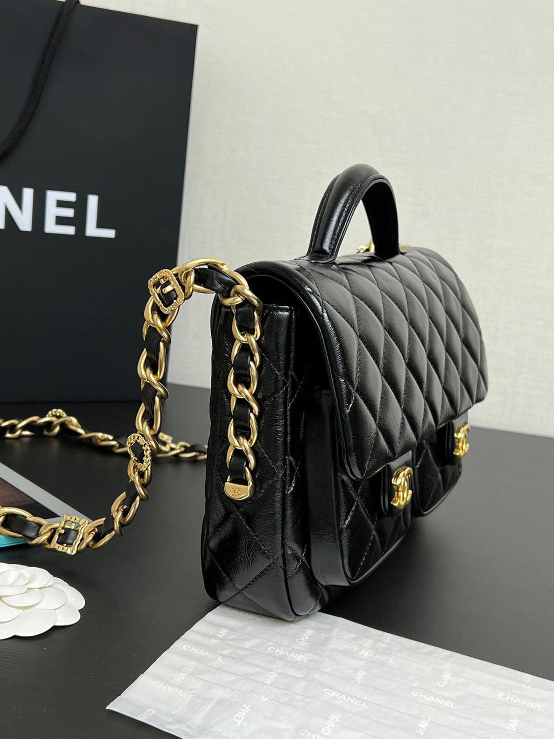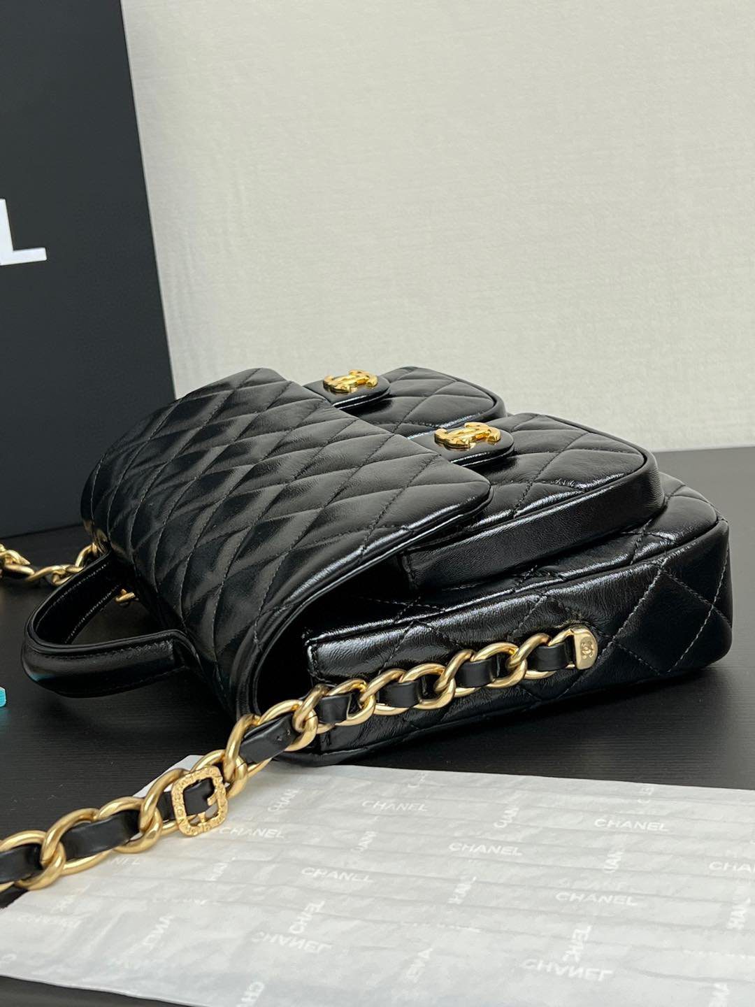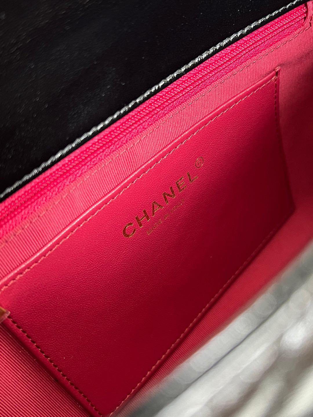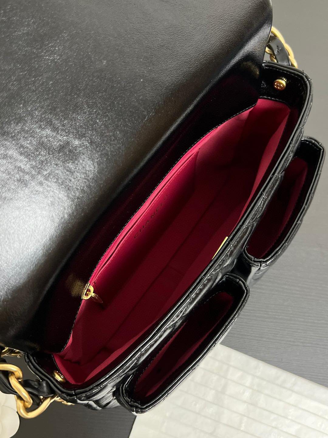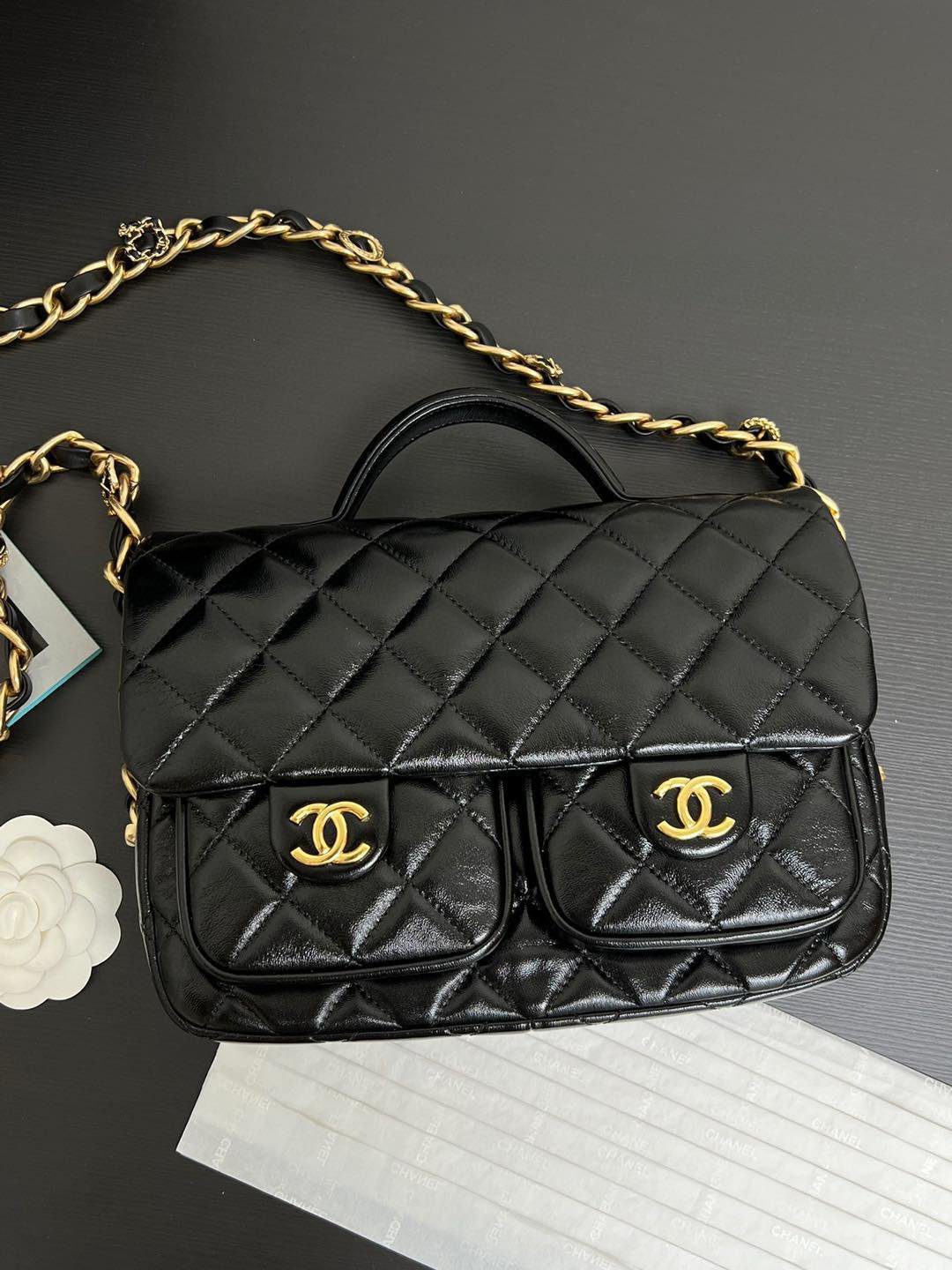 真正令这款包袋脱颖而出的,是其通过特殊渠道独家定制的五金配件。五金基底采用实心铜材打造,并经过厚实的24K复古金电镀处理。它历经精密的做旧工艺,呈现出斑驳的古董质感,随后再覆上一层明亮的电镀封层。这种繁复的多层工艺造就了一种浓郁而温润的金色光泽,这是普通包袋上绝无仅有的独特色调。包身配有优雅的顶部提手、粗链条交织肩带,以及两个饰有标志性 CC 旋扣的便捷前置口袋;整款包袋将复古魅力与现代实用功能完美融合,相得益彰。