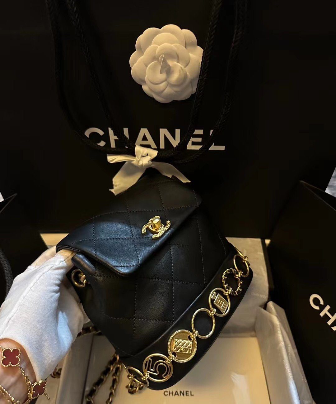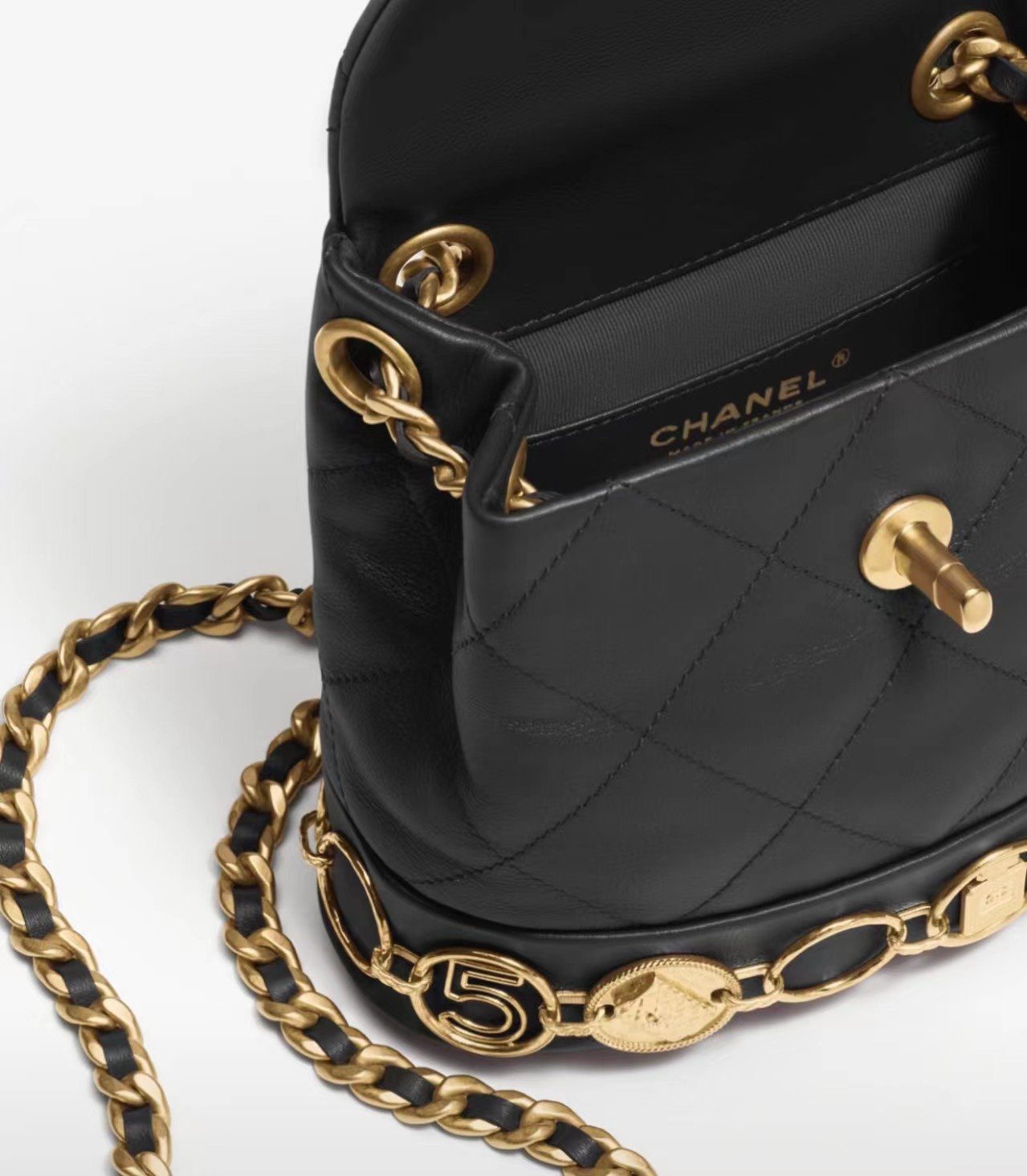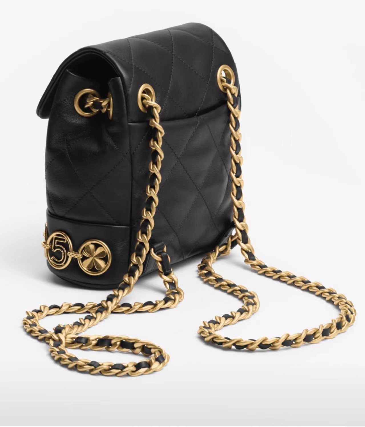 这款设计的真正点睛之笔在于其底部独特的装饰细节——饰有一系列标志性的“金币”吊坠,其中包括经典的“No. 5”字样及 Chanel 香水瓶造型图案。精湛的工艺同样体现在五金配件上:所有金属部件均采用厚实的纯24K金电镀工艺。经过严苛的八道工序电镀处理,金属表面呈现出完美无瑕的璀璨光泽,绝无任何镀层堆积或水波纹痕迹。精准的雕刻细节与精细的二次抛光效果,充分展现了品牌工匠所倾注的顶级匠心,其工艺水准远超同侪。