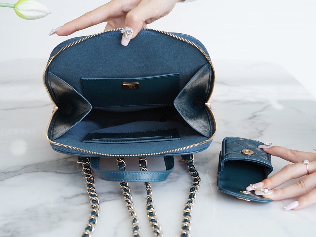 包身轮廓沿袭了香奈儿数十年来标志性的菱格纹绗缝设计。包身正面饰有品牌标志性的双C交织Logo,采用精致的金色饰面,与经典的黑色或深邃的祖母绿色调相得益彰。这款 22A 系列最独特的亮点之一,是其集成且可拆卸的迷你耳机收纳包。这一多功能配件既可夹扣在包身正面,也可移动至链条肩带的不同位置,为您的 AirPods 或随身小物提供了一个专属的收纳空间。