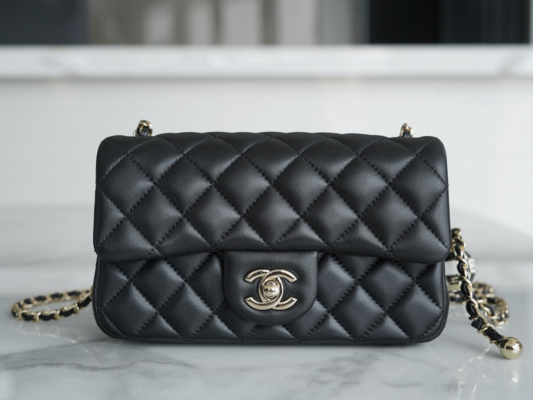 这款迷你长方形翻盖包(Mini Rectangular Flap Bag)选用最上乘的优质绗缝小羊皮精制而成,触感如黄油般柔滑细腻,散发出一种独属于 Chanel 的迷人光泽。标志性的菱格纹绗缝工艺一丝不苟,营造出一种饱满且富有弹性的“枕头”般立体效果,赋予包身深邃的层次感与奢华质感。包身正面饰有标志性的双 C 互扣式旋锁,采用抛光金色金属配件打造,堪称巴黎优雅风范的经典象征。