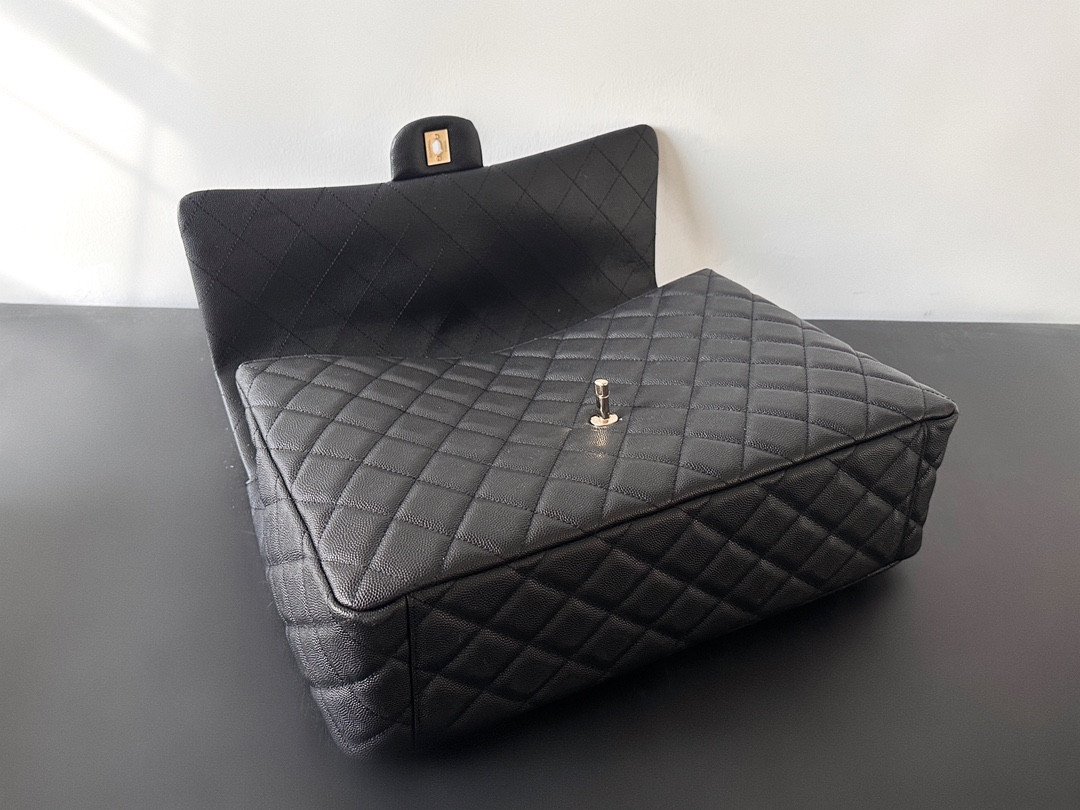 对于一款旅行包袋而言,材质的选择至关重要;而 Chanel 此次选用的特殊“绗缝荔枝纹小牛皮”(Quilted Pebbled Grain Calfskin),无疑交出了一份令人满意的答卷。这种独特的纹理融合了传统绗缝皮革的丰润质感与耐磨的荔枝纹饰面。这种巧妙的结合确保了包袋在保留其应有的柔软触感及标志性绗缝工艺的同时,亦具备极强的抗刮擦能力,足以抵御旅途中的日常磨损。这种坚韧耐用的皮革材质,与品牌标志性的精致“香槟金”色五金——包括双C锁扣及金属链条肩带——形成了美妙的对比;这种色调柔和且更显优雅的金色,与深邃的黑色皮革相得益彰,完美互衬。