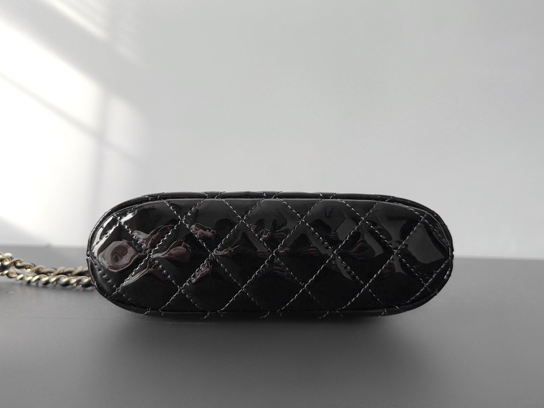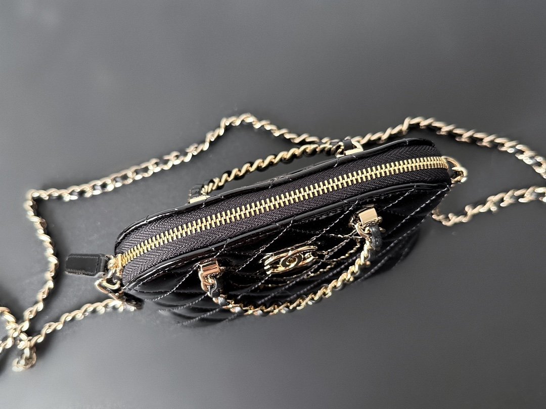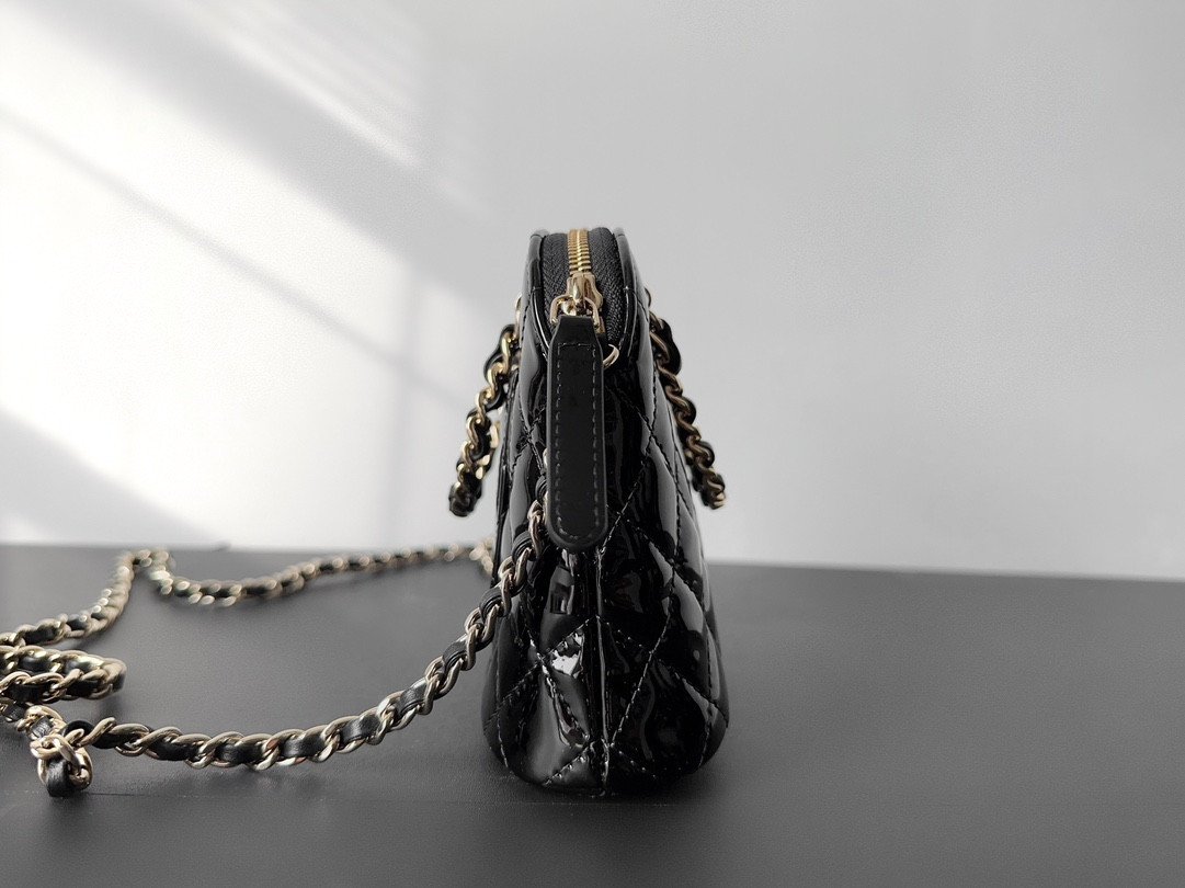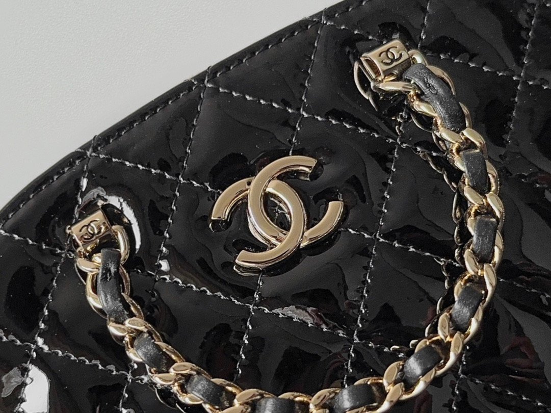 包身正中央镶嵌着标志性的双 C 互扣式 Logo,采用抛光金色五金件打造。这一抹金色点缀与冷酷的黑色漆皮形成了温暖而奢华的对比。对细节的极致追求同样体现在包袋顶部:独特的皮穿链手柄设计,为您提供了优雅精致的手提佩戴方式。而对于偏爱解放双手的佩戴者,随包附带的长款斜挎链条——沿袭了 Chanel 享誉全球的“皮穿链”经典设计——可完美地垂挂于肩头。