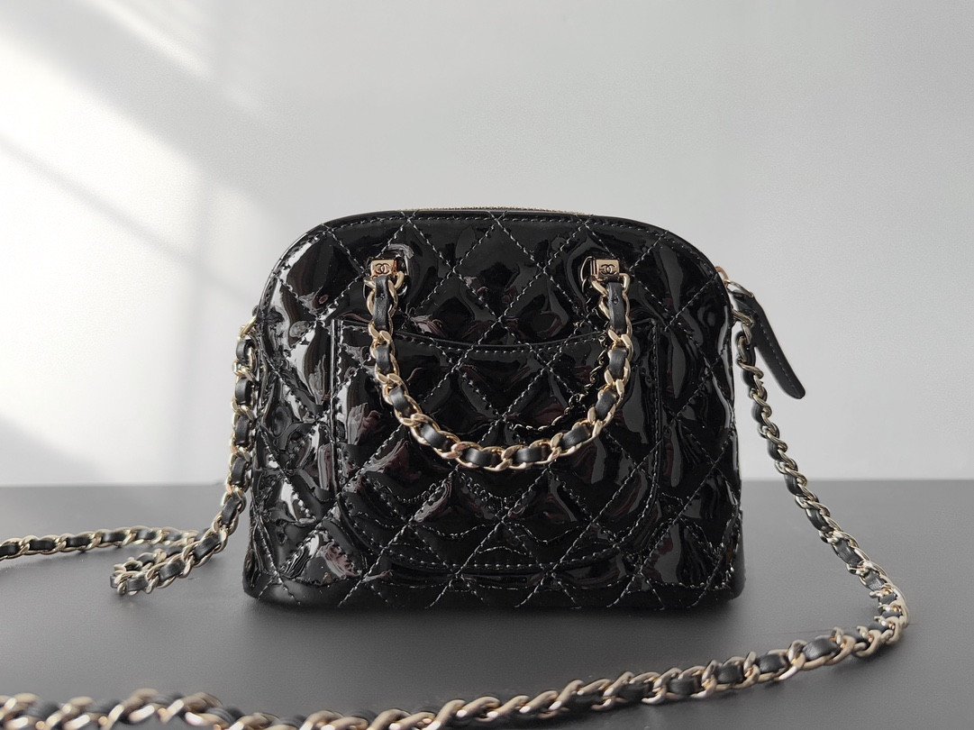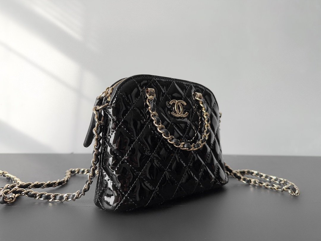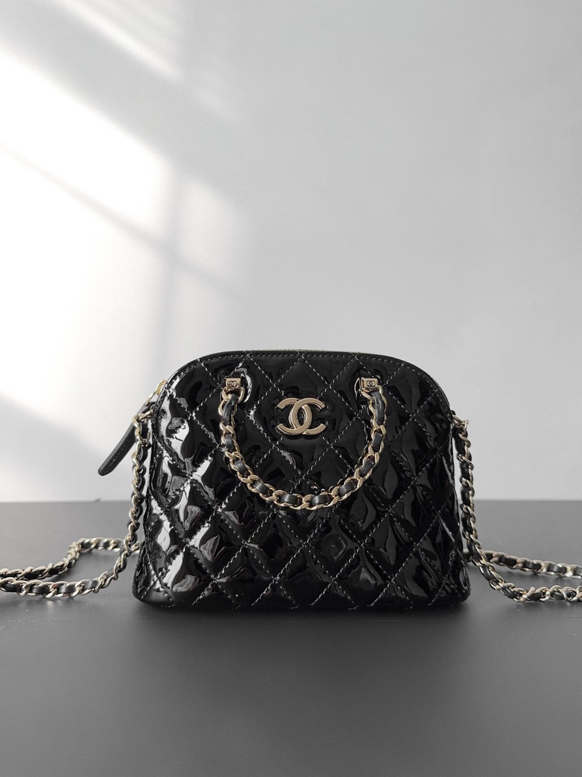 包身正中央镶嵌着标志性的双 C 互扣式 Logo,采用抛光金色五金件打造。这一抹金色点缀与冷酷的黑色漆皮形成了温暖而奢华的对比。对细节的极致追求同样体现在包袋顶部:独特的皮穿链手柄设计,为您提供了优雅精致的手提佩戴方式。而对于偏爱解放双手的佩戴者,随包附带的长款斜挎链条——沿袭了 Chanel 享誉全球的“皮穿链”经典设计——可完美地垂挂于肩头。