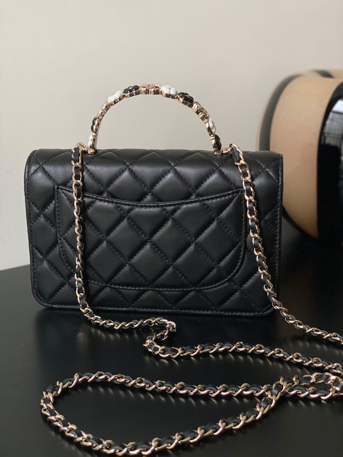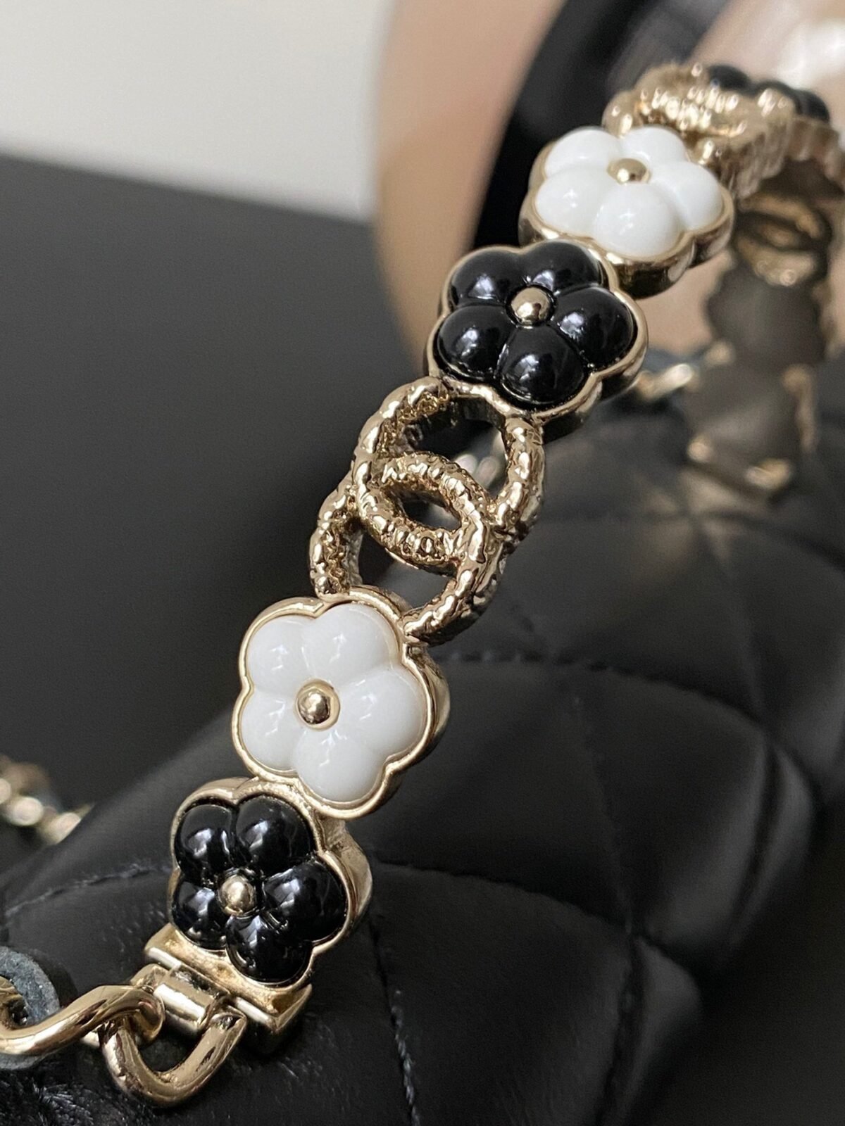这款包袋最引人注目、也最“光彩照人”的特征,无疑便是其独特的手柄设计。它绝非那种常见的皮革或链条手柄,而是由一系列精致绝伦的珐琅山茶花串联而成。这些小巧且工艺精湛的花朵采用了对比强烈的黑白配色,完美捕捉了香奈儿女士(Mademoiselle Chanel)挚爱之花的审美精髓。