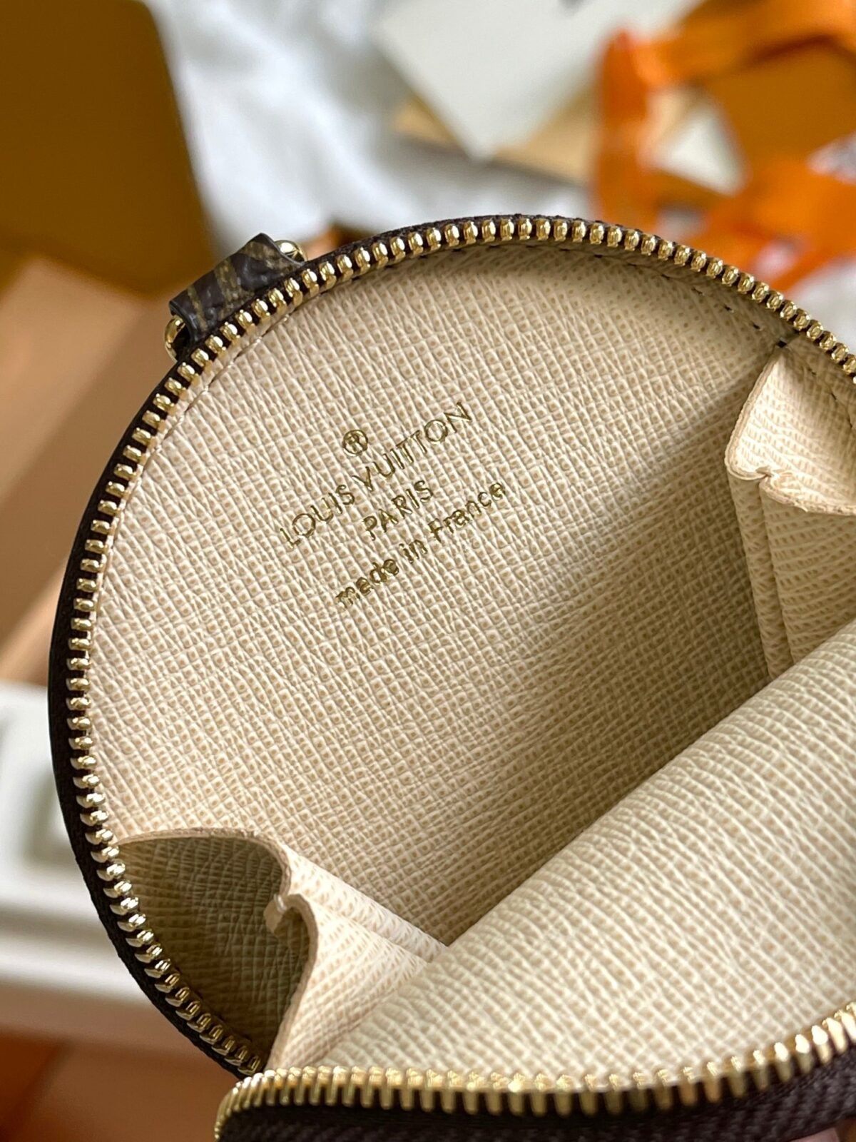 圆形零钱包:可将其挂扣在您的皮带环或其他包袋上,为整体造型增添一抹独特的 LV 时尚风情。