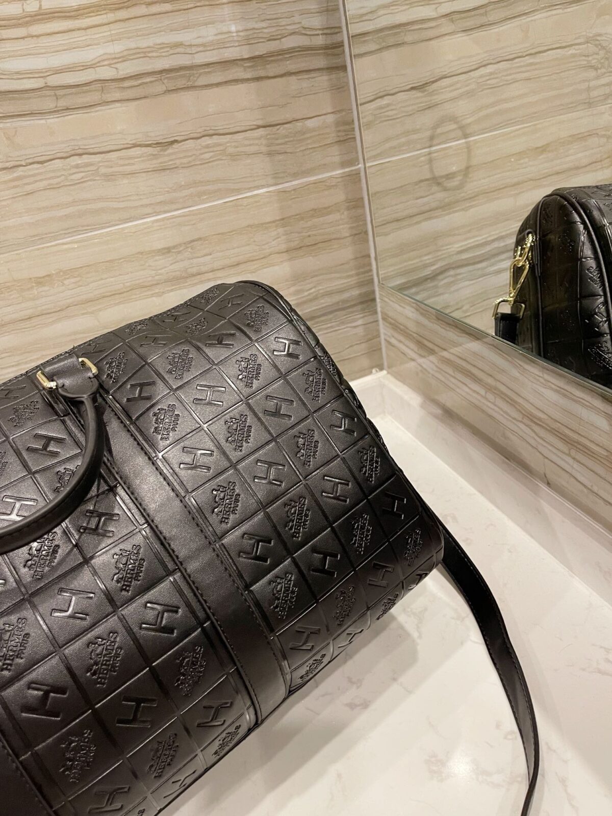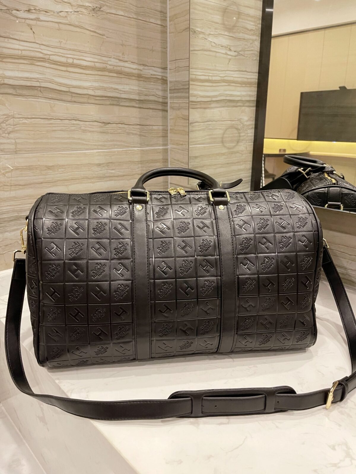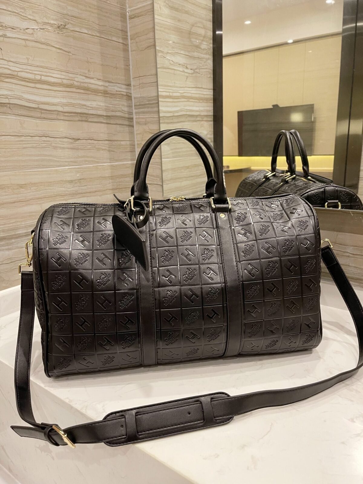 标志性压纹:饰有品牌标志性的网格状“H”字样及Logo压纹,呈现出极具质感与立体感的视觉效果。