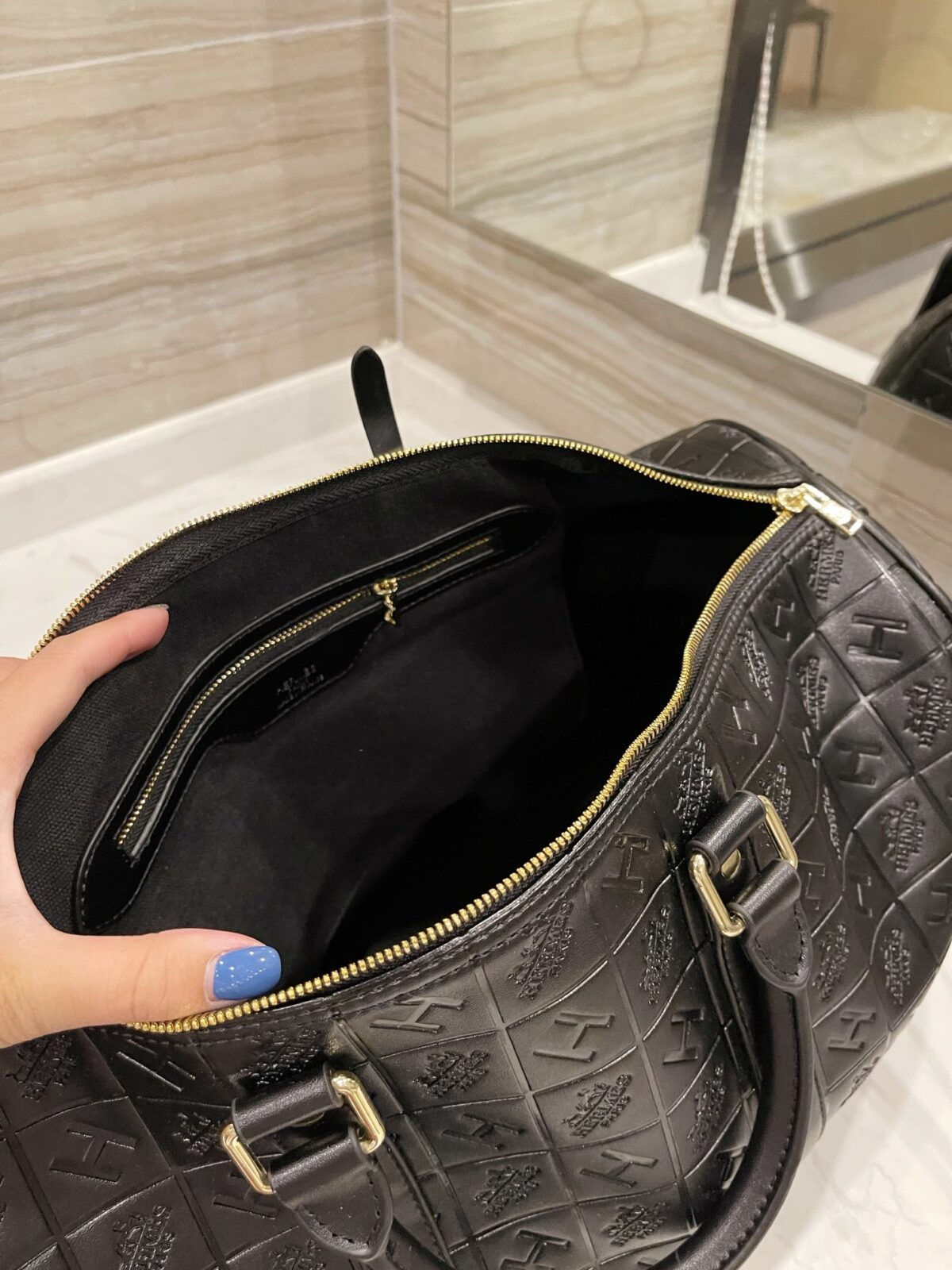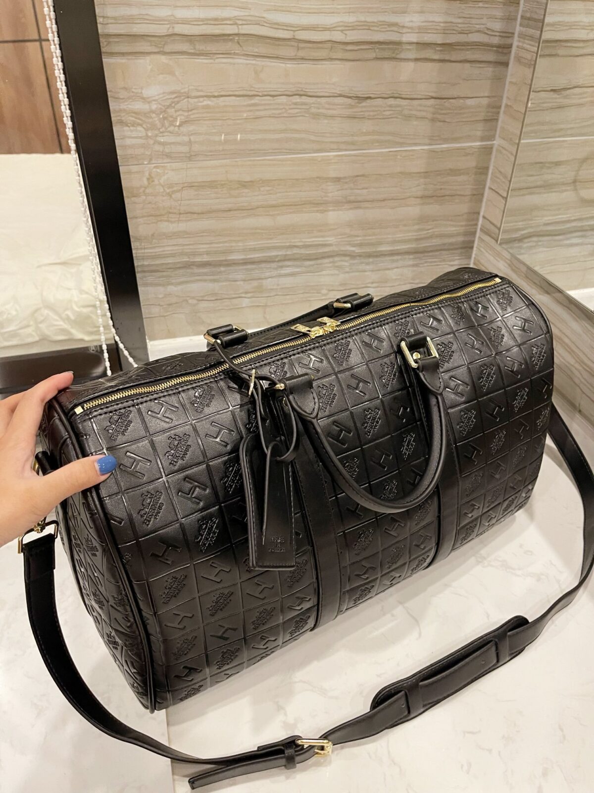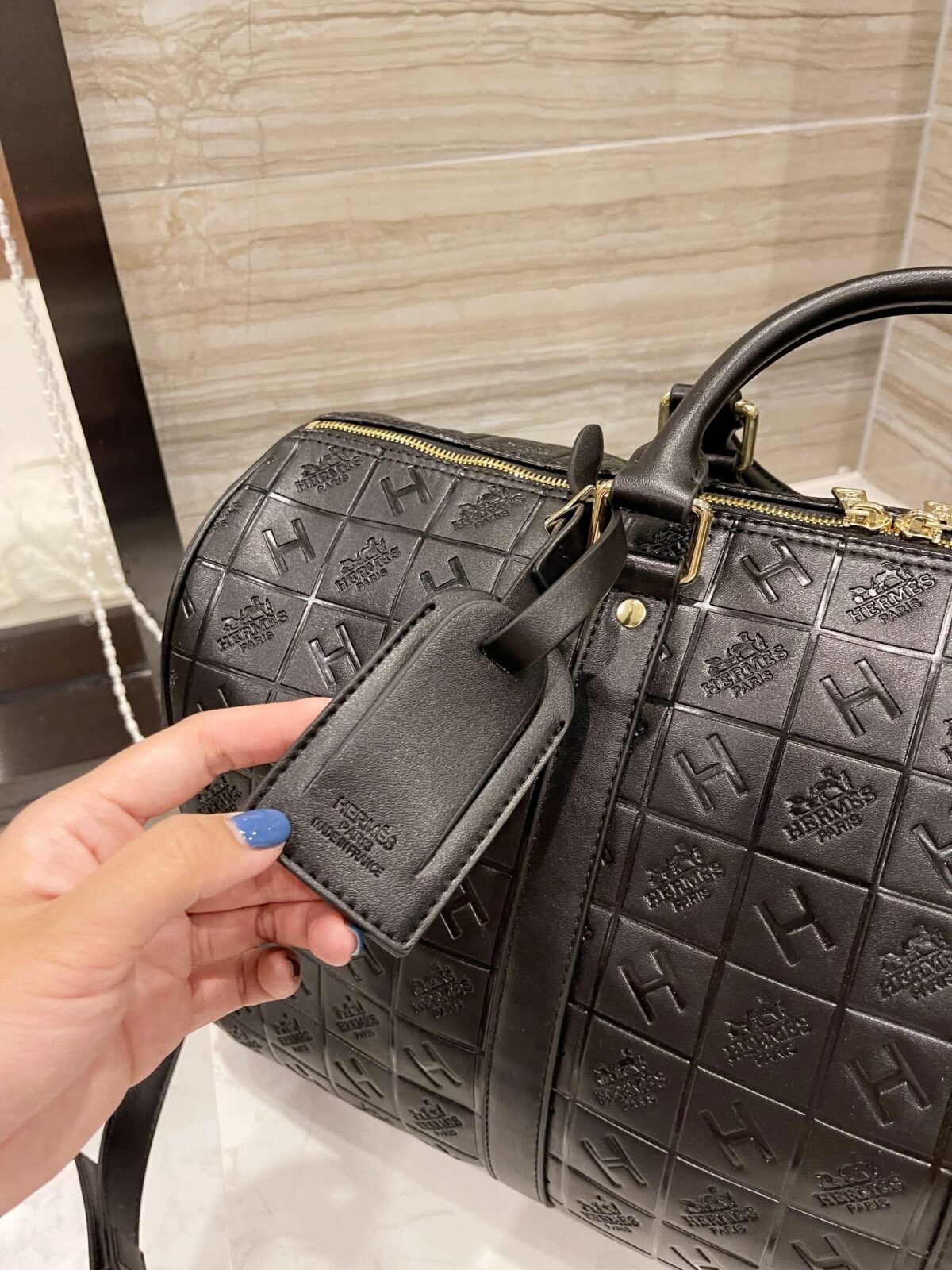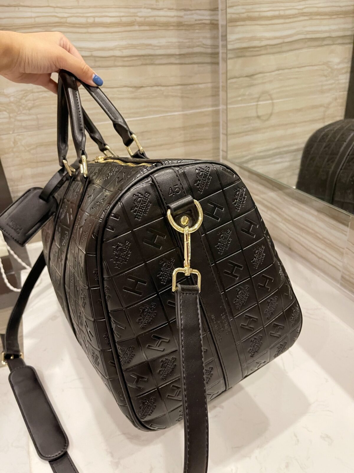 标志性压纹:饰有品牌标志性的网格状“H”字样及Logo压纹,呈现出极具质感与立体感的视觉效果。